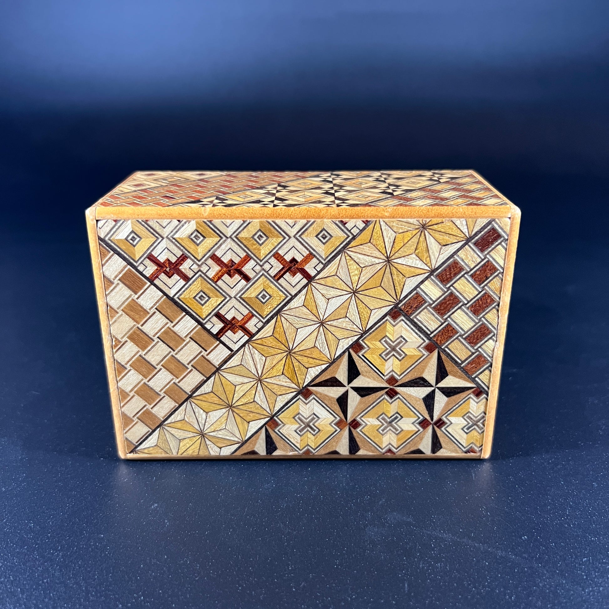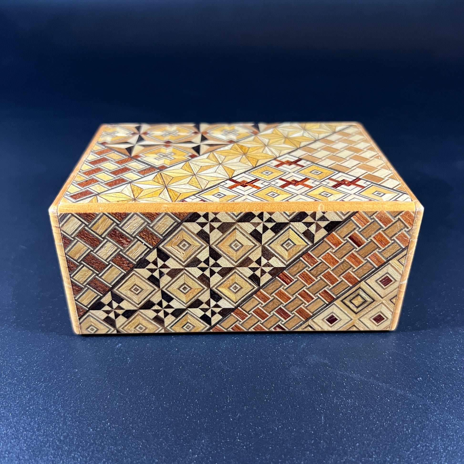 This vintage Japanese wooden puzzle box is a beautifully crafted piece, known for its intricate design and clever hidden compartment. The box is in excellent condition, showcasing fine craftsmanship and smooth functionality. It measures approximately 2 inches high, 4.5 inches wide, and 3.25 inches deep. A wonderful addition to any puzzle collection or as a unique decorative item.