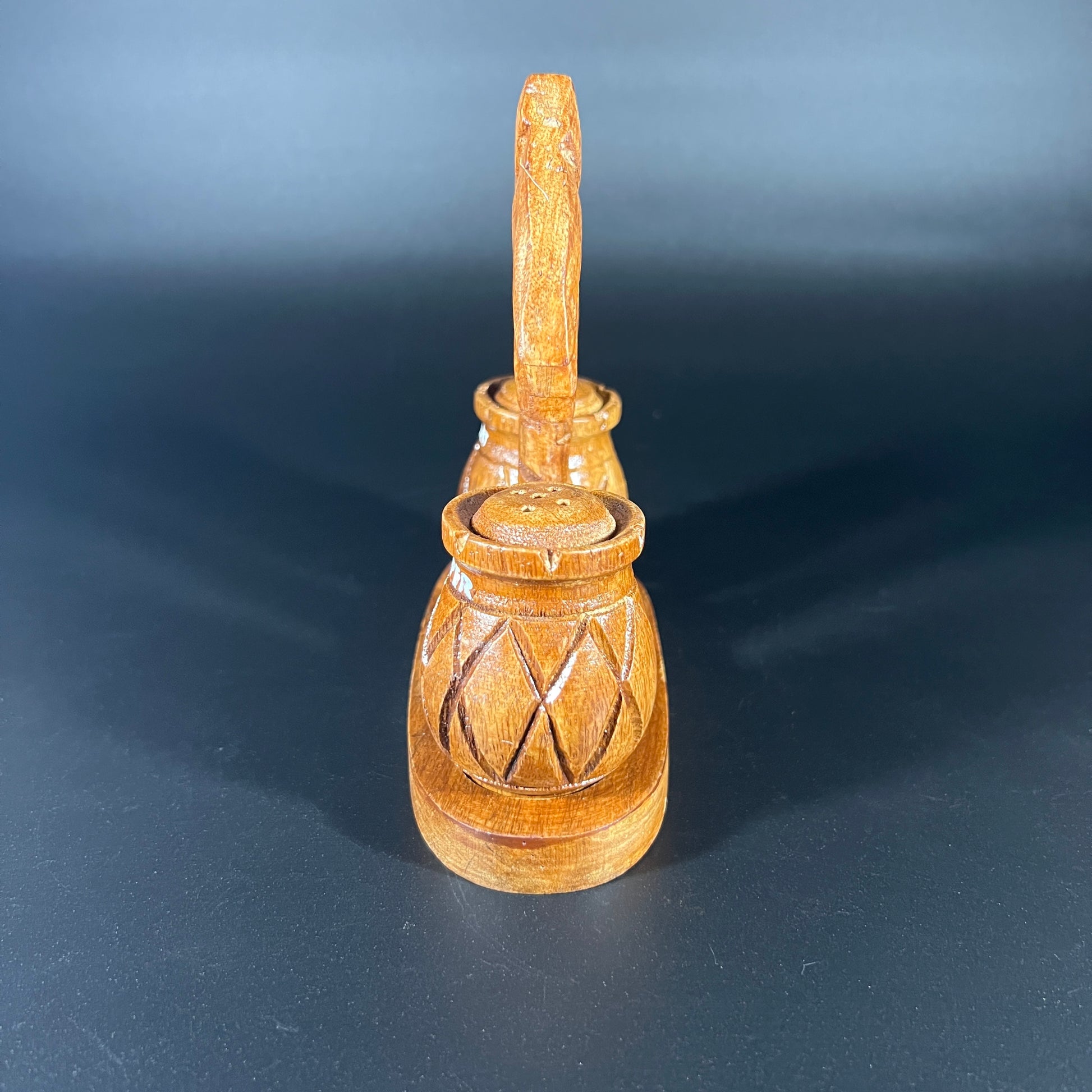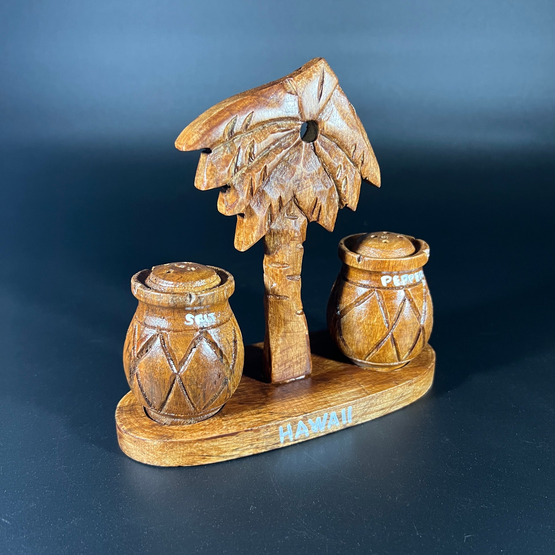These 1960s Hawaii Salt & Pepper Shakers make a fun and kitschy addition to any tiki bar. Unused and in excellent vintage condition, they feature a charming tropical design. The set measures 6.25" high, 6.5" wide, and 2.75" deep, with each shaker measuring 2.75" high and 2" in diameter. Perfect for collectors or anyone looking to add a touch of retro Hawaiian flair!