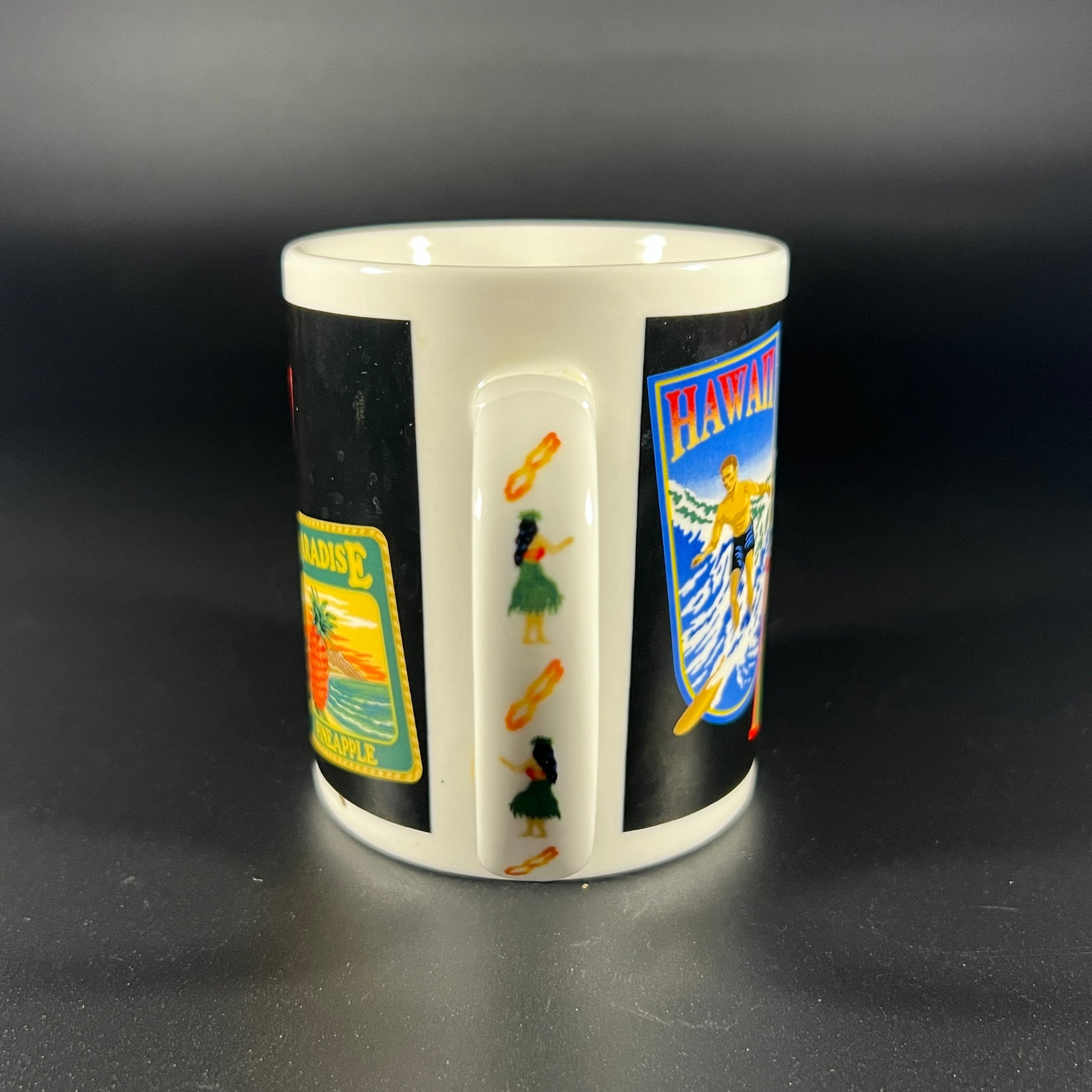 Vintage Hawaiian souvenir travel labels mug, decorated with vibrant travel sticker-style designs from across the Hawaiian Islands. This unique piece also features a charming hula dancer on the handle and another tucked just inside the rim, adding a playful island touch.