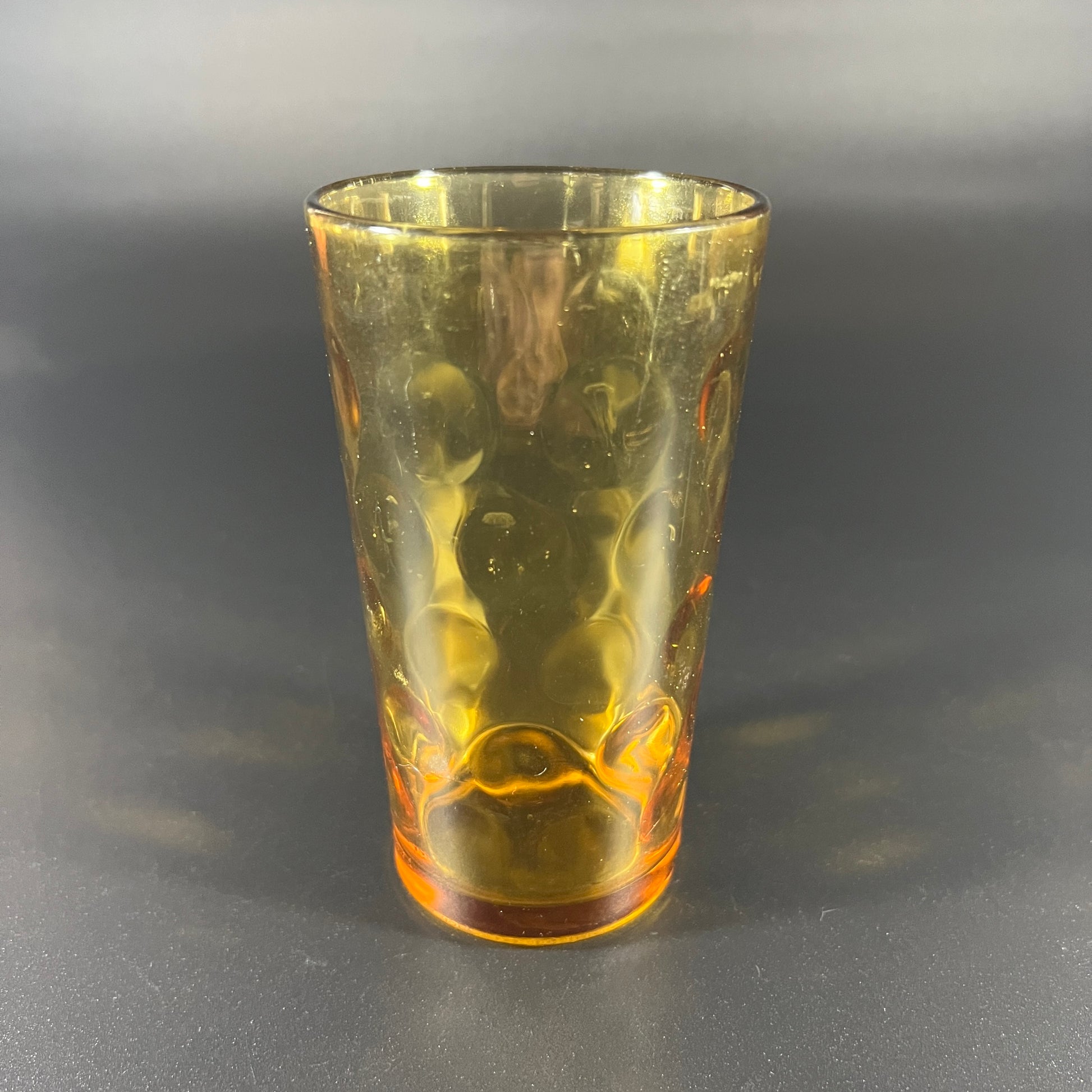 This Hazel Atlas El Dorado gold tumbler is in good vintage condition, featuring the iconic gold bubble detailing. It measures approximately 5.5 inches in height and 3 inches in diameter, making it a stylish and functional piece for your glassware collection.