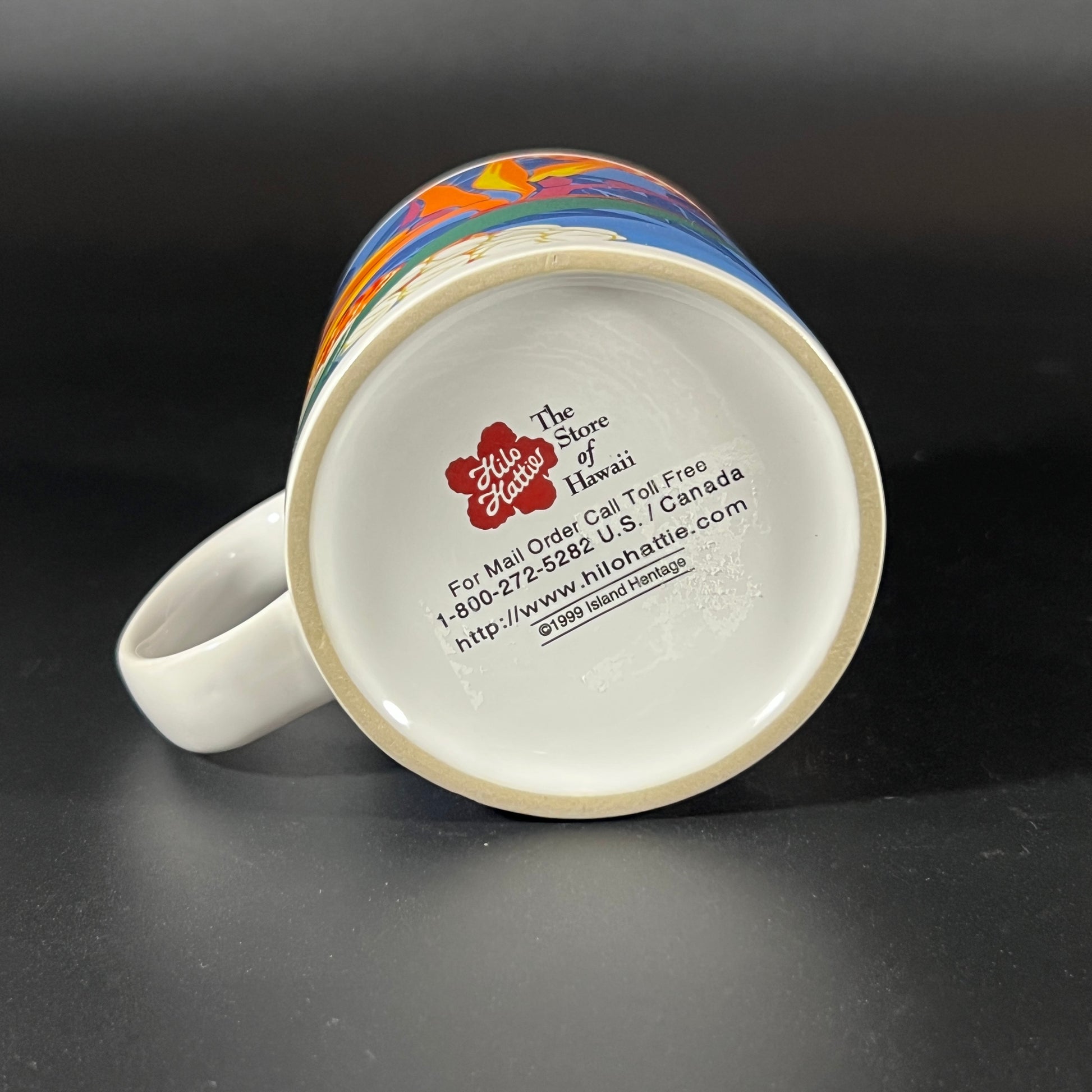 This 1999 Hilo Hattie Bird of Paradise mug is a charming souvenir from "The Store of Hawaii." In excellent vintage condition, it captures the vibrant spirit of the islands. The mug measures approximately 3.75" H x 4.75" W (with handle) x 3" opening, making it a perfect addition to any collection or as a keepsake from Hawaii.