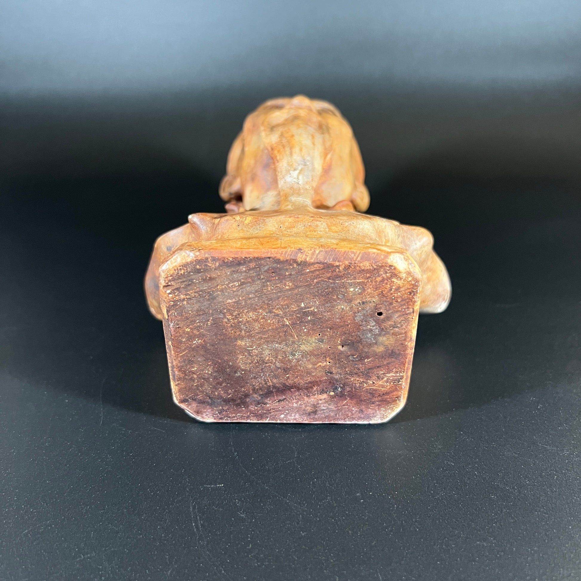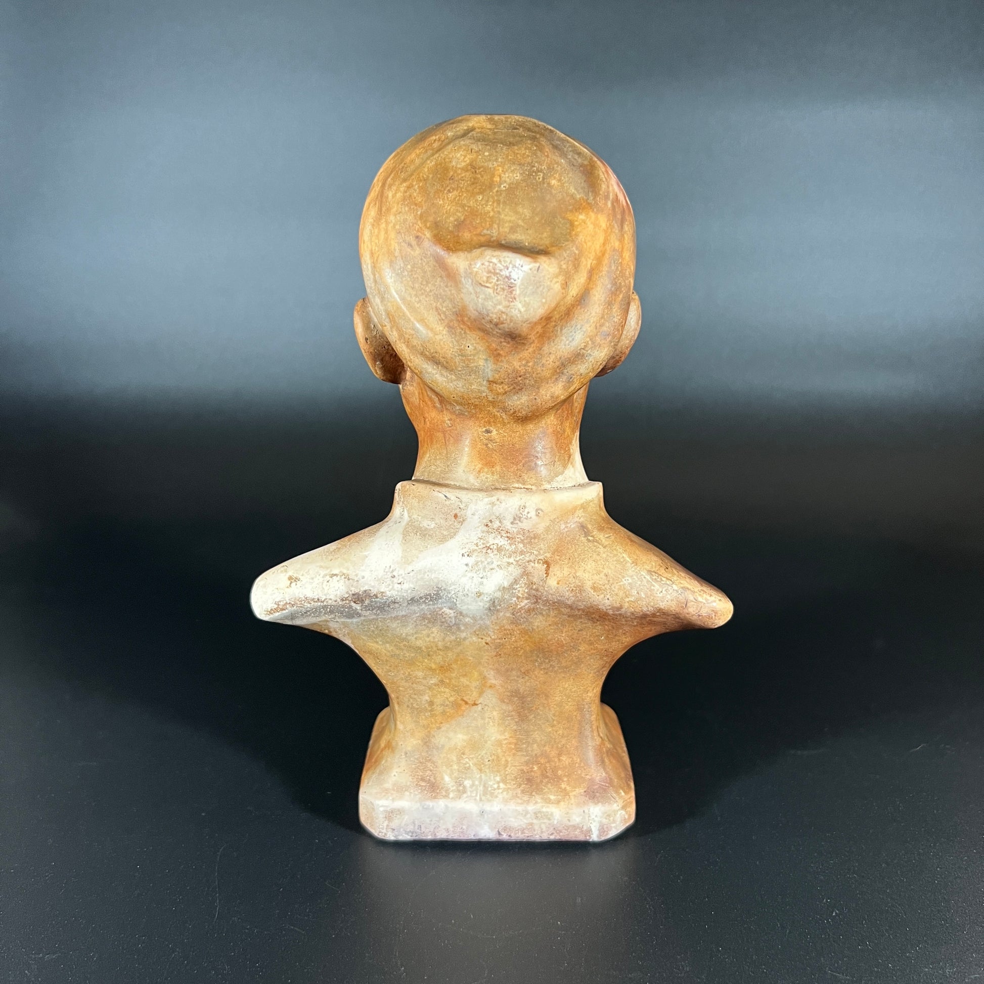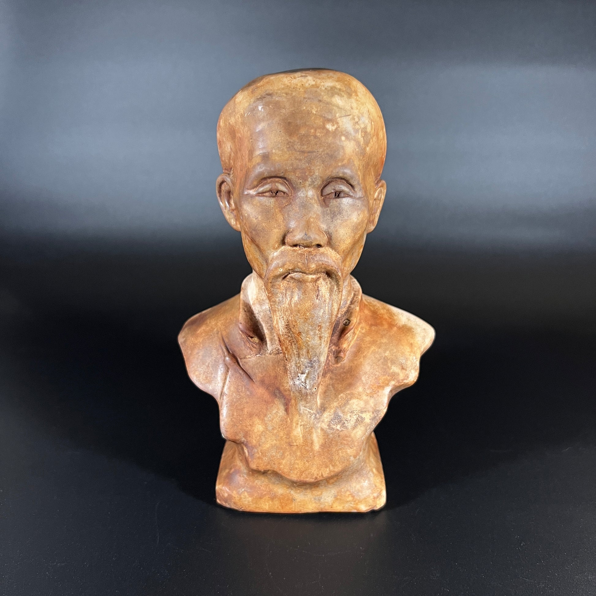 This vintage bust of Ho Chi Minh, the President of North Vietnam from 1945 to 1969, commemorates the leader's legacy. Born May 19, 1890, and passing on September 2, 1969, at the age of 79, this statue likely originated from a plaster mold, with some form of man-made or possibly liquid clay poured into it. The color is a mix of lighter brown shades with darker accents, giving it a distinctive, aged look. The bust shows chips, slight discoloration, flaking, mold imperfections, and general wear consistent with its age—please refer to the photos for more details. It measures approximately 7.75 inches in height, 5.25 inches in width, and 4 inches in depth, making it a unique historical piece for any collection.
