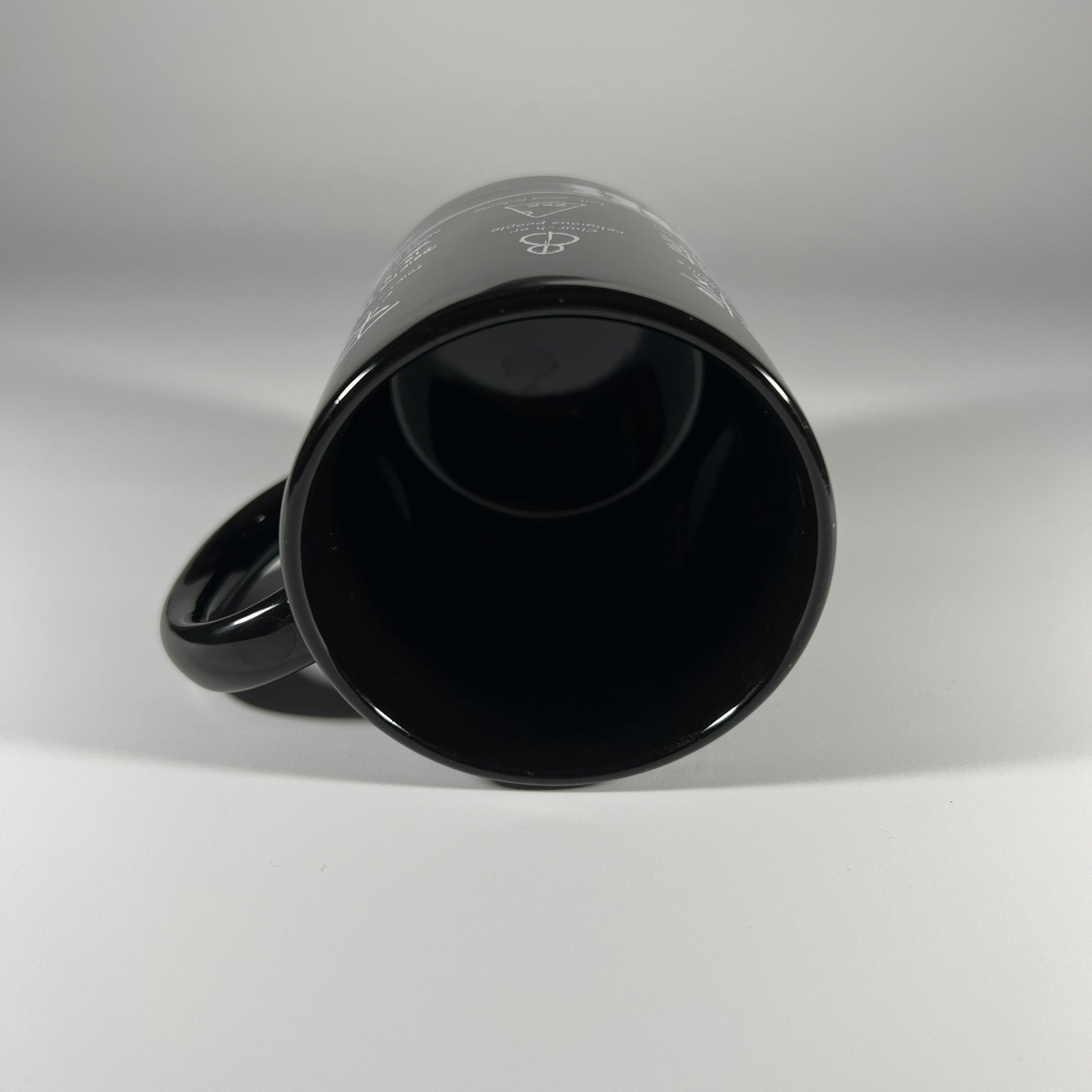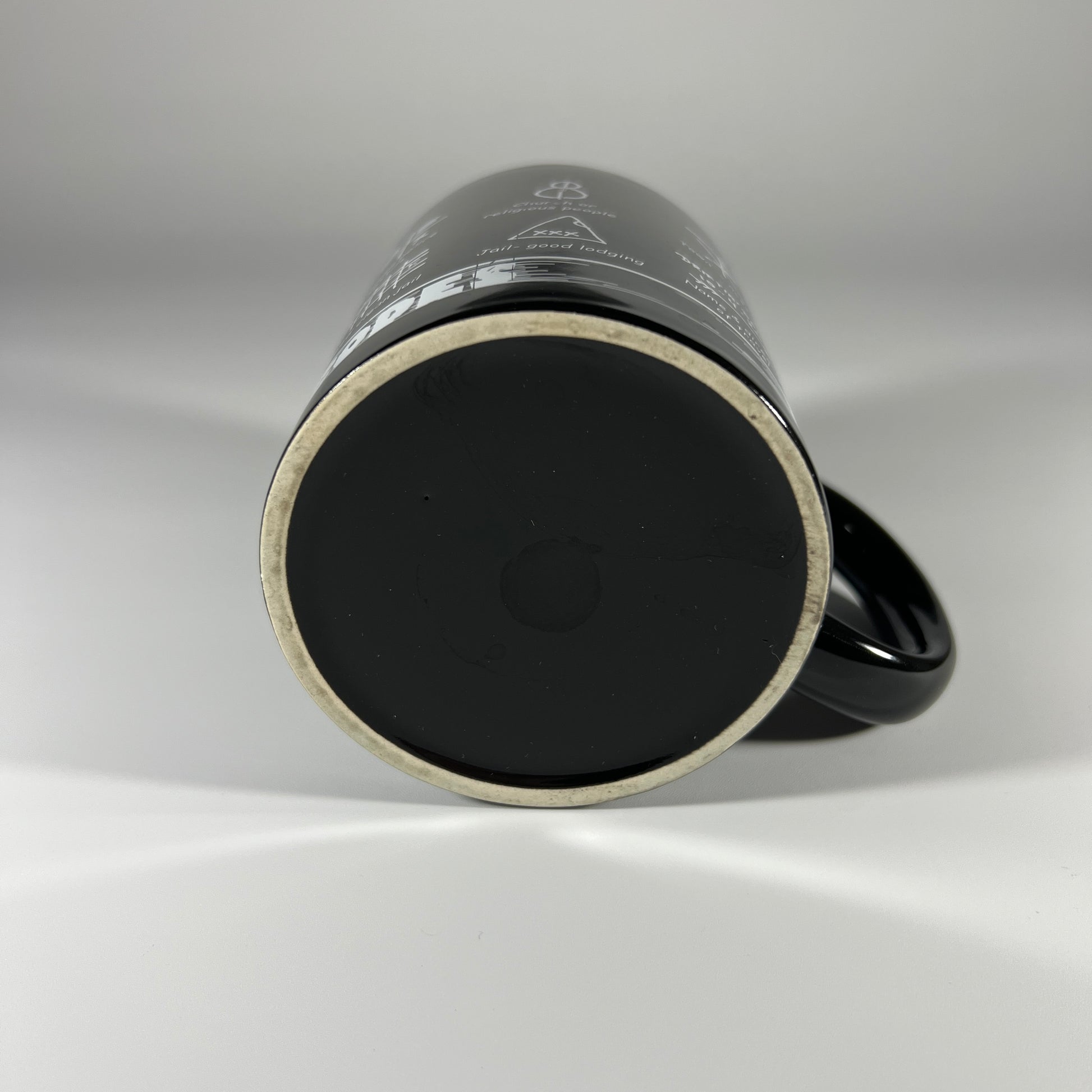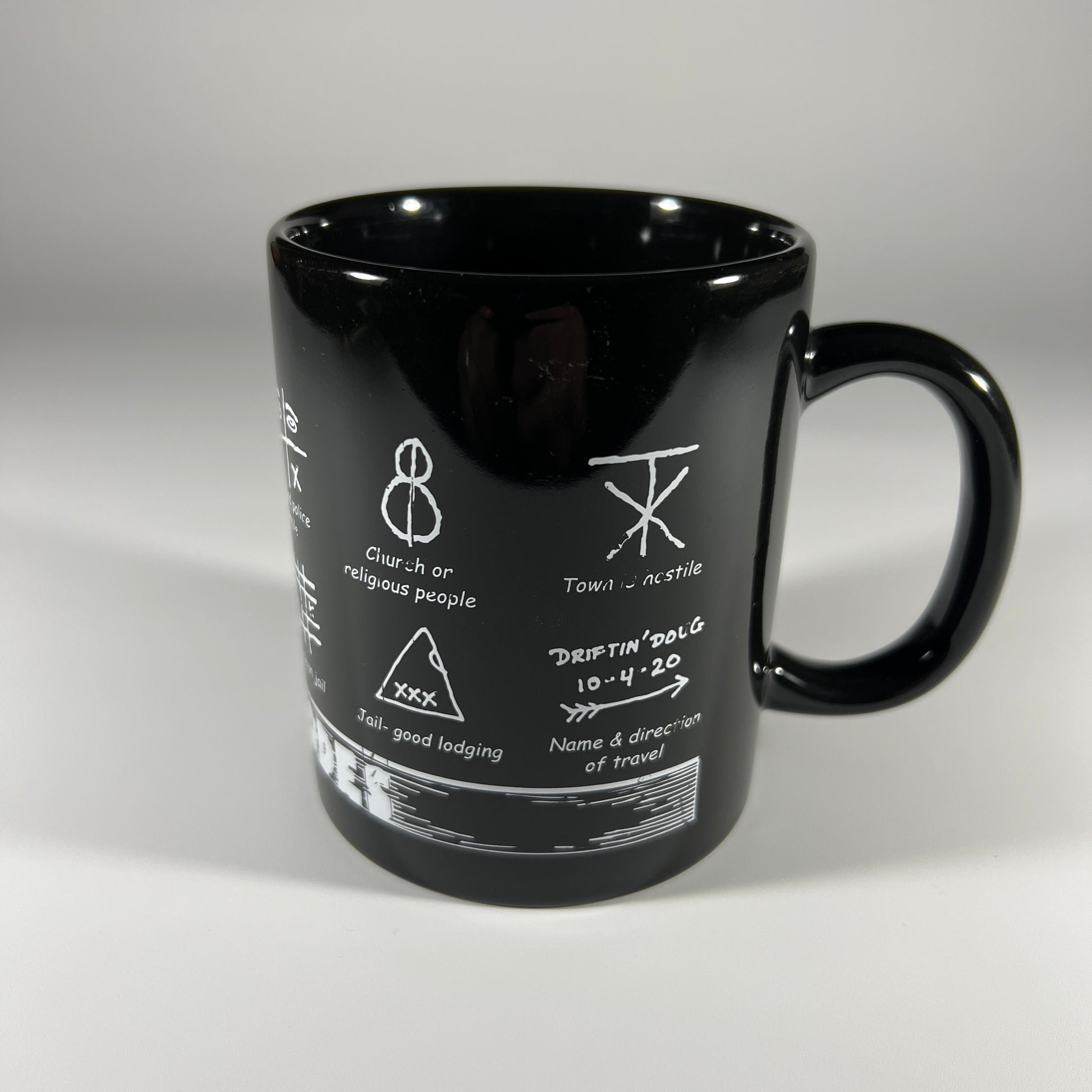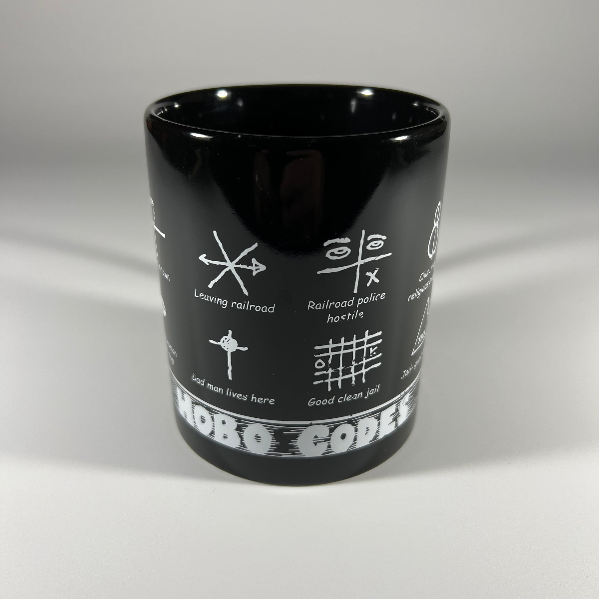 This black and white "Hobo Codes" mug is a perfect gift for the traveler, wanderer, or train enthusiast in your life. Featuring symbols used by drifters during the Depression era and beyond, it reflects a fascinating chapter in American history when travelers relied on the U.S. train system to cross the country. A unique and meaningful piece, this mug measures about 3.75" tall and 3.25" across at the base, expanding to 4.75" across with the handle. Its dimensions are approximately 4" H x 5" W (with handle) x 3.25" opening.
