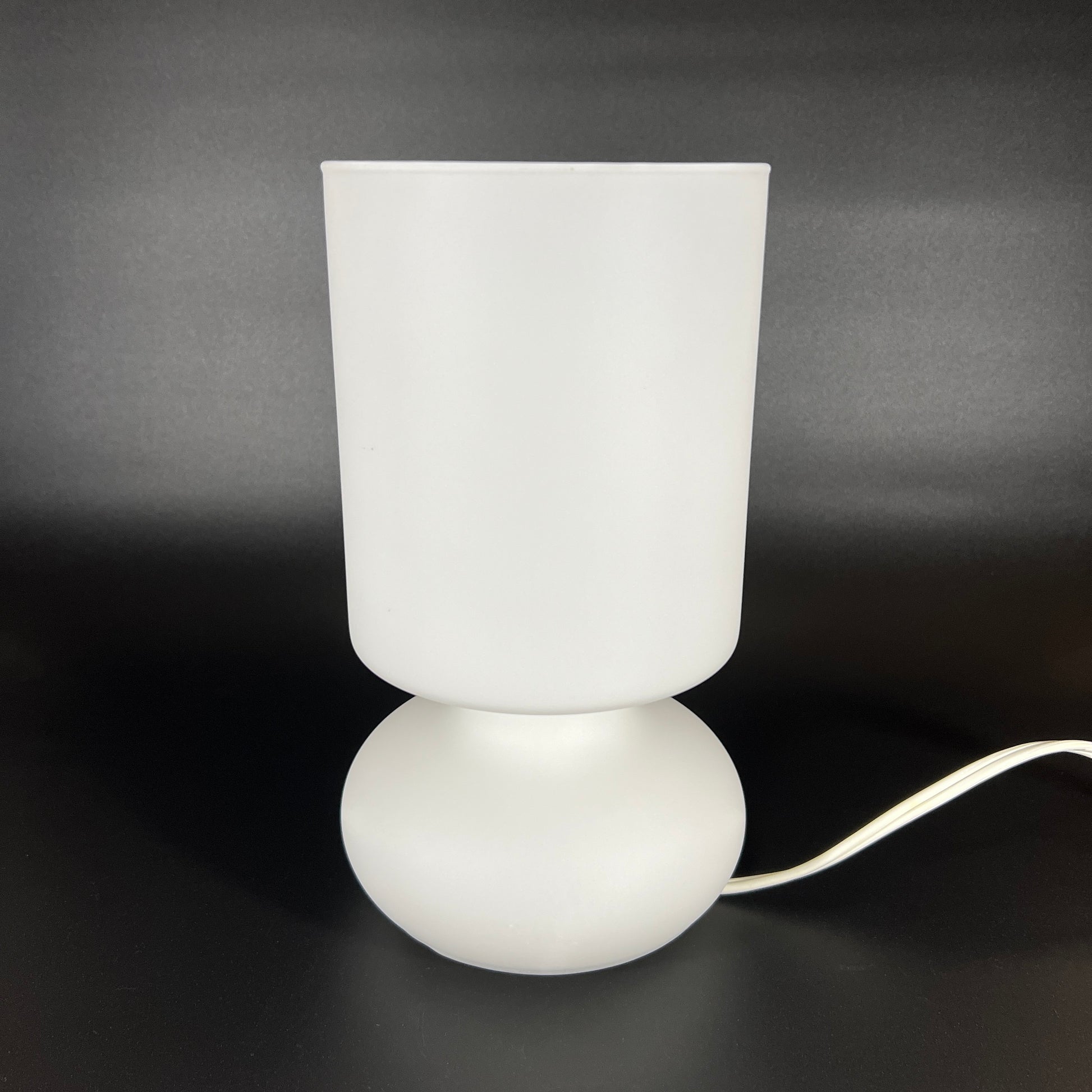 Vintage Ikea Lykta Table Lamp, iconic frosted white design from the 1980s. This minimalist lamp is in good vintage condition, showcasing the timeless simplicity Ikea is known for. Please note, it is being sold without a lightbulb. The lamp measures approximately 9.5 inches in height and 5.5 inches in diameter at the base, making it a perfect addition to any modern or retro-inspired space.