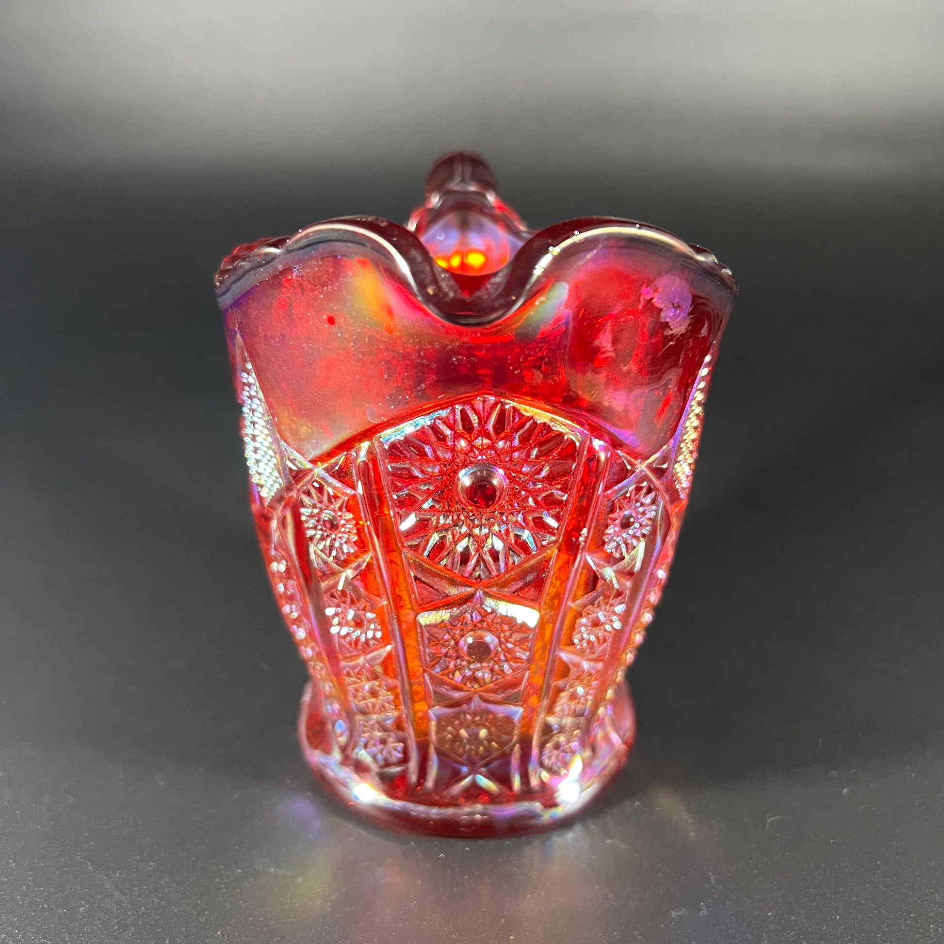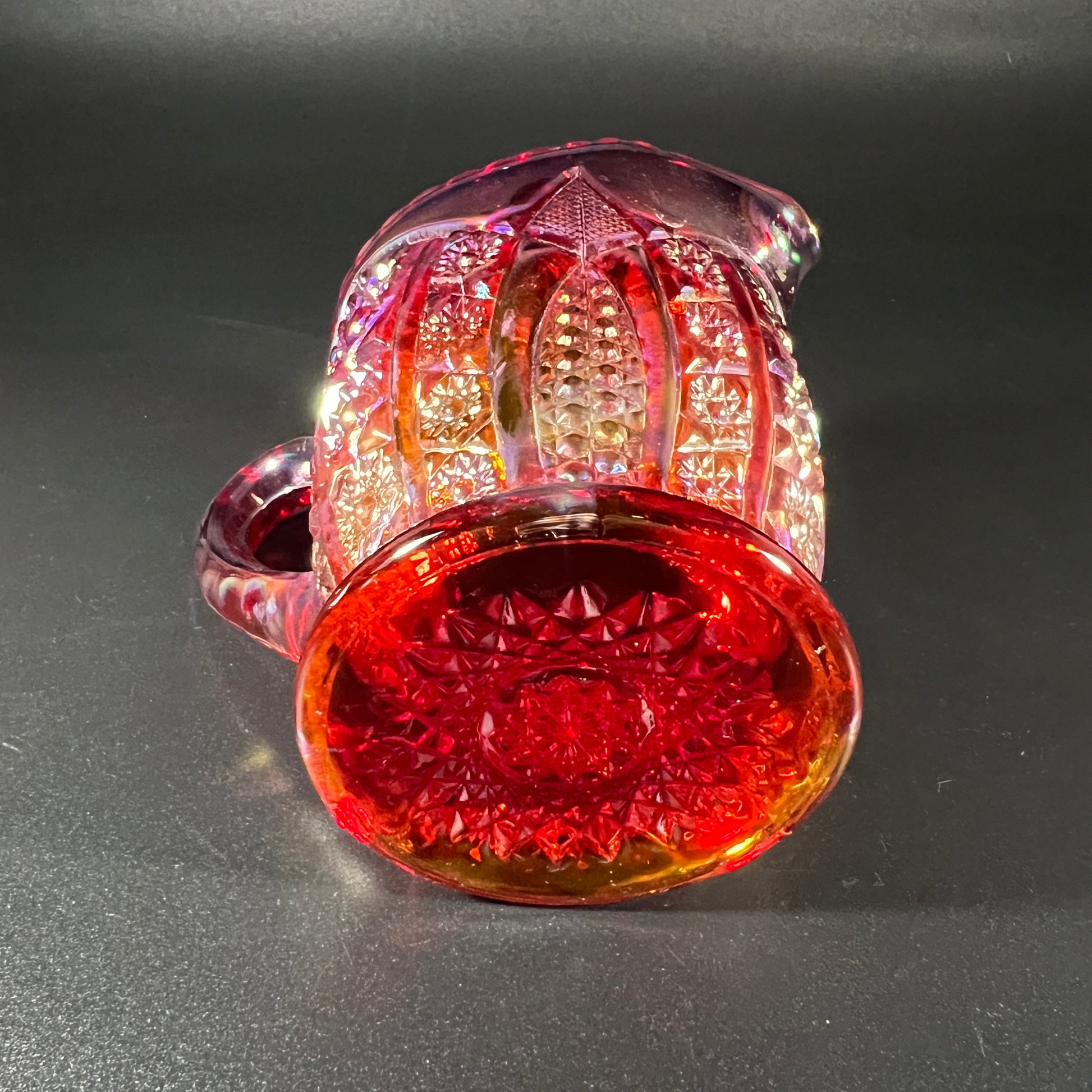 Here is a stunning vintage Indiana red carnival glass cream pitcher in the beautiful Sunset Heirloom pattern, produced in the 1970s. The rich, vibrant carnival colors are absolutely magnificent, making this piece a true standout. It is in good vintage condition with wear consistent with age. Please take a look at the photos for more details. The pitcher measures approximately 4.75" H x 5.75" W (with handle) x 3.75" D.