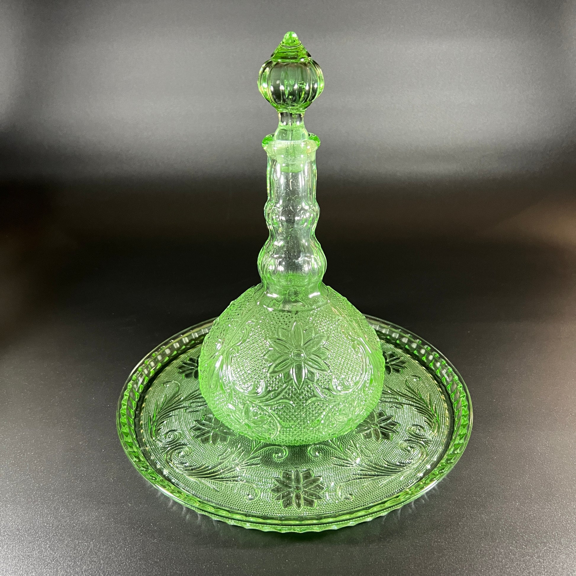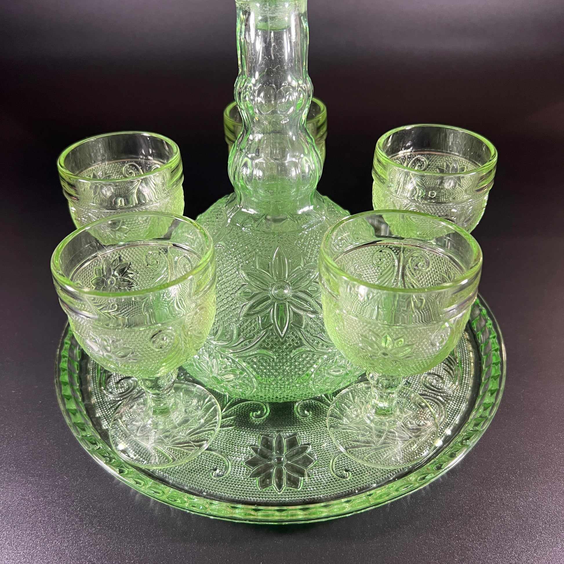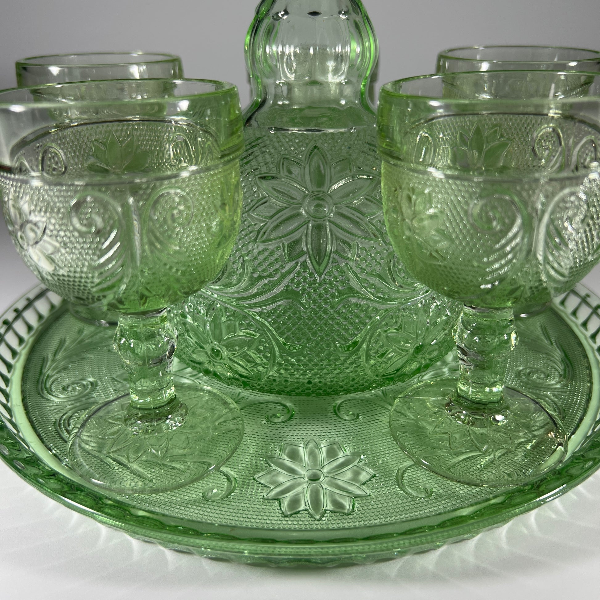 This beautiful 8-piece barware set, crafted by Indiana Glass in the 1970s, features the elegant Tiara Chantilly Green Sandwich Glass pattern. The set includes a decanter with stopper, five wine glasses, and a matching server tray. The decanter stands 10" tall (including the stopper) and measures 5.5" wide, holding 28 fl. oz. The wine glasses are 4.25" tall, 2.5" wide, and each holds 4 fl. oz. The tray measures 10" in diameter. All pieces are in good vintage condition, showcasing the timeless beauty of the Tiara Chantilly Green design. This set is a stunning collectible and a charming addition to any barware collection.