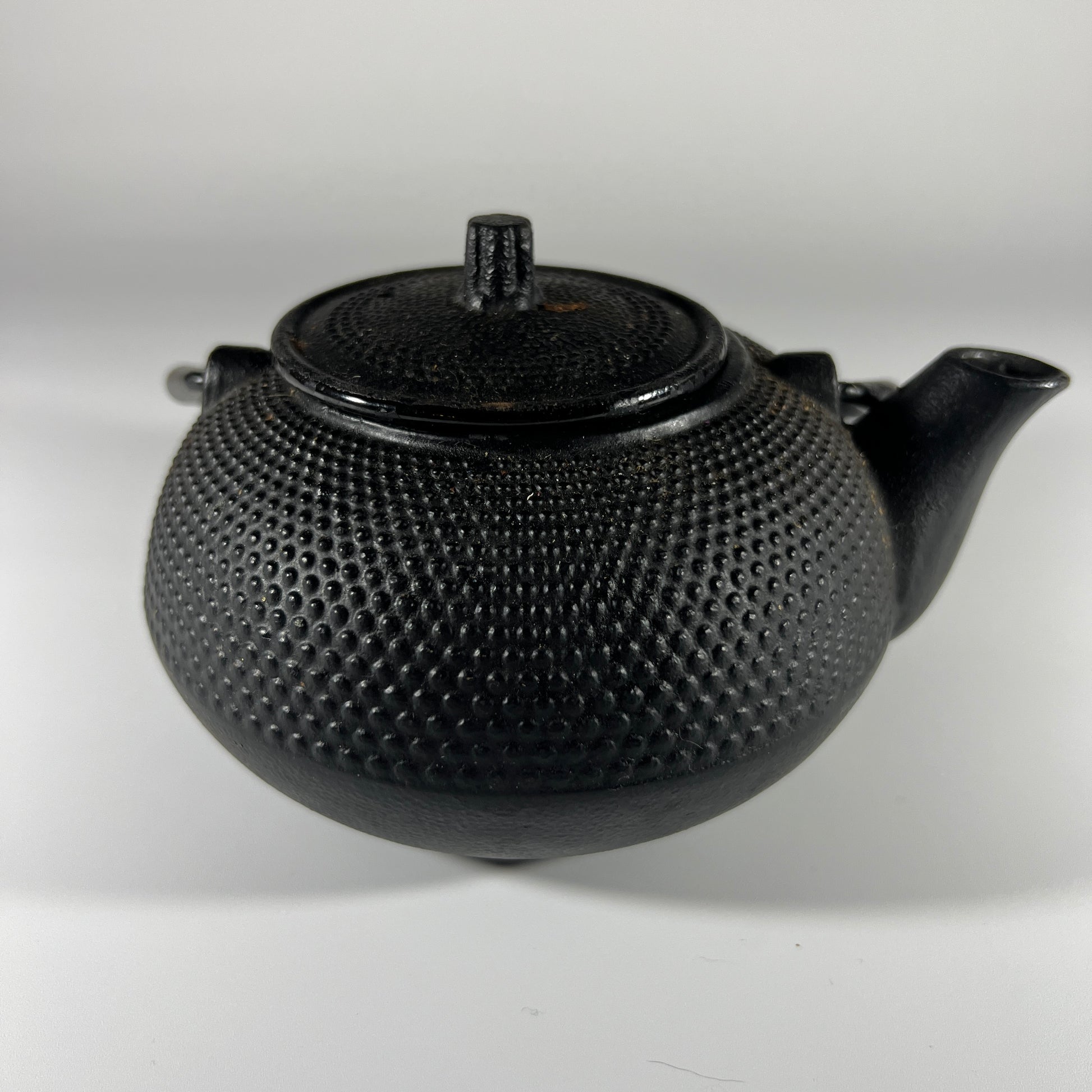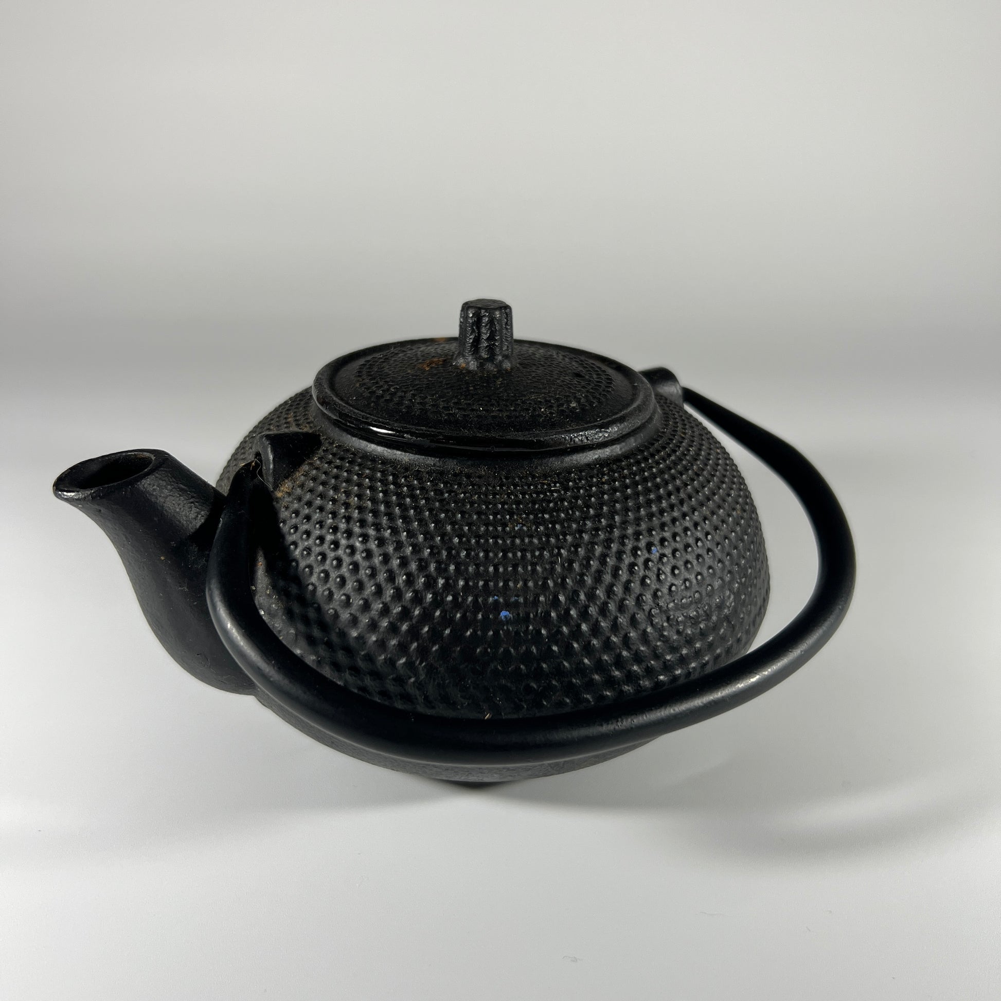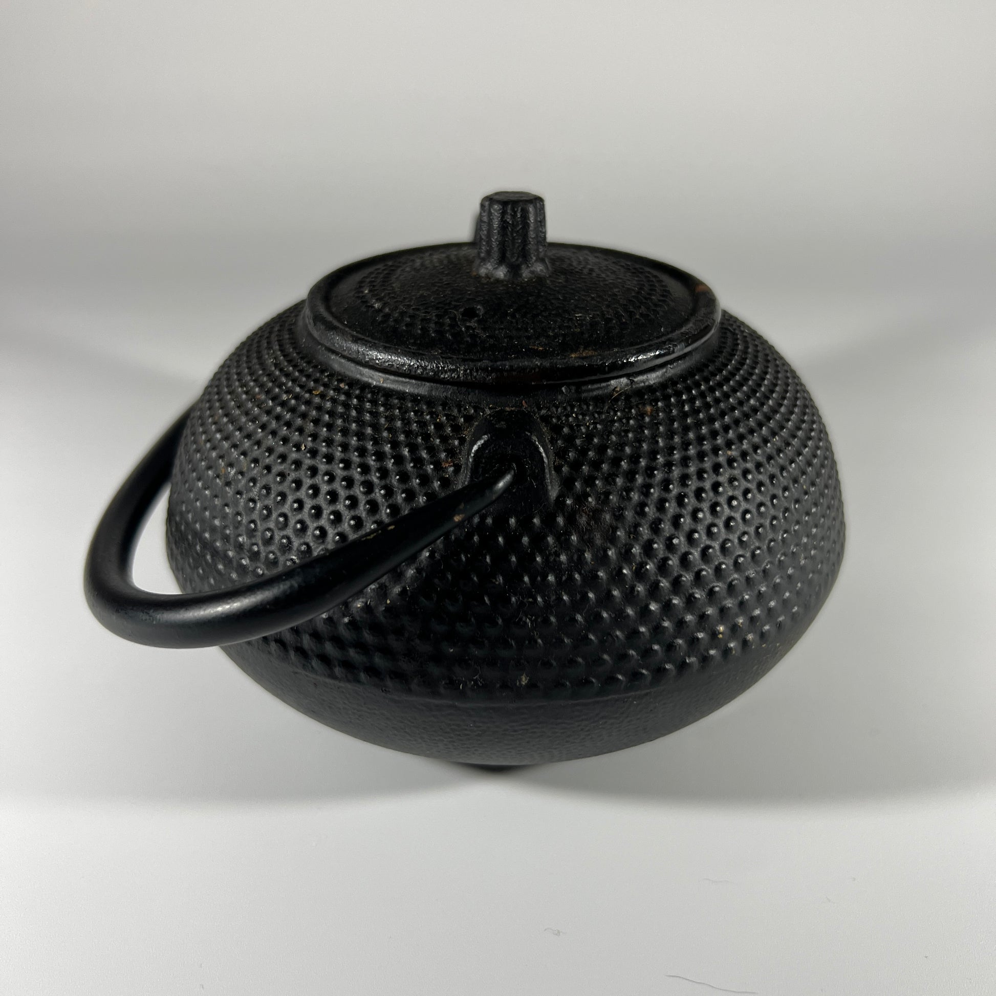 A vintage Japanese cast iron tea set, beautifully crafted with meticulous attention to detail. The timeless design features a sleek, sophisticated aesthetic, while offering exceptional heat retention. The set strikes the perfect balance between captivating beauty and functional comfort. It is in good vintage condition, with minor wear consistent with its age. Please refer to the photos for more detail. The teapot measures approximately 6 inches in height, 5.5 inches in width, and 6.25 inches in depth, while each cup measures 2 inches in height and 3.25 inches in diameter.