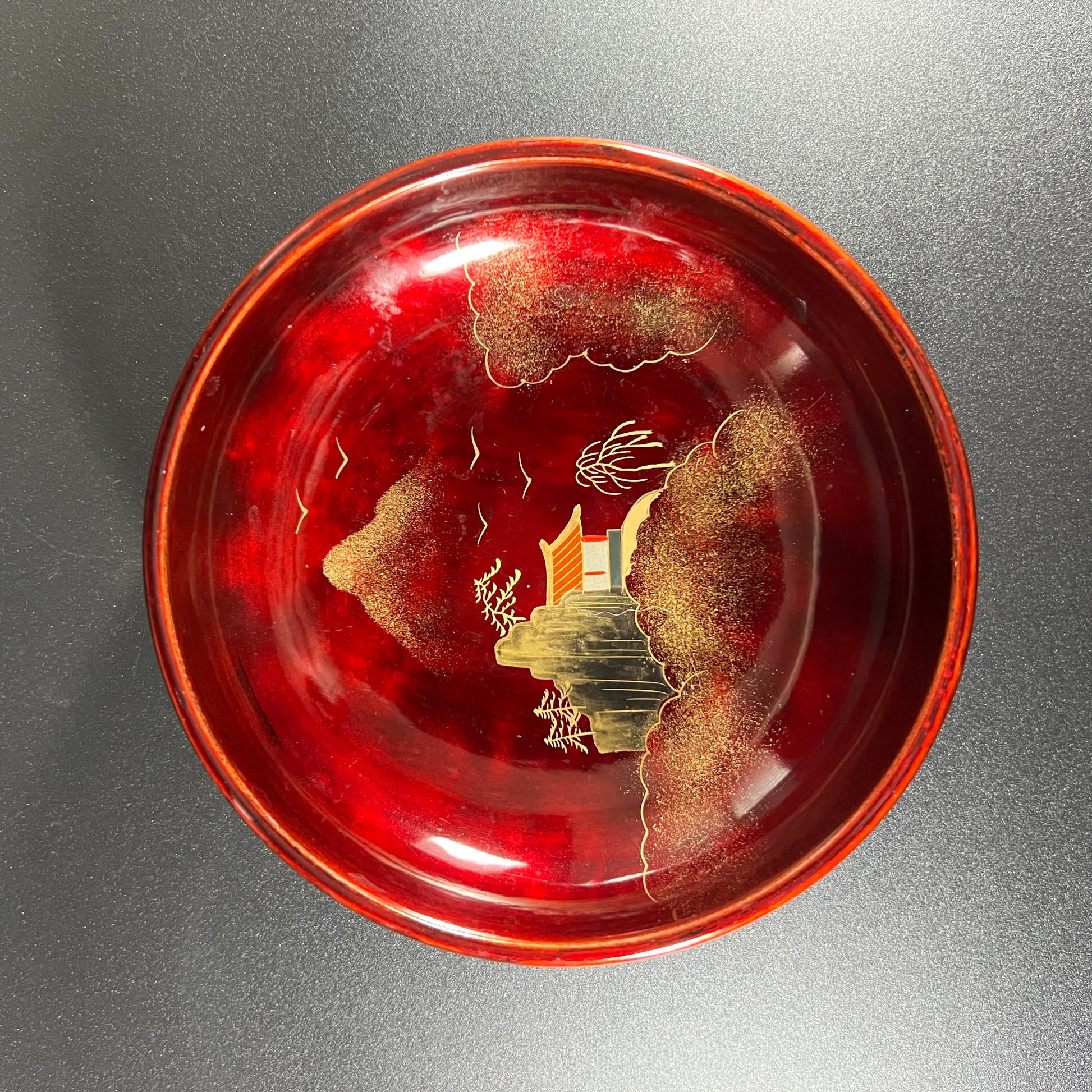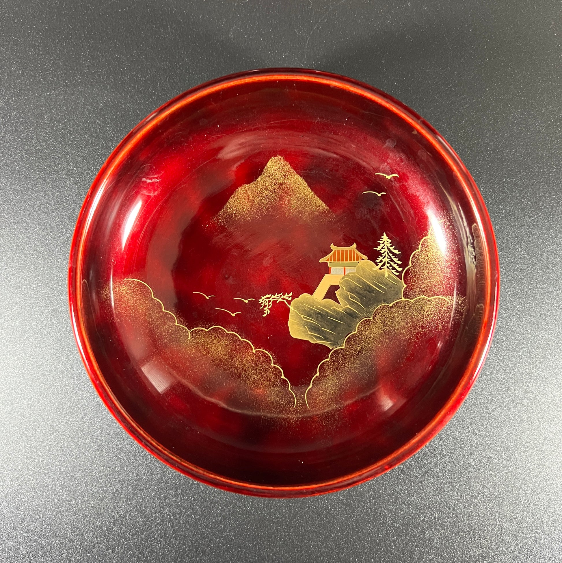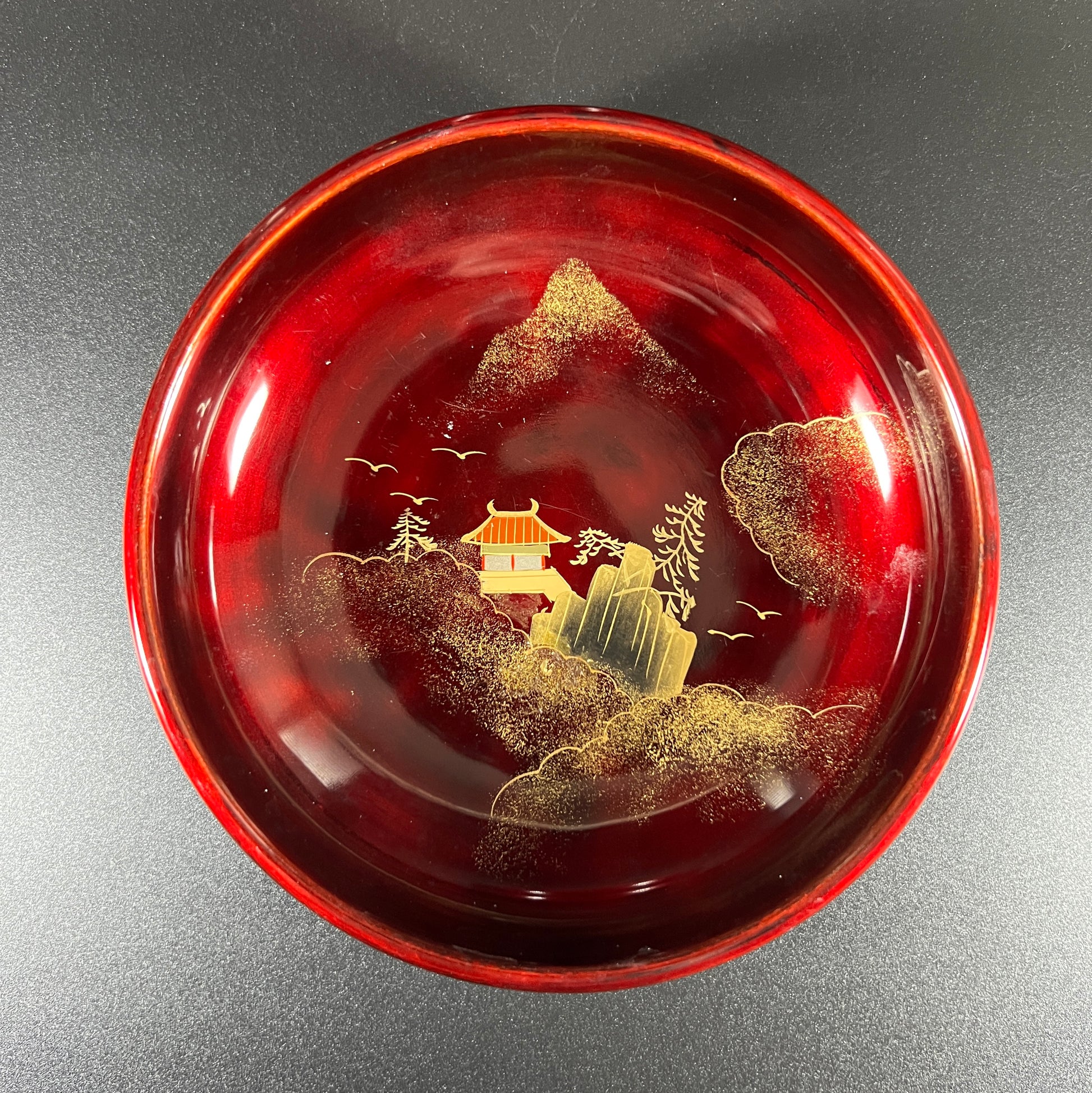 Elevate your dining experience with this stunning 6-piece hand-painted lacquerware serving set, made in Japan. Each piece features intricate, traditional Japanese landscape scenes, beautifully hand-painted in deep maroon red lacquer. The set includes six medium-sized bowls, solidly crafted and ideal for serving soup, rice, or other dishes. The undersides are marked "Made in Japan," adding to their authenticity and charm. In excellent vintage condition with typical wear consistent with age, these bowls exude timeless beauty. Measurements: 5 3/4" diameter, 1 1/2" height. Perfect for adding a touch of elegance to your table setting!