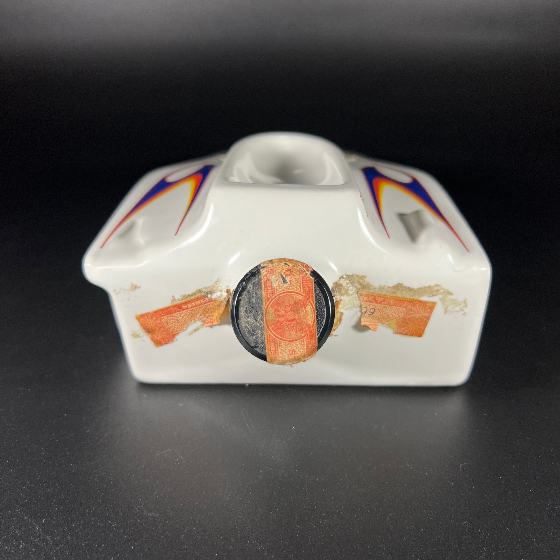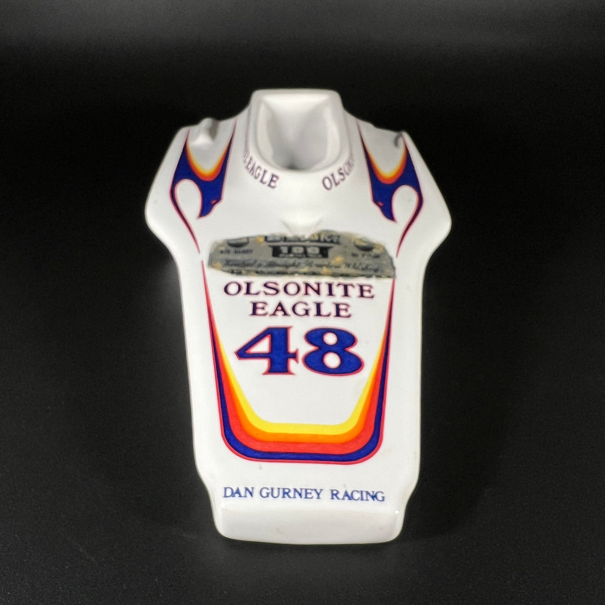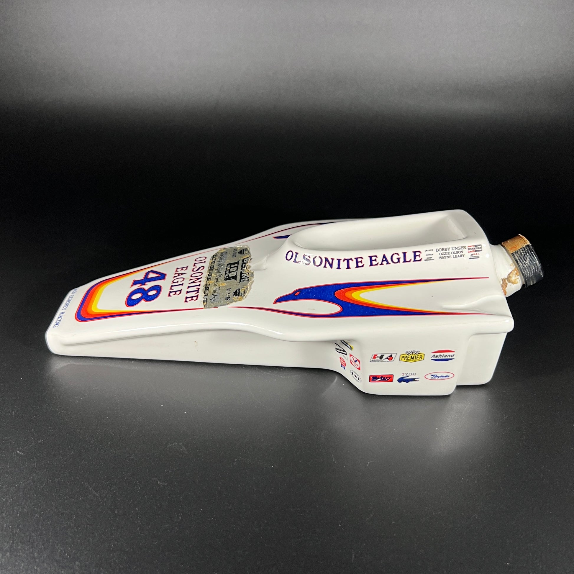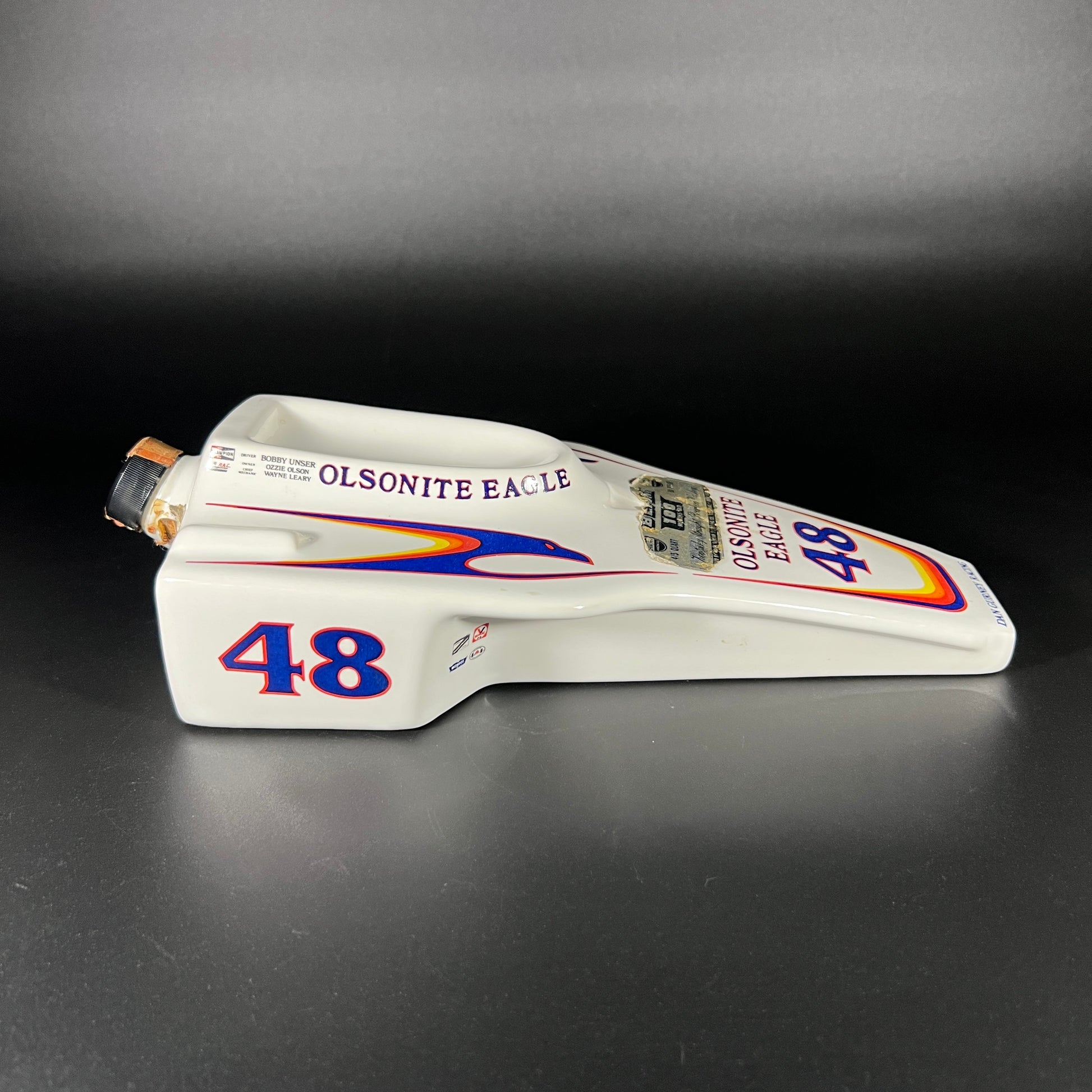 1975 Jim Beam Decanter featuring the Bobby Unser Olsonite Eagle Race Car #48. This collectible decanter is in good vintage condition, showcasing a detailed design of the iconic race car. See photos for more detail. It measures 11.75" long, 5.5" wide, and 3" high, making it a great addition to any racing memorabilia or decanter collection.