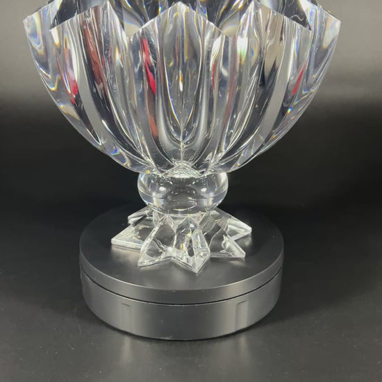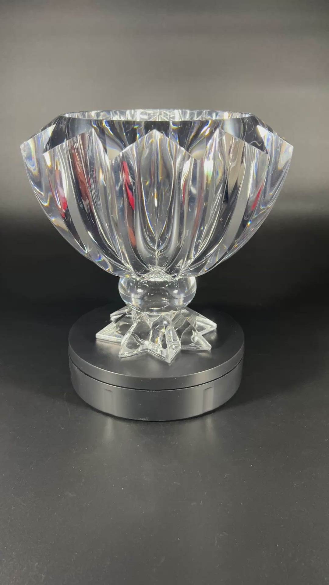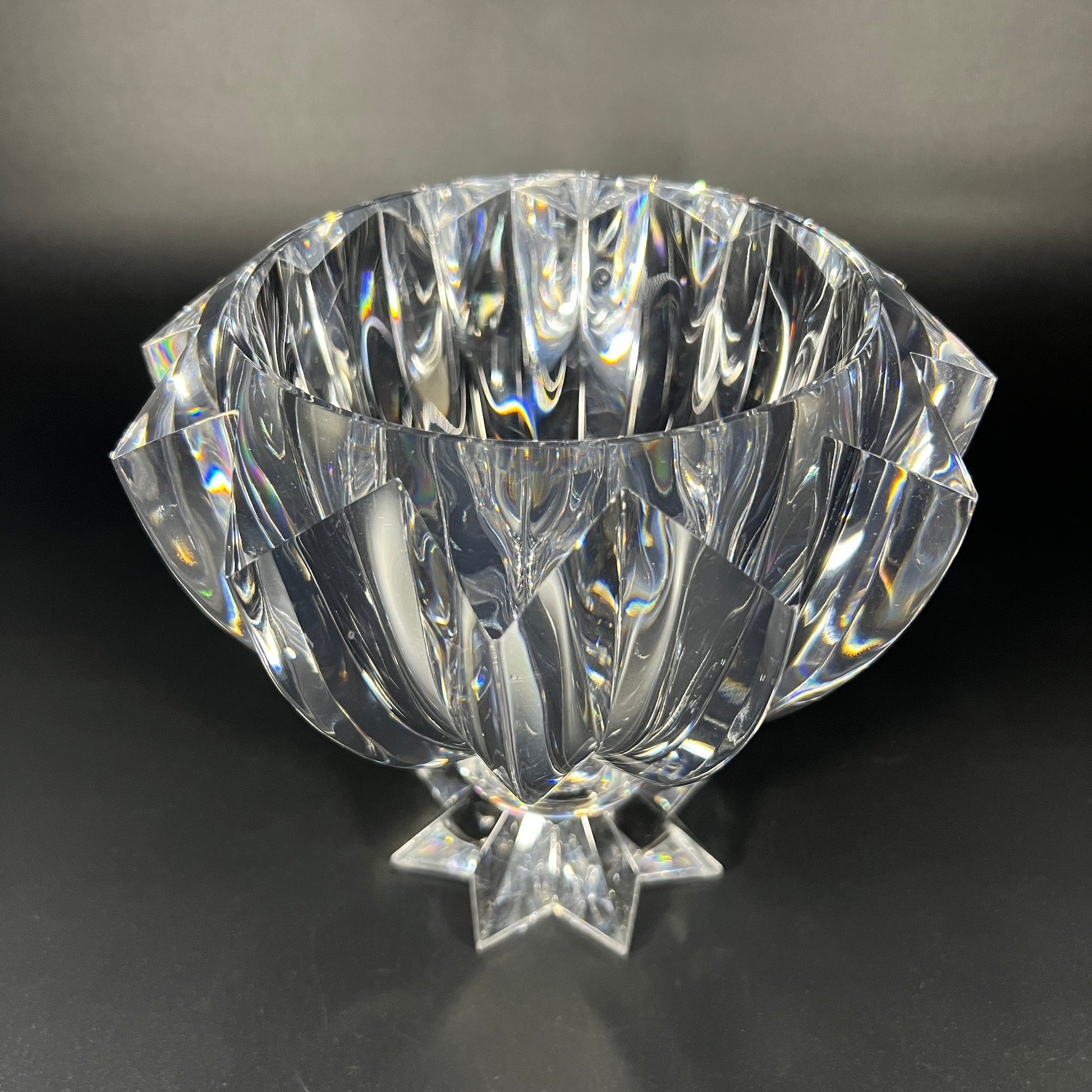 This vintage Grainware Carlisle Lucite pedestal bowl from the Judith Kruger Tiara Collection is an exquisite, rare piece of functional art that will not disappoint. A stunning example of Hollywood Regency style, it dazzles as light catches its intricate design. Made from heavy Lucite, the bowl features cut panels with a tiara-shaped pattern of triangles atop each panel, creating a striking visual effect. The pedestal is beautifully crafted with a knob shape, sitting atop a star-shaped base. In excellent condition, this piece is not only a durable treasure but also a true statement of vintage luxury. It’s a timeless addition to any collection that you’ll cherish for years to come. Please refer to the photos for more details. The item measures approximately 6.75" H x 7.5" in diameter.
