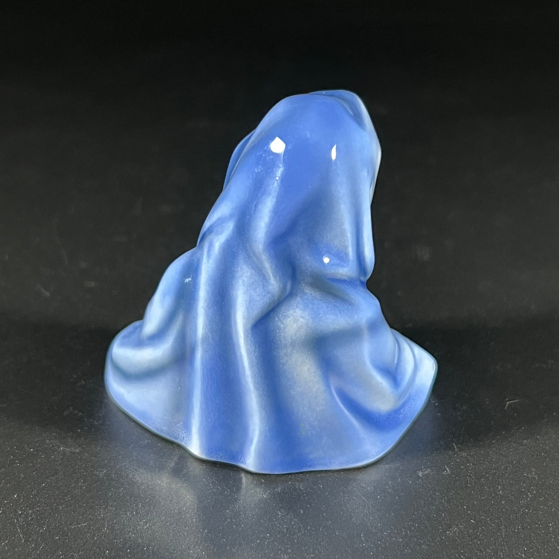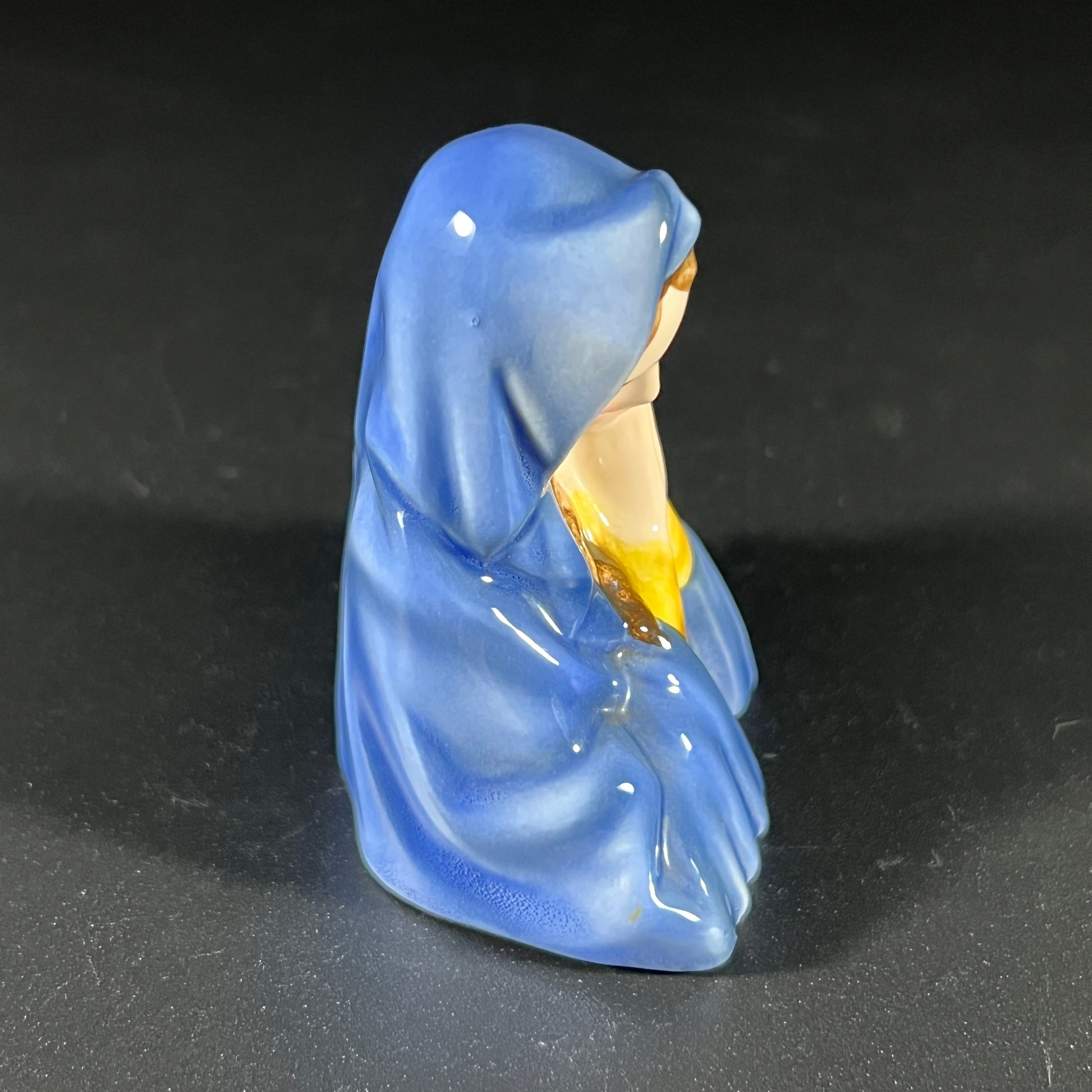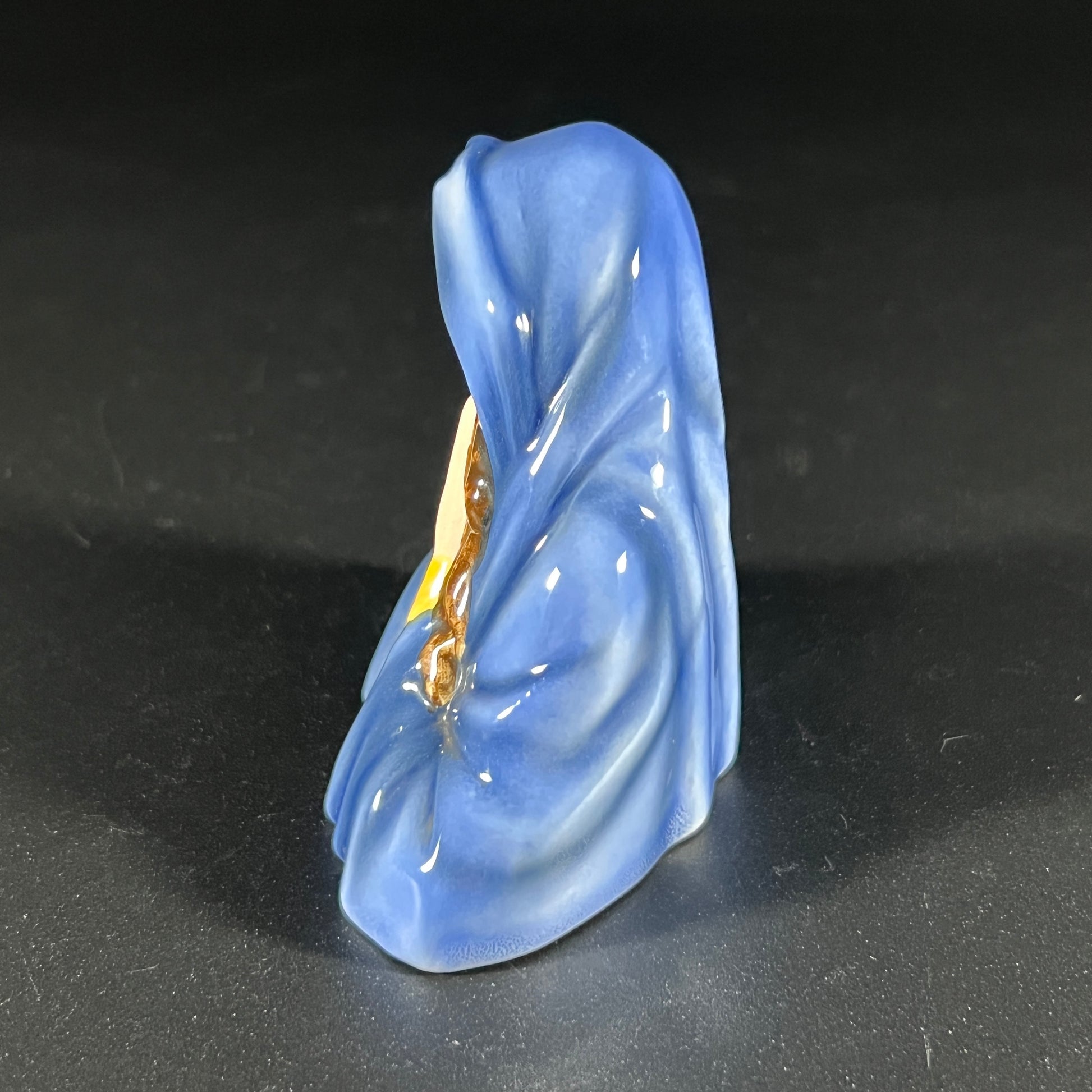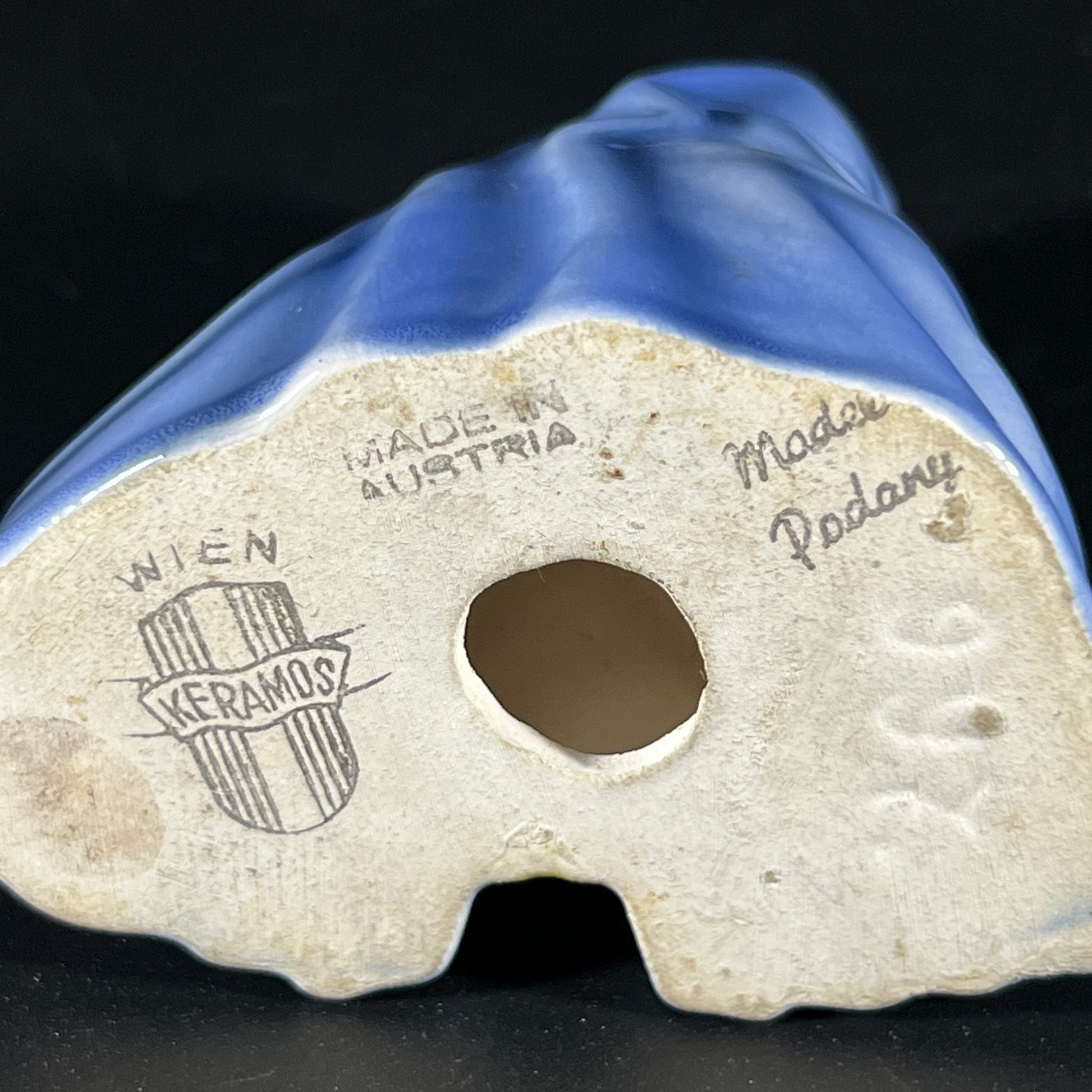 This vintage hand-painted Madonna, draped in a blue cape, is crafted by Wien Keramos of Austria. It is both stamped and signed on the bottom, a mark of its authenticity. In excellent vintage condition, it displays no notable flaws. Please refer to the photos for more details. The figurine measures approximately 3" H x 3" W x 1.75" D.