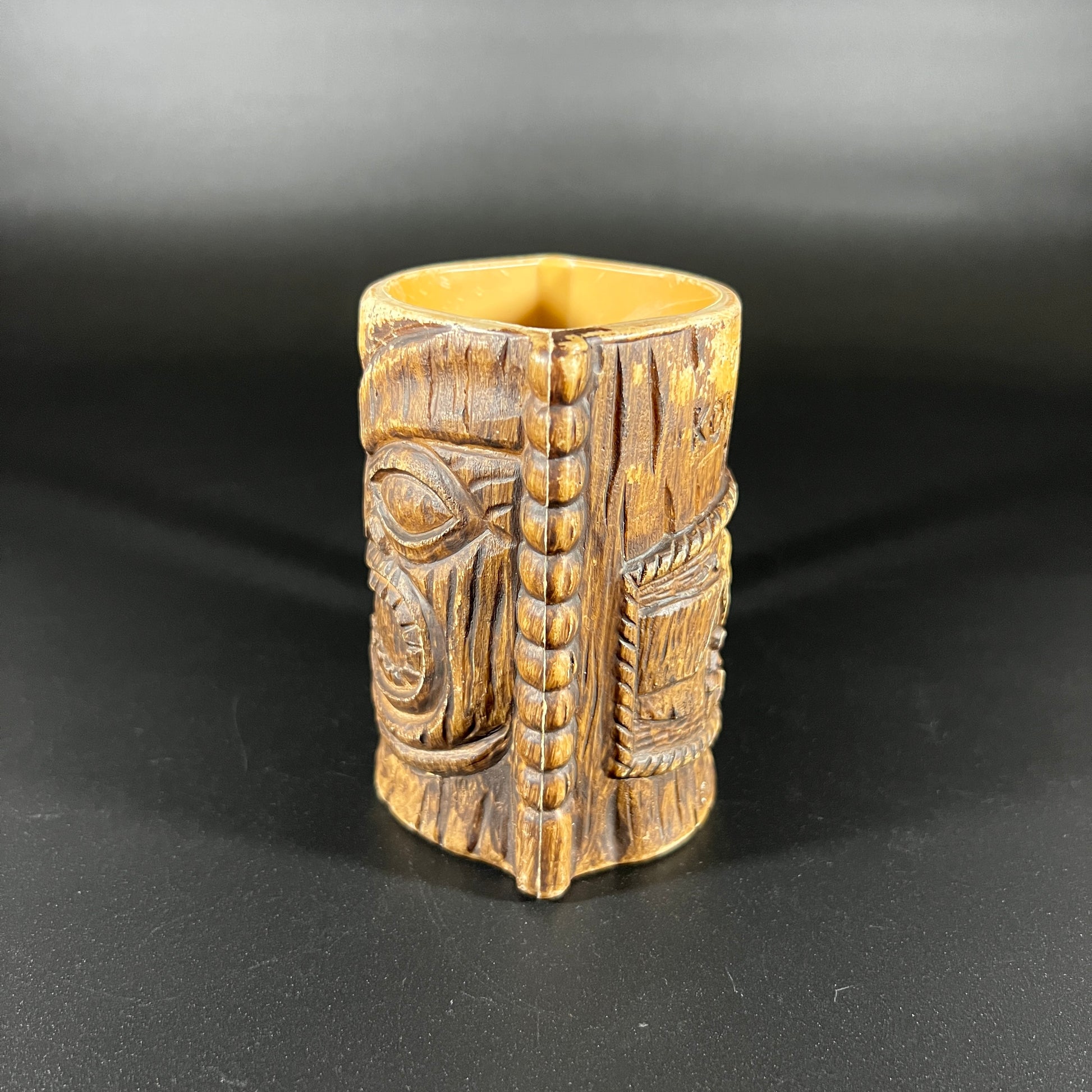 This vintage mug from the Original Kona Coffee Mill dates back to the 1960s and features a scenic landscape on one side and the face of a tiki god on the reverse. Made from plastic or resin, it is in good vintage condition. The mug measures approximately 4" H x 4" W (including handle) x 2.75" D, making it a unique and collectible piece for tiki and coffee enthusiasts alike.