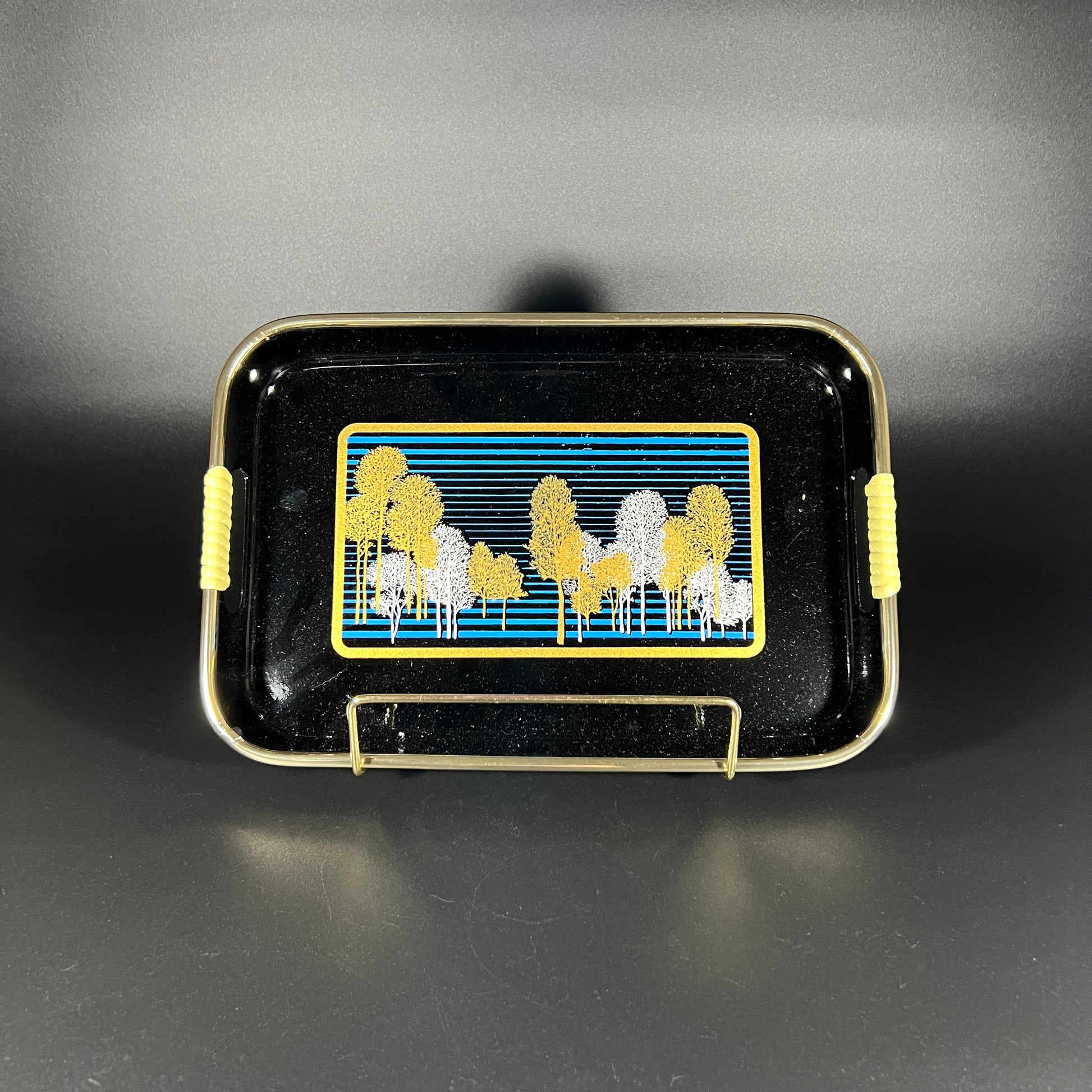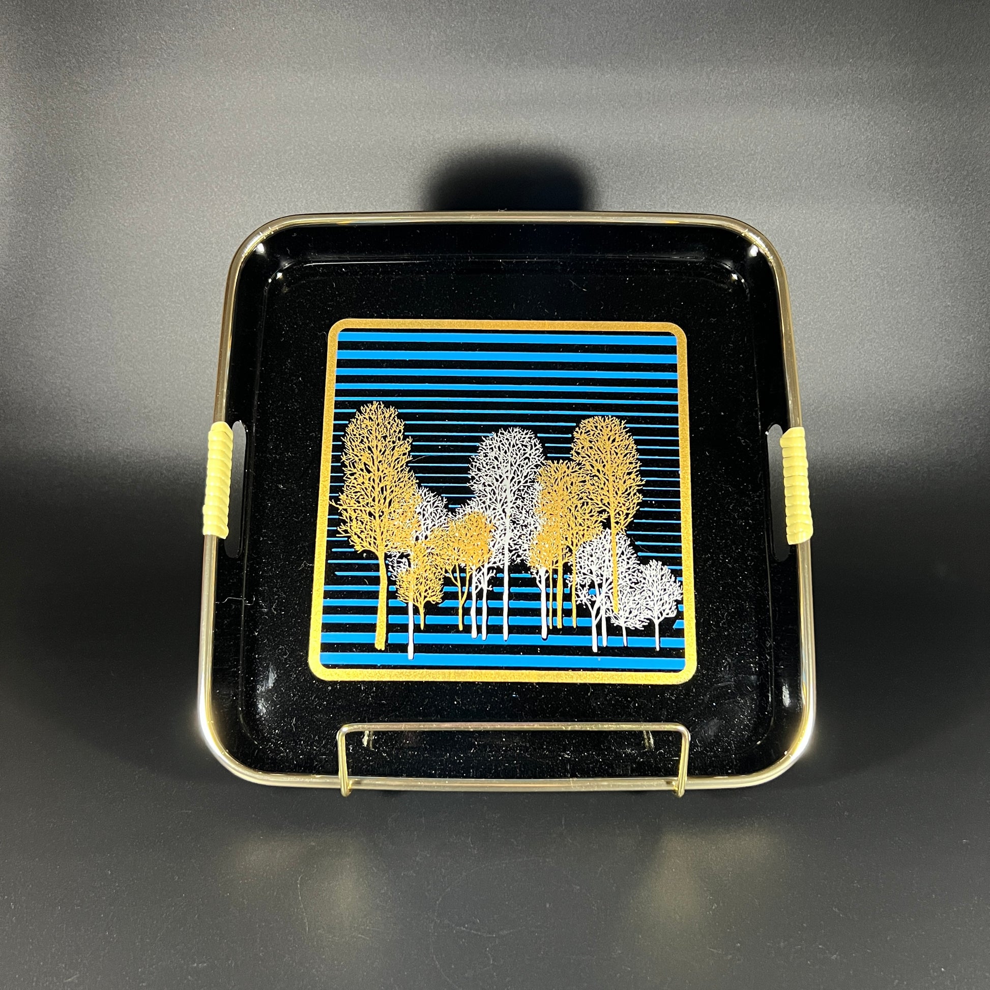 This 4 piece vintage set includes a standard 3 piece set, plus a bonus large size tray. These 1960s mid-century serving trays, made in Japan, feature plastic handles and a striking design of surreal gold and silver trees against blue stripes. The trays vary in size, with the 2 large trays measuring approximately 19" W x 11.5" H x 1.5" D, the medium tray measuring 10.75" W x 10.75" H x 1.25" D, and the small tray measuring 10.75" W x 7.75" H x 1.5" D. In good vintage condition, these trays add a stylish and artistic touch to any collection or home, perfect for serving or as decorative pieces.