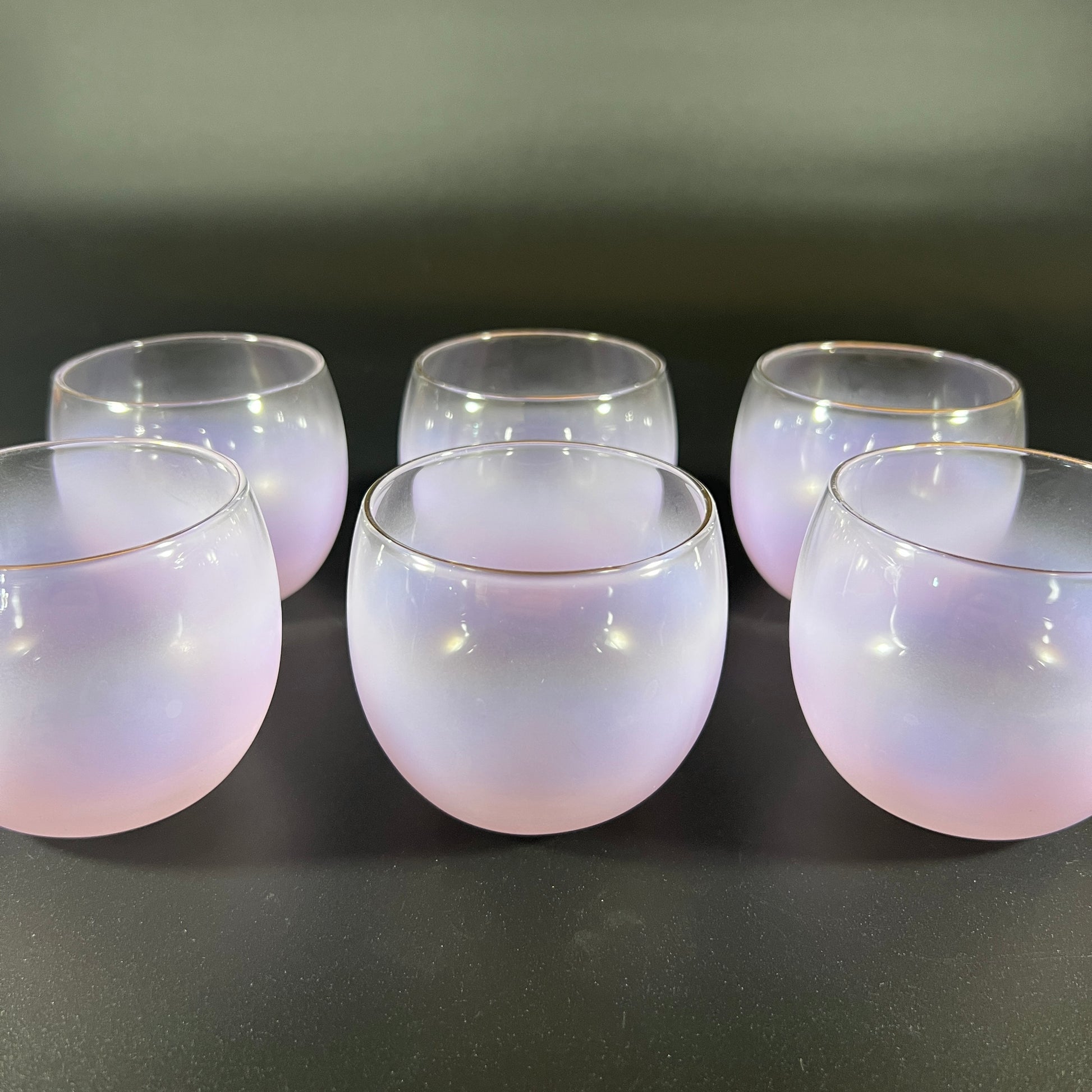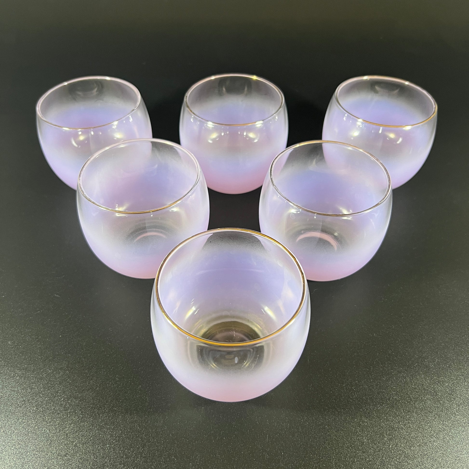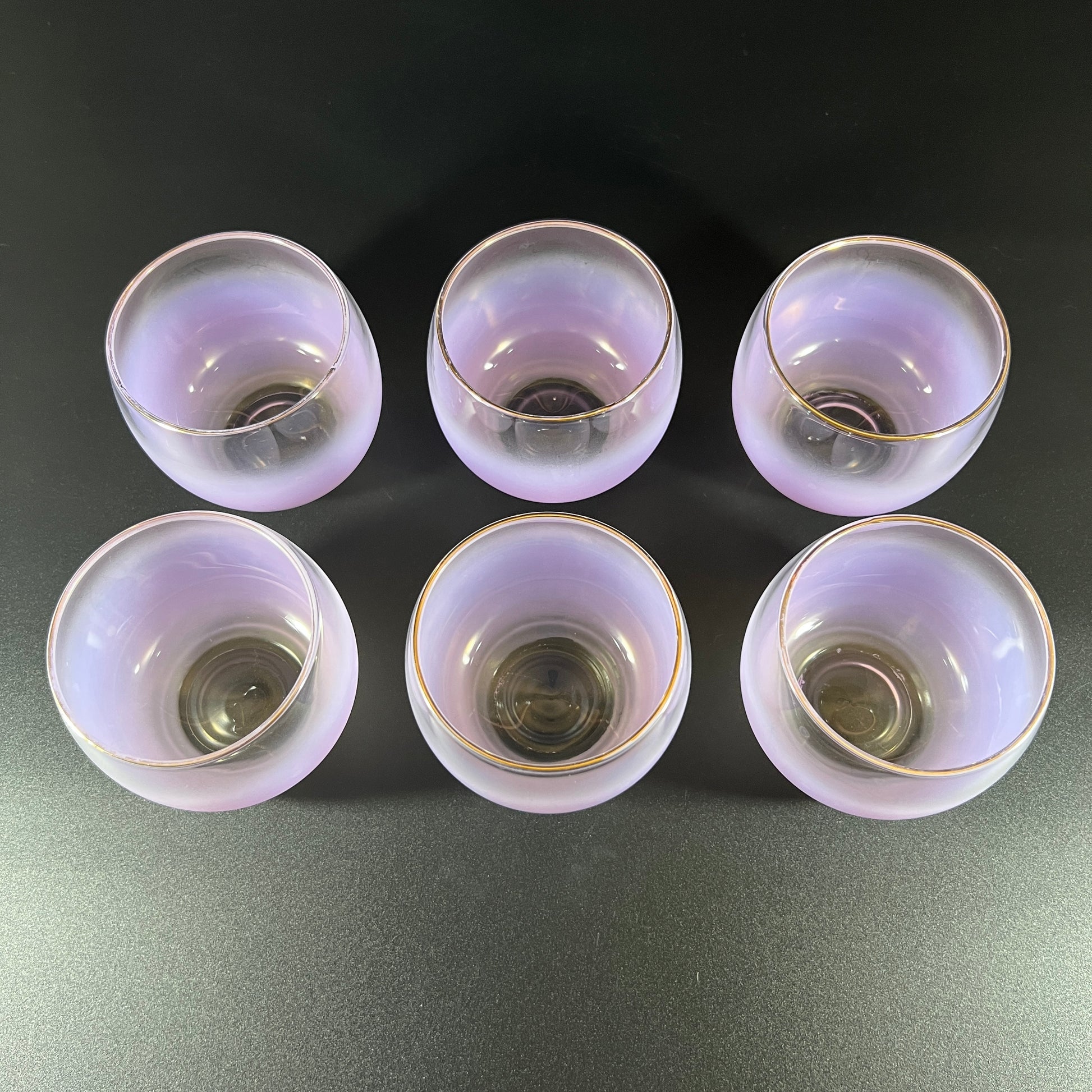 This beautiful mid-century Blendo set in the Gala Lavender color was made by West Virginia Specialty Glass around 1955. Known for its signature ombré style, Blendo glassware features a rich color at the base that gradually fades into clear glass toward the top. This matching set includes six classic Roly Poly glasses, each with a soft lavender (light purple) base, a clear upper section, and a delicate gold rim along the top edge. The glasses are designed in the iconic Roly Poly shape—they gently roll when placed on their sides and then right themselves, adding a playful touch to any gathering. Each glass measures approximately 2.75 inches high, 3.25 inches in diameter, with a 2.75-inch opening. A popular choice in the 1950s, Blendo drinkware is still a favorite among collectors today. This set is in great vintage condition and makes a stylish and fun addition to any retro kitchen or bar.
