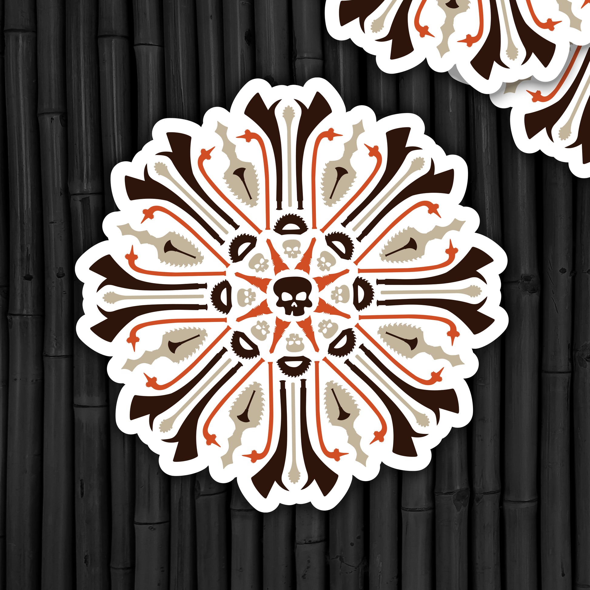 A mandala design featuring a collection of tribal war clubs from the South Pacific. The polychromatic color scheme draws inspiration from the traditional color palette from tribes in the Sepik River region of Papua New Guinea. This high quality die cut sticker is 4" in diameter.