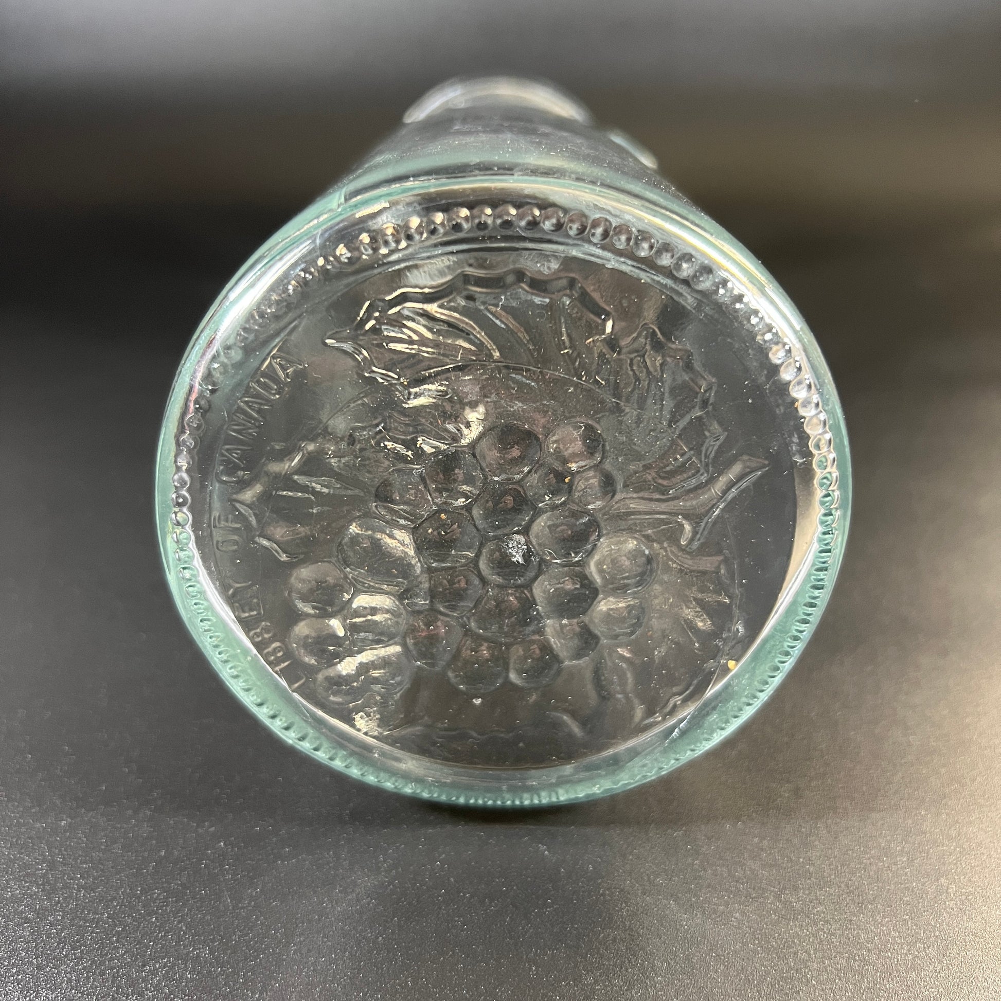 This vintage 1-liter wine carafe, produced by Libbey of Canada, is a distinctive piece with a charming design. Unlike traditional wine carafes, it takes the shape of a classic mug jug. The embossed motif at the base features a beautiful bunch of grapes, adding a touch of elegance to its rustic appeal.