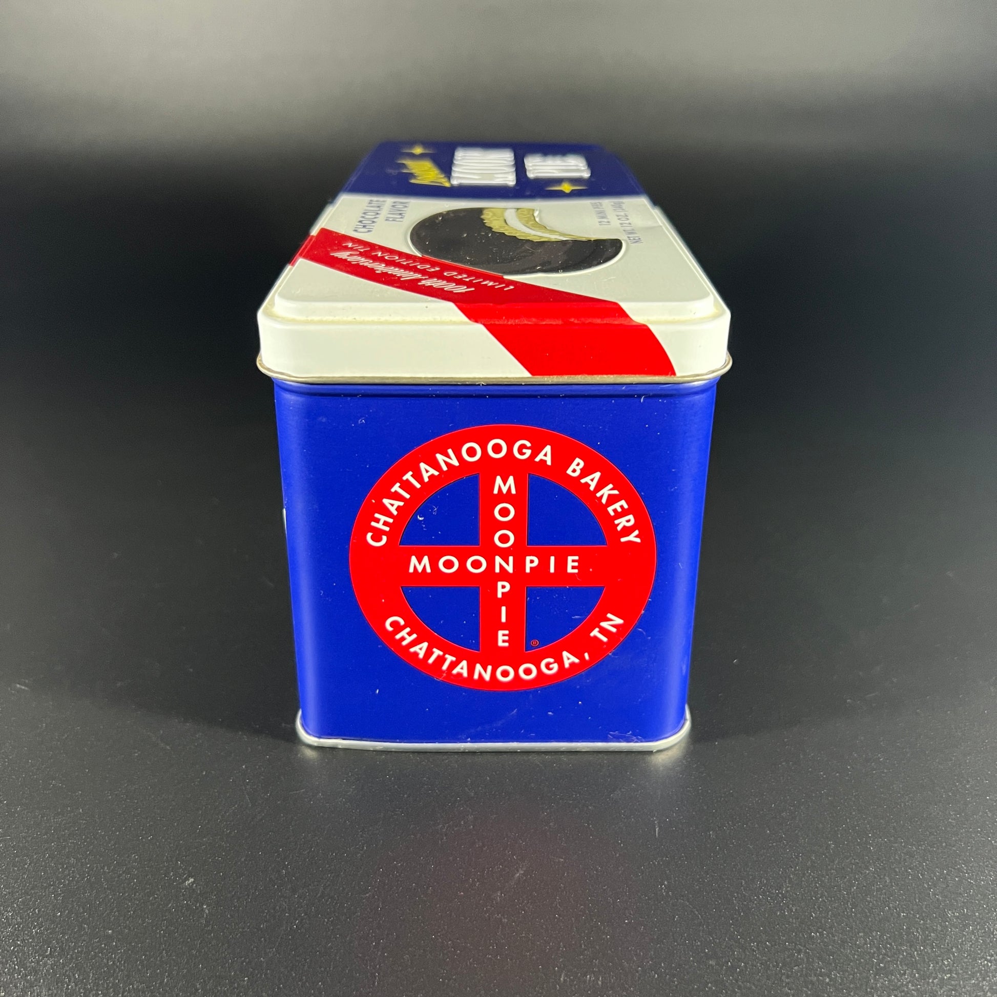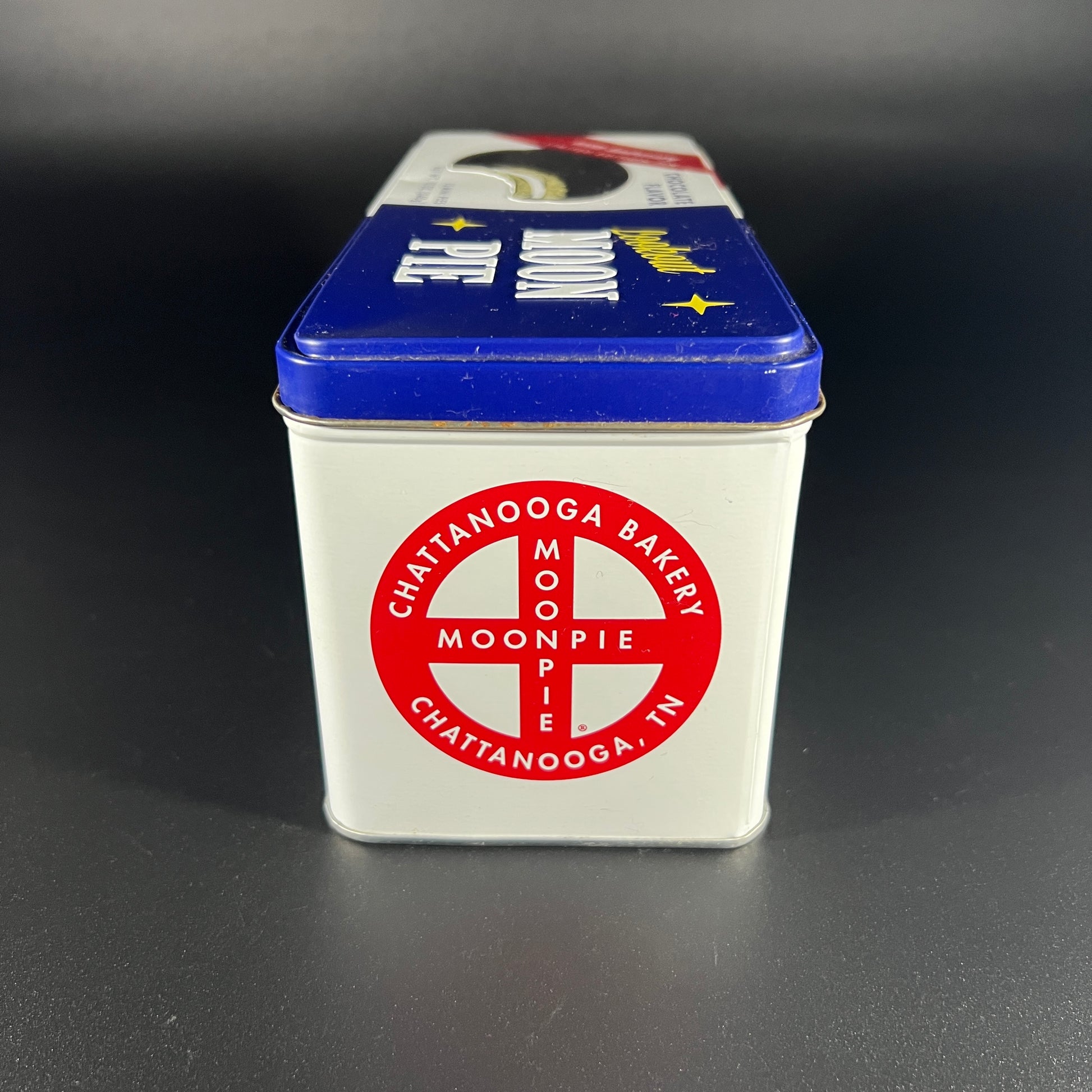 Vintage Lookout Moon Pie tin, featuring classic retro charm and in good condition with wear consistent with its age. This nostalgic piece showcases the iconic branding, perfect for collectors or as a unique display item. Please review the photos for further details. It measures approximately 9.5" H x 4.75" W x 4.75" D.