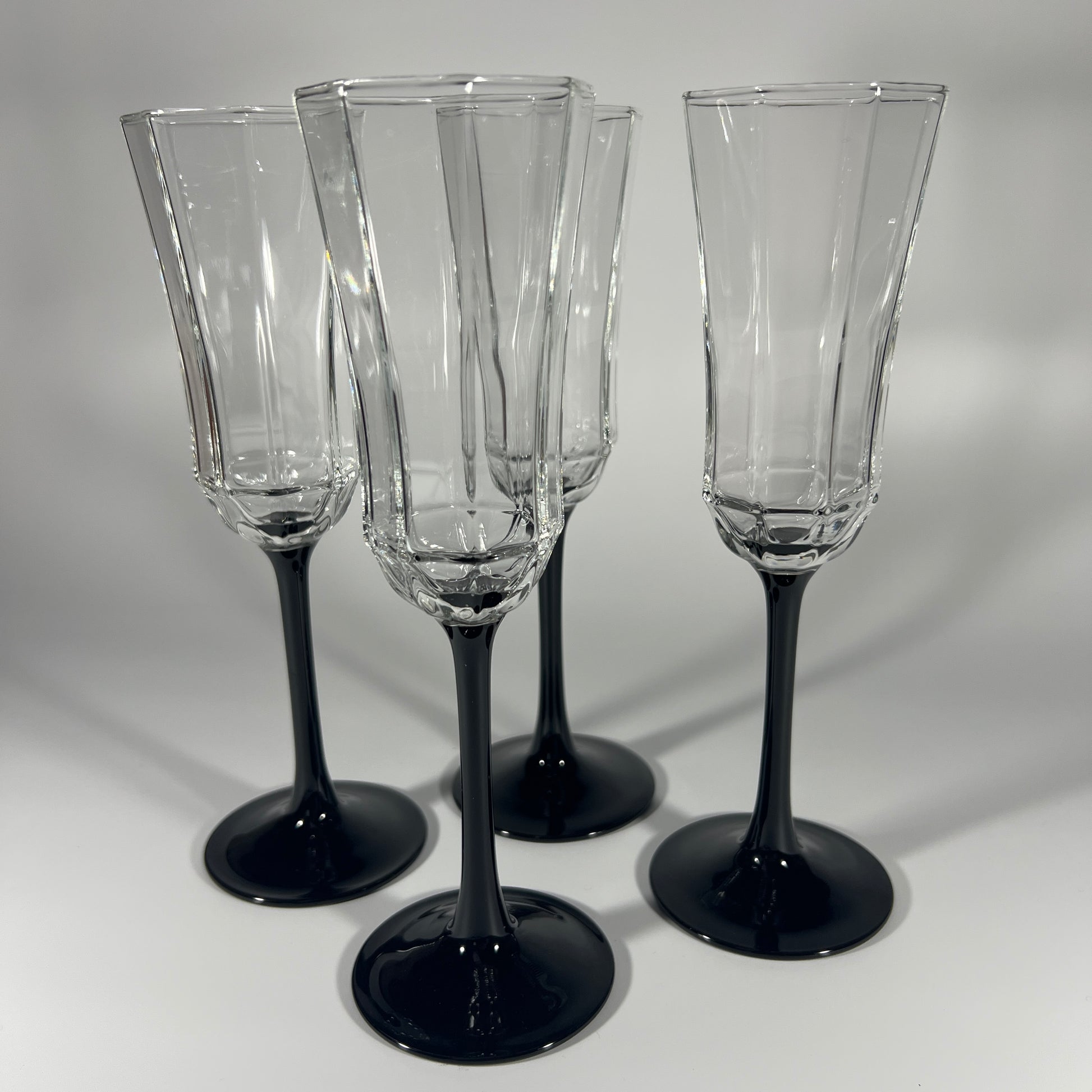 Elevate your next celebration with these elegant Luminarc Octime Octagon champagne flutes, featuring striking black stems. With their sleek, timeless design, these flutes are perfect for toasting in style. They are in excellent vintage condition. Please refer to the photos for more details. Each flute measures approximately 8.75" H x 2.5" in diameter.