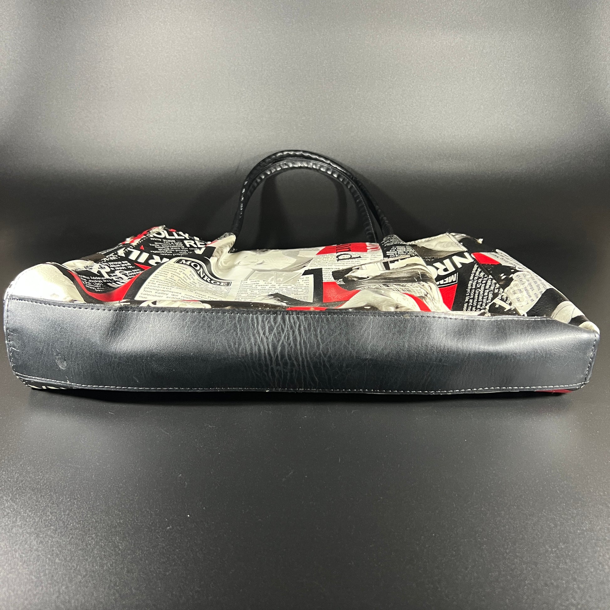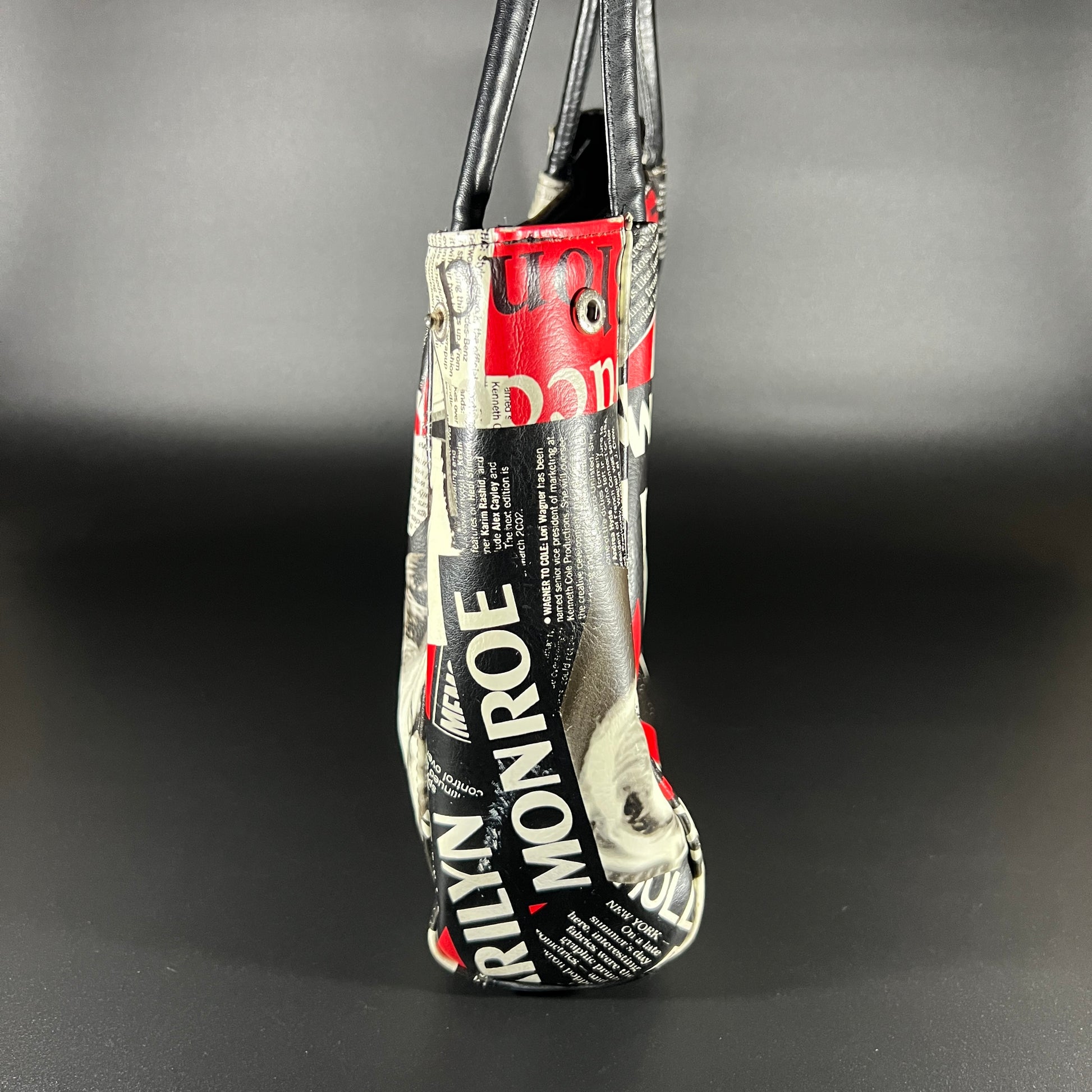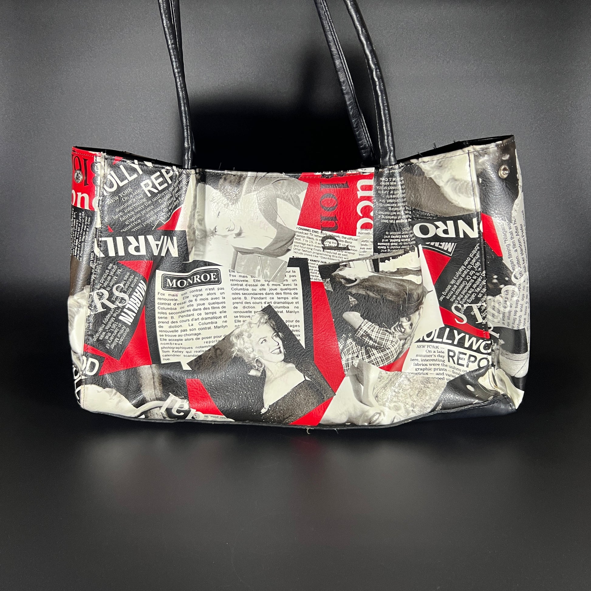 This large purse features a striking design with newspaper clippings and iconic photos of Marilyn Monroe, offering a bold, vintage-inspired aesthetic. In good pre-owned condition, it showcases vibrant imagery and sturdy craftsmanship. The purse measures approximately 18" in height (including handles), 16" in width, and 2.5" in depth, making it a statement piece with ample space for your essentials.