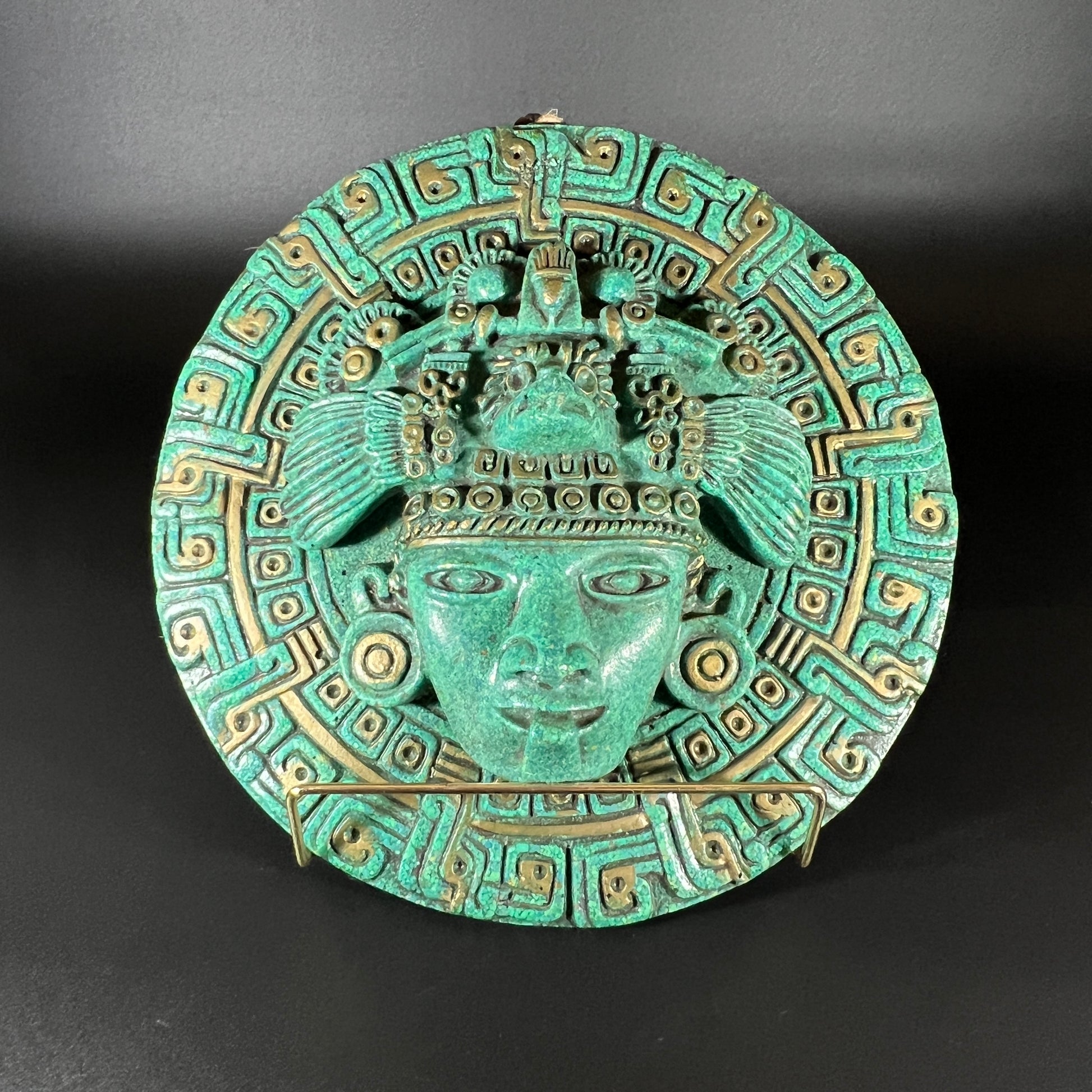 This vintage Mayan Malachite God plaque wall decor is influenced by the distinctive style of Zarebski Art. With its rich, detailed design, it makes a striking statement piece for any space. The item is in good vintage condition, measuring 9.5" in diameter and 2.5" in depth, offering both cultural significance and artistic appeal.