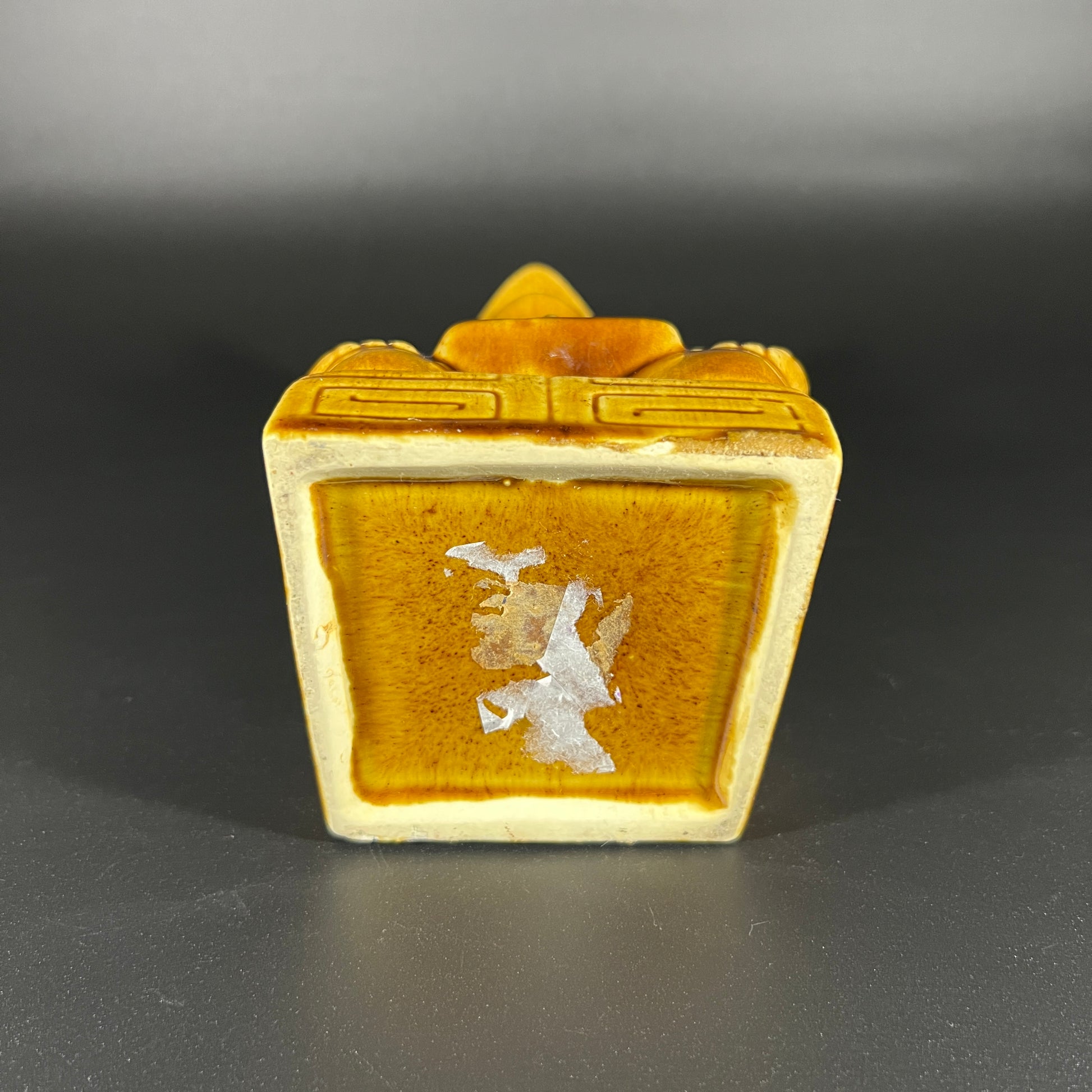This vintage Mayan Warrior ceramic decanter is in good vintage condition, with two minor chips. Please note that the cap is not original, and the item has been priced accordingly. It measures approximately 9.75" in height, 5" in width, and 3.5" in depth. A unique and collectible piece for those interested in Mayan-inspired art and vintage ceramics.