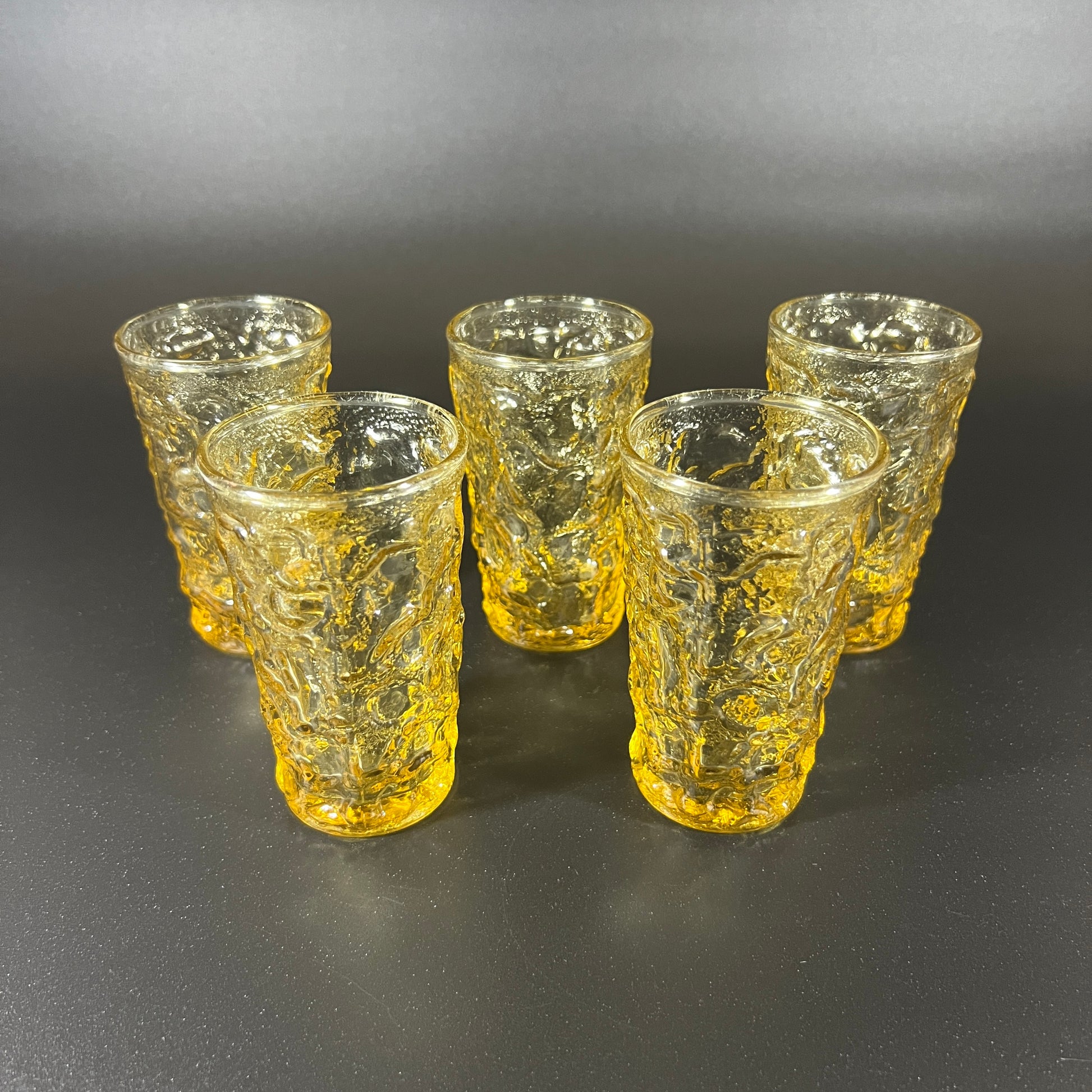 This set of 5 Anchor Hocking Lido Milano juice glasses features a beautiful amber honey gold color with a crinkle-dimpled texture, capturing the retro charm of the 1970s. Each glass holds 4 oz and is in good vintage condition with no chips or cracks. Dimensions: 4" H x 2.25" diameter. A nostalgic addition to any retro kitchen or drinkware collection!