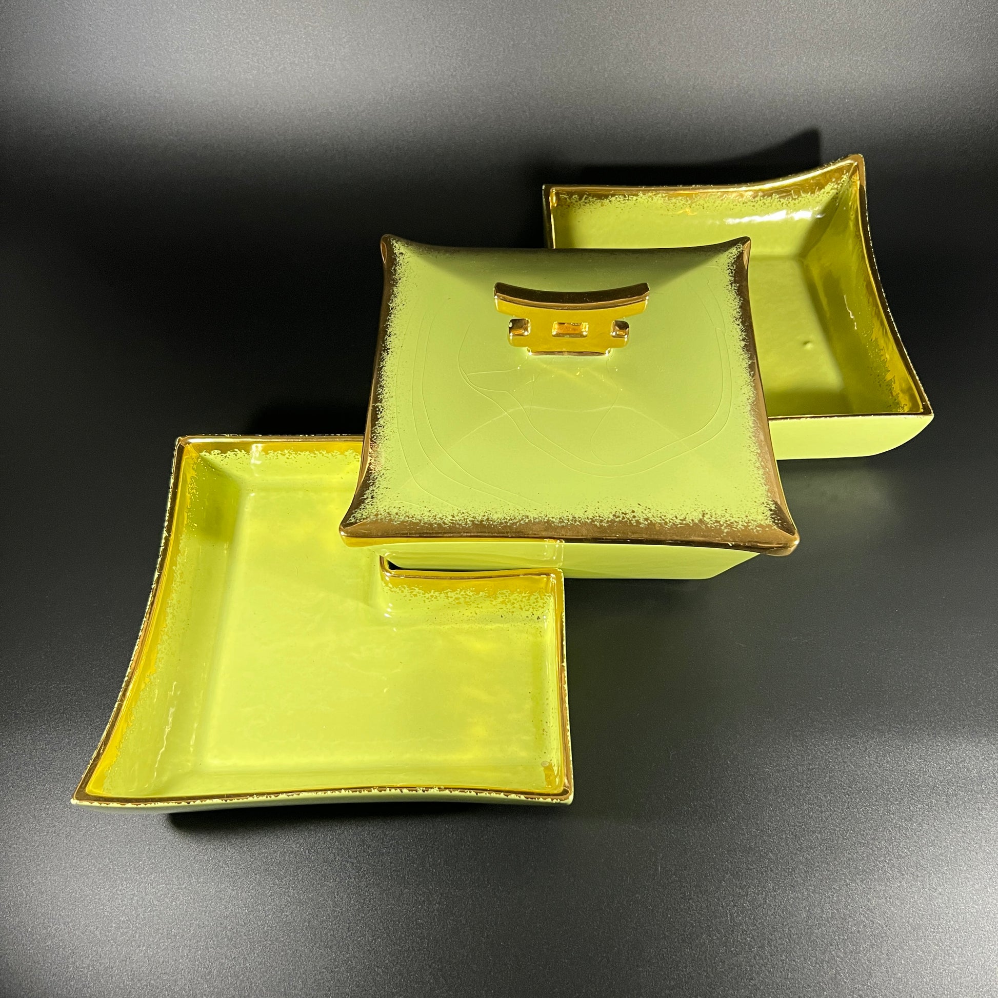Please note, the tray shows some signs of age, including a bit of crazing on the lid. Additionally, one of the side trays has a small bump, likely from the original production process. Refer to the photos for more details on these minor imperfections.