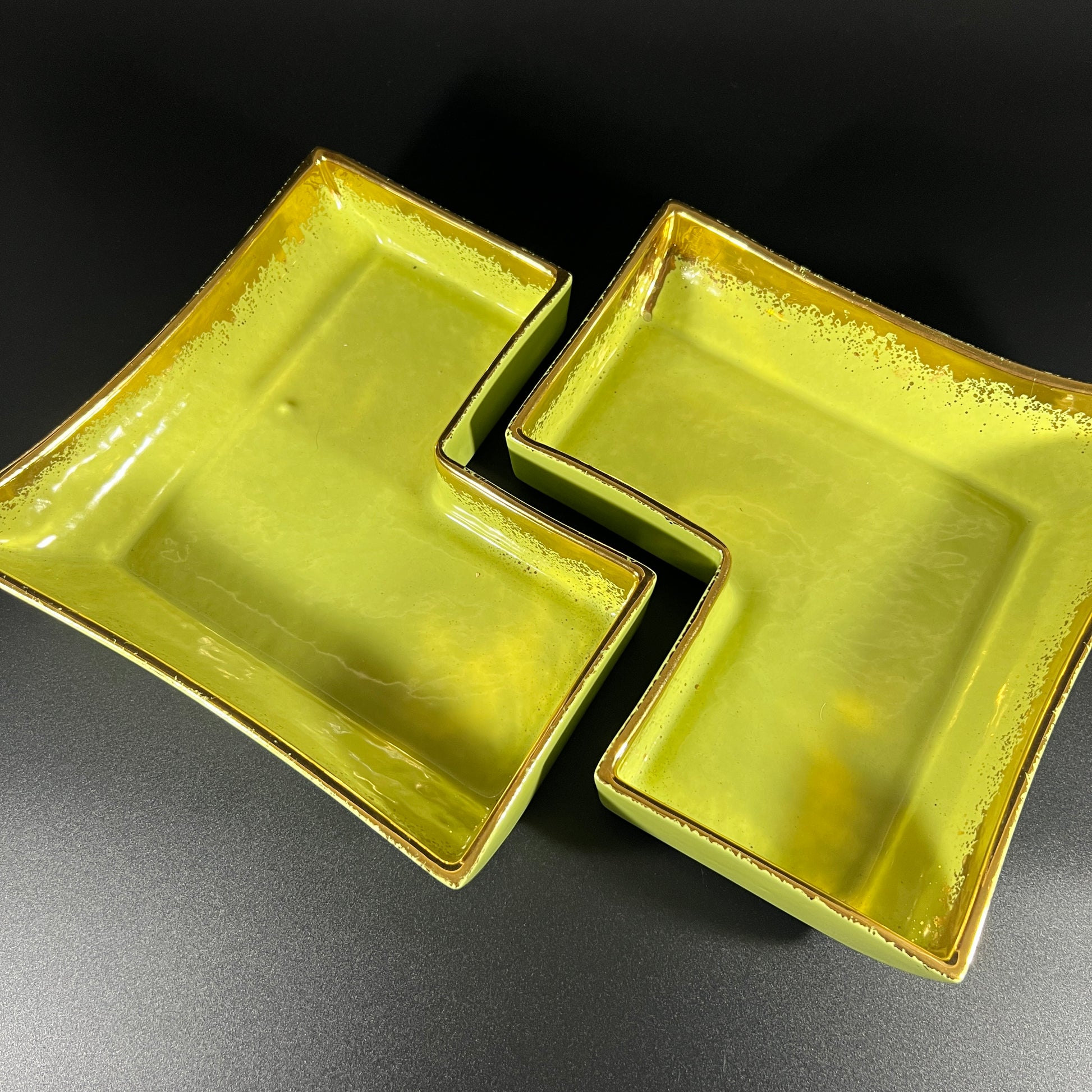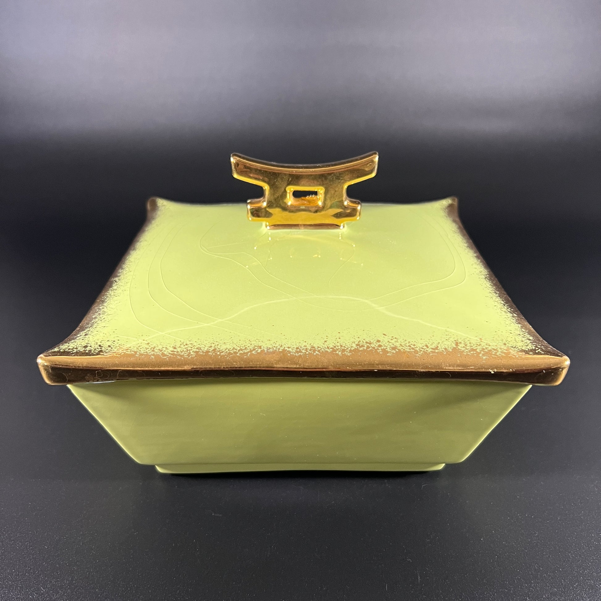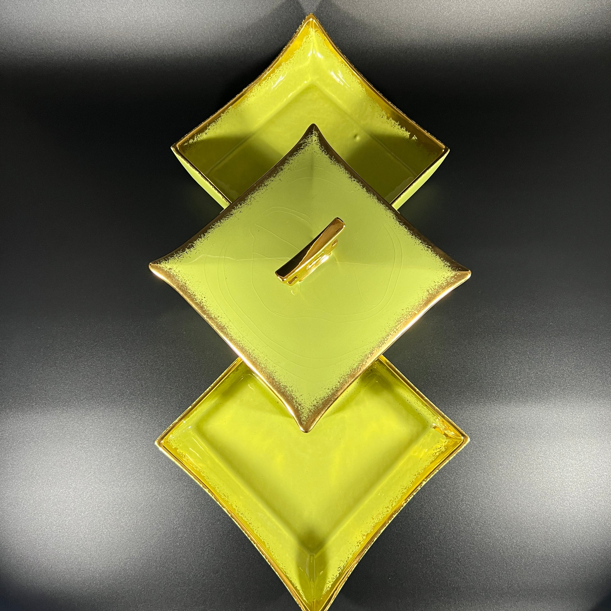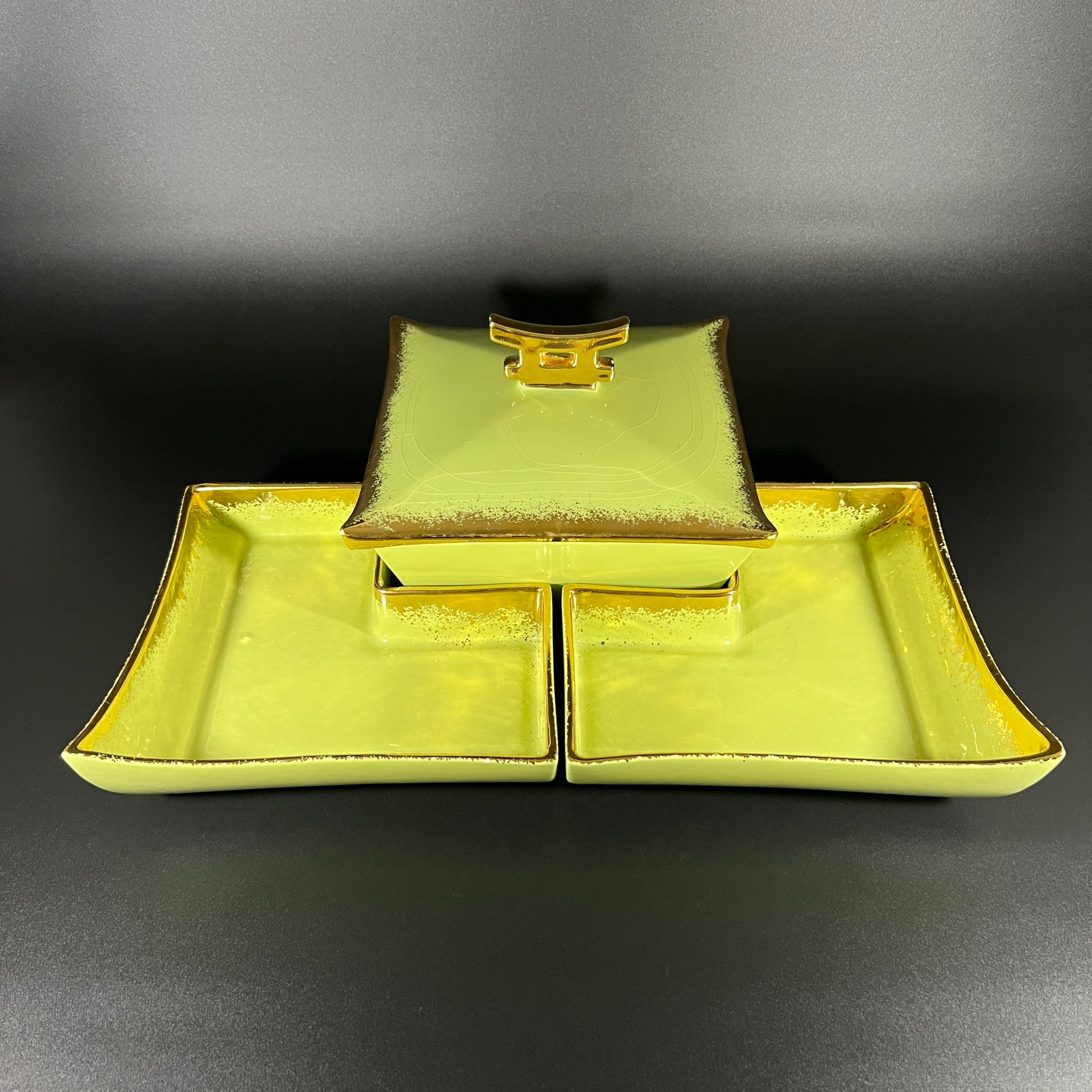This Mid-Century Modern Asian-style covered serving tray, complete with matching side trays, will make a stunning addition to your coffee table or home decor. Featuring soft green and gold accents, it brings a refined touch of elegance to any room. The Asian-inspired design is distinctive and sure to impress. Crafted in the 1950s, this piece has beautifully withstood the test of time and remains in excellent vintage condition. It would pair wonderfully with mid-century furnishings and decor.