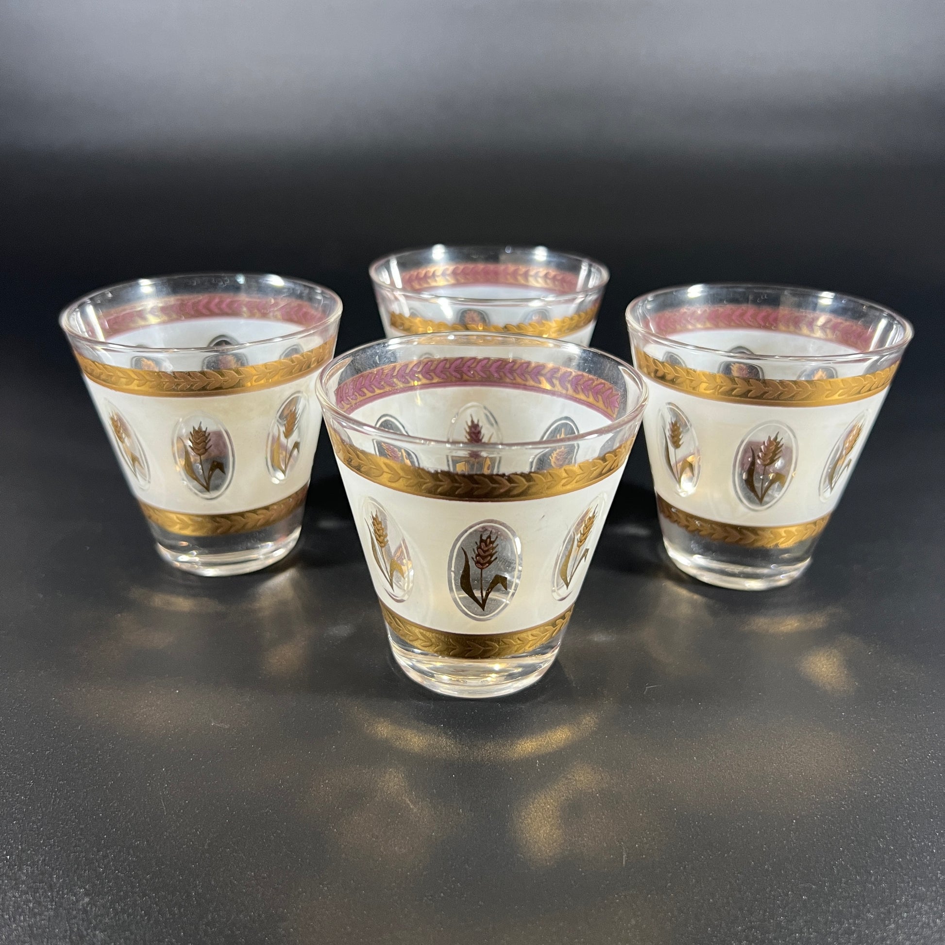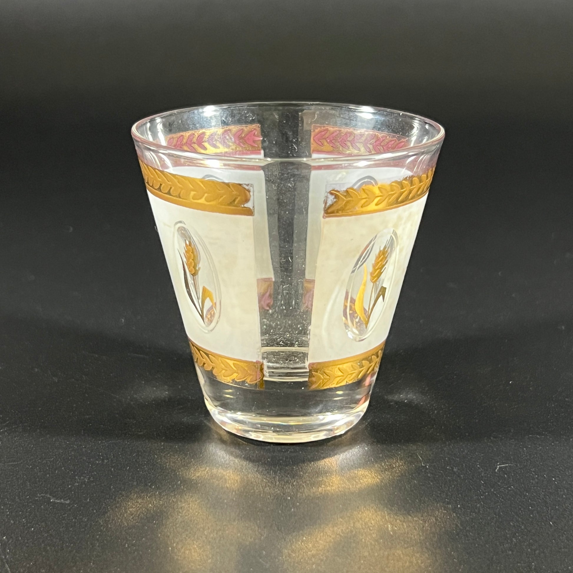 This excellent set of 4 Mid-Century Dominion Glassware shot glasses features a frosted wheat pattern with elegant gold laurel leaf trim. These glasses are in great condition, with no chips, cracks, or issues, and the gold detailing remains vibrant and intact. Each glass holds up to 2.5 oz of liquid, making them the perfect size for shots or small servings.