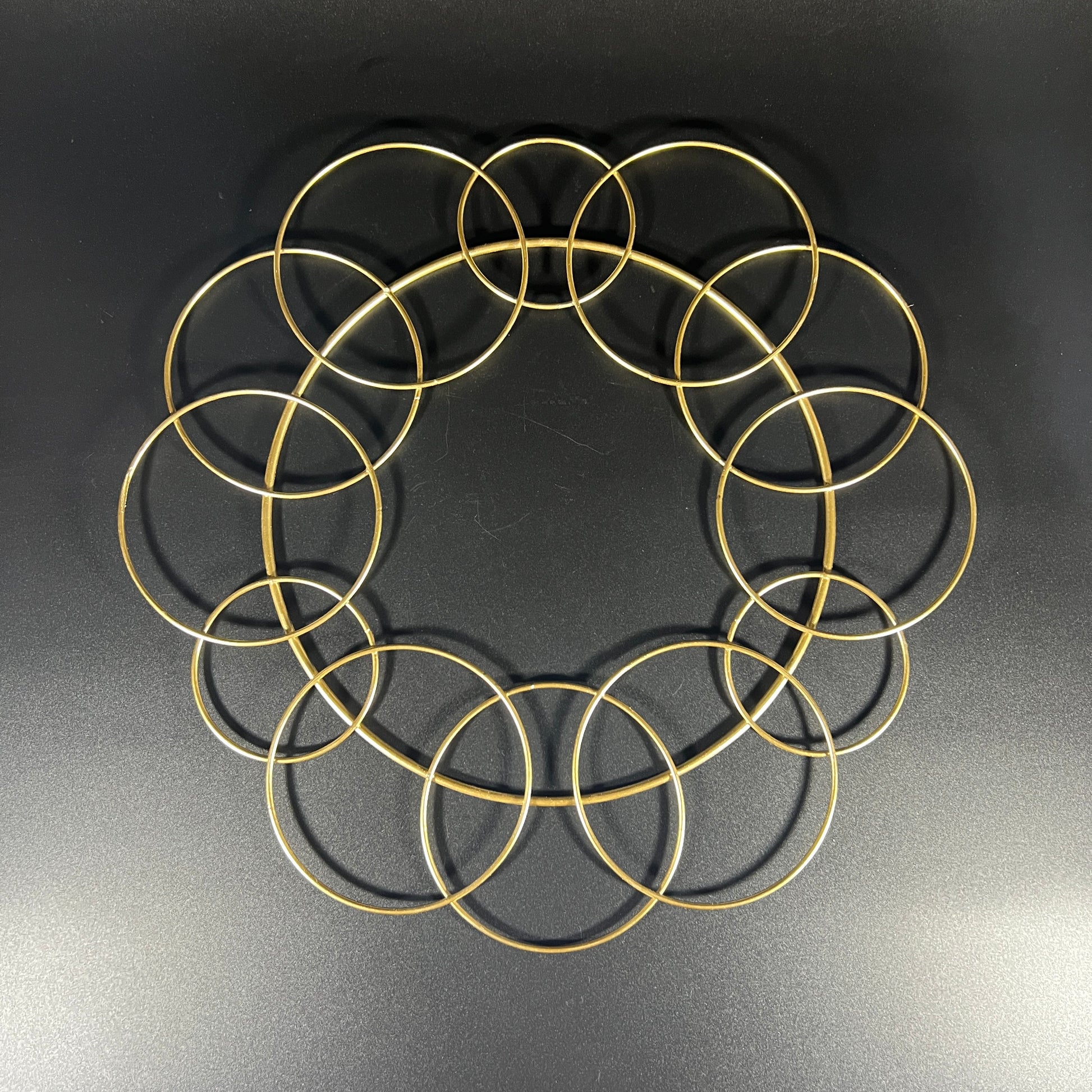 This vintage gold metal wall art, featuring a captivating series of circles, effortlessly complements mid-century modern or atomic age decor. In excellent vintage condition, it adds a sleek and stylish touch to any space. The piece measures 13 inches in diameter, making it the perfect size to elevate your walls with its timeless design.