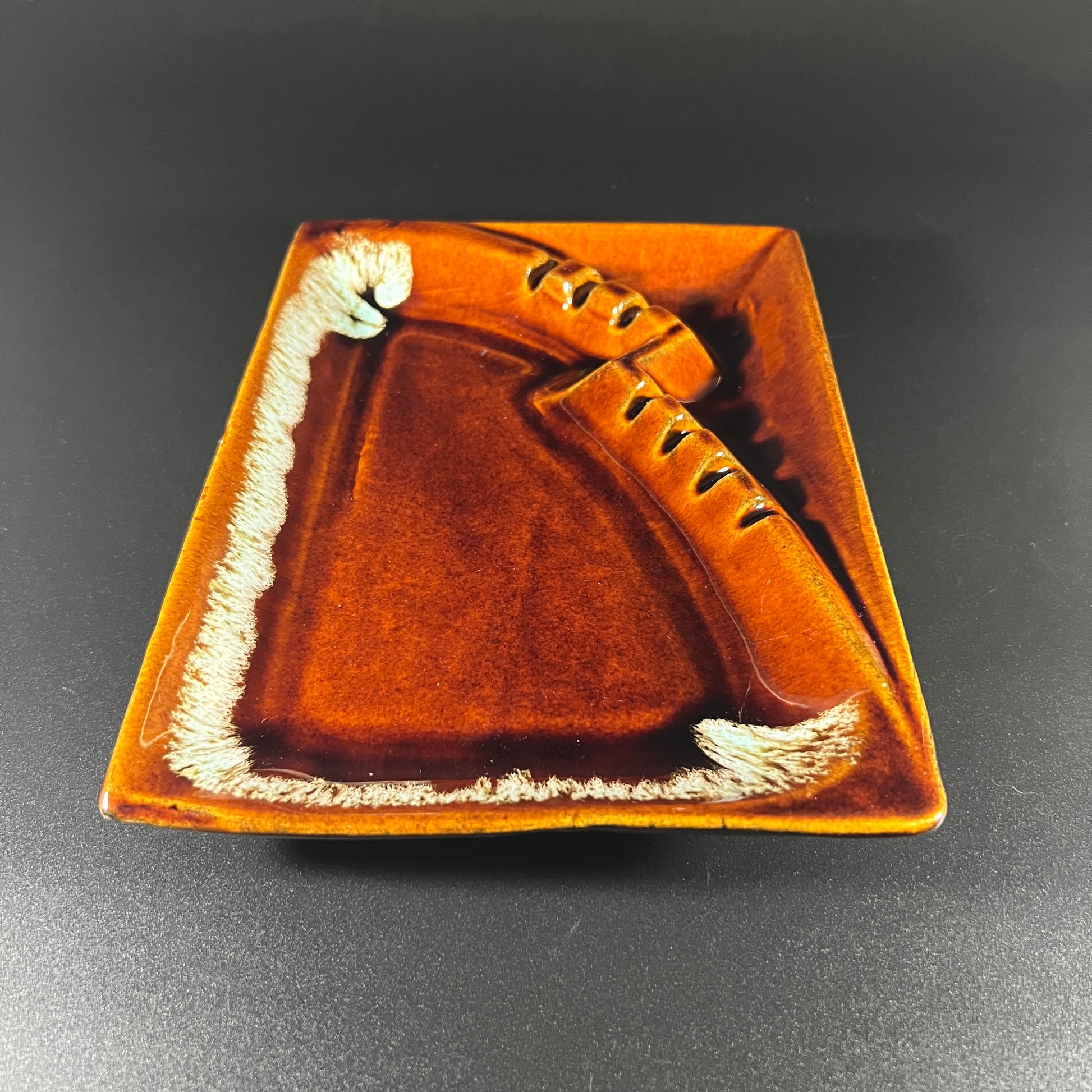 This vintage mid-century modern ceramic ashtray features a sleek rectangular shape with a rich brown glaze and a lighter brown drip design. Back-stamped "Made in U.S.A.," the piece is unmarked with regard to the brand. It is in great vintage condition, showcasing the timeless design of the era. Please refer to the photos for additional details. The ashtray measures approximately 1.25" H x 9.25" W x 6.75" D. A perfect addition to any mid-century modern collection!