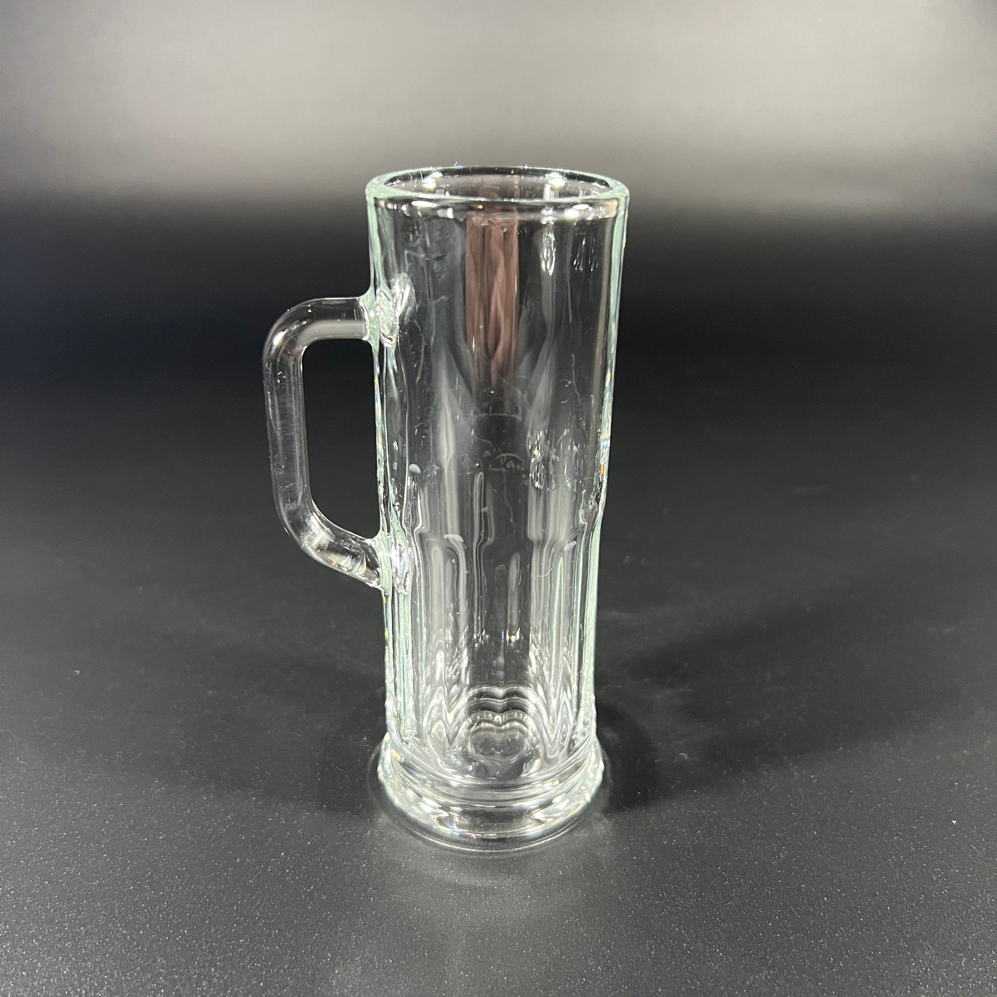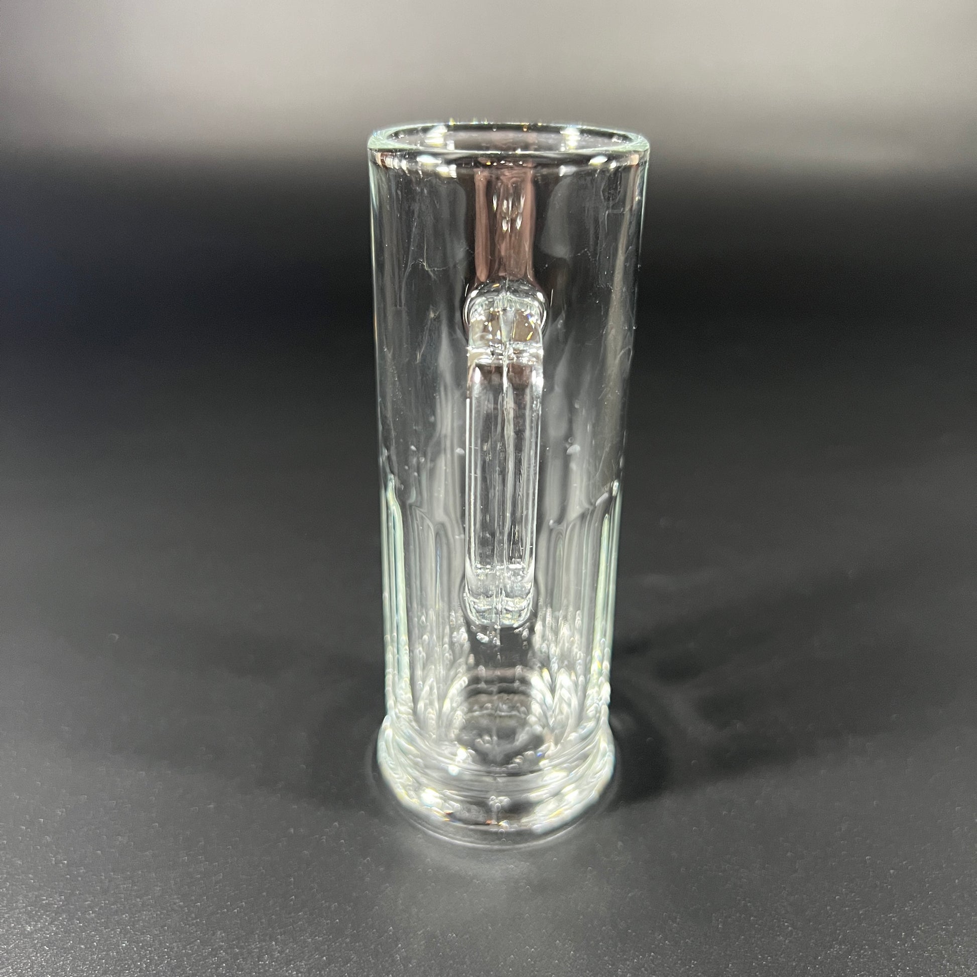 Measuring 3.5 inches wide (with the handle) and 5 inches tall, with a diameter of 1.75 inches, these mugs feature a classic, compact design. The sturdy handles and clear glass construction make them ideal for serving small drinks, whether it's craft beer, a favorite cocktail, or even a creative dessert presentation. The set is in excellent condition.