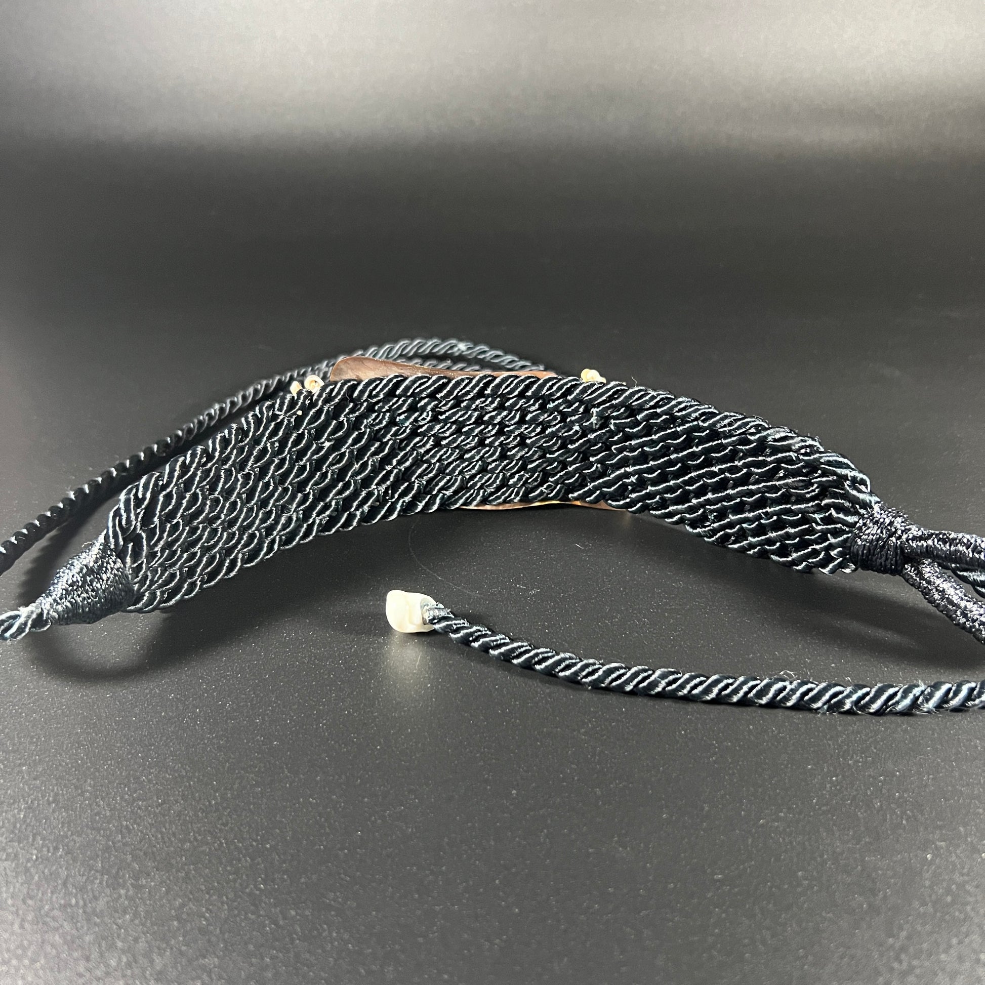 Stunning 1980s Seashell & Mother of Pearl Woven Sash Belt. This gorgeous fashion accessory features genuine seashells, natural bits, and beads, creating a beautifully textured and eye-catching design. The main belt is crafted from a black satin woven cord, with a shell at each end, adding a unique island touch. In excellent condition with no notable flaws, this belt is made in the Philippines and offers adjustable sizing thanks to its sash/tie style. It measures 57" in total length, with the thick section measuring 11". Perfect for adding a tropical flair to any outfit!