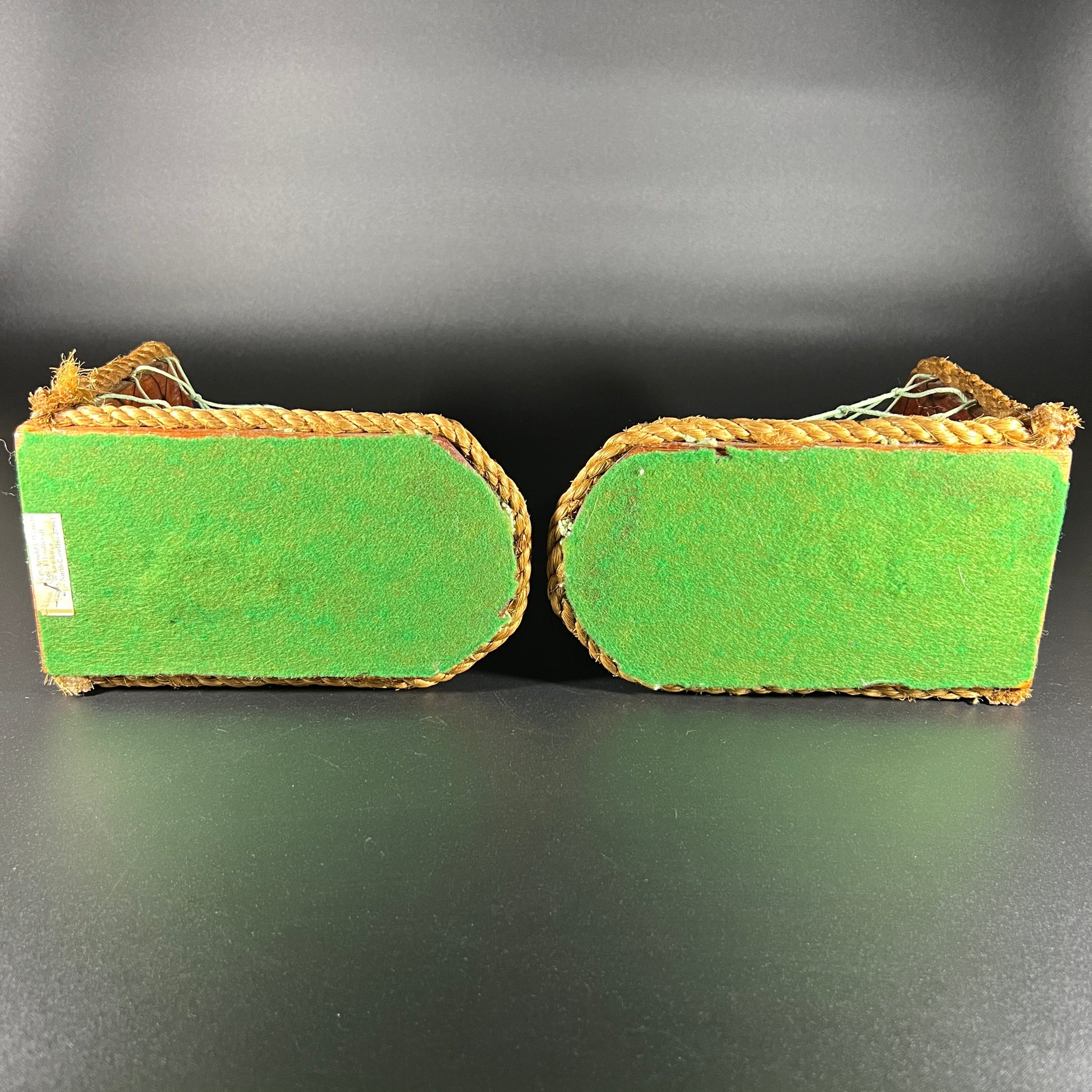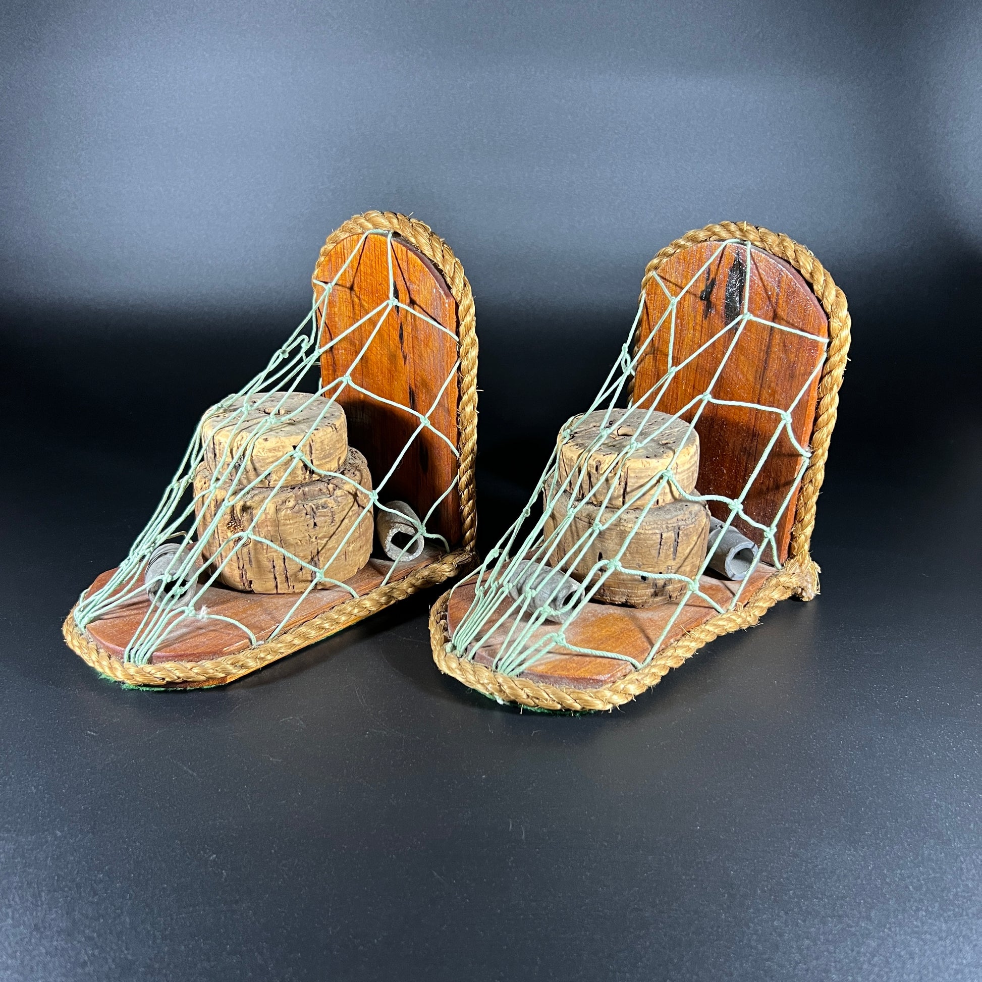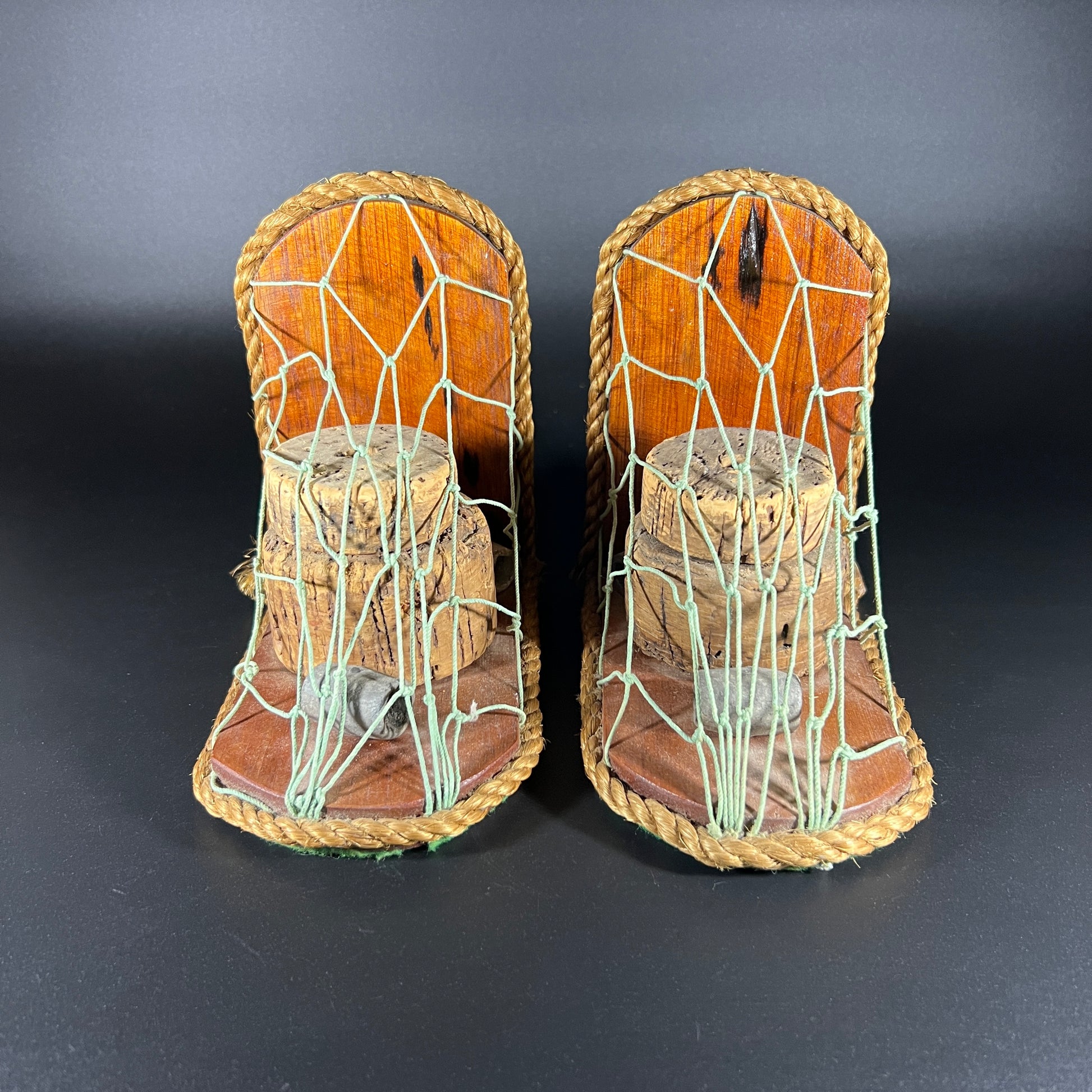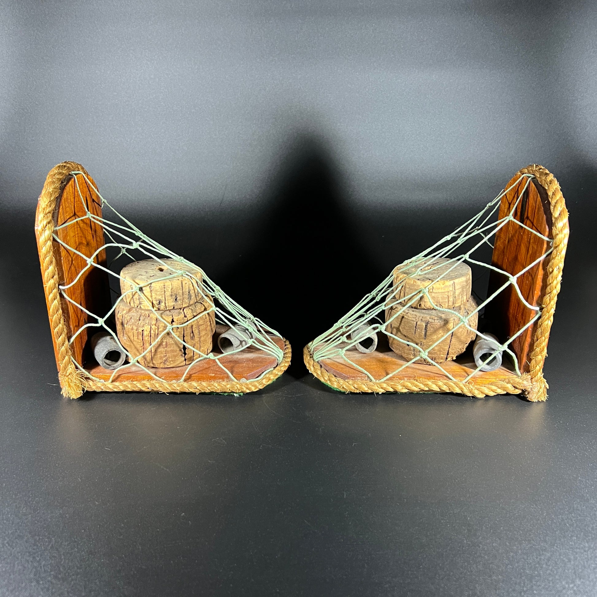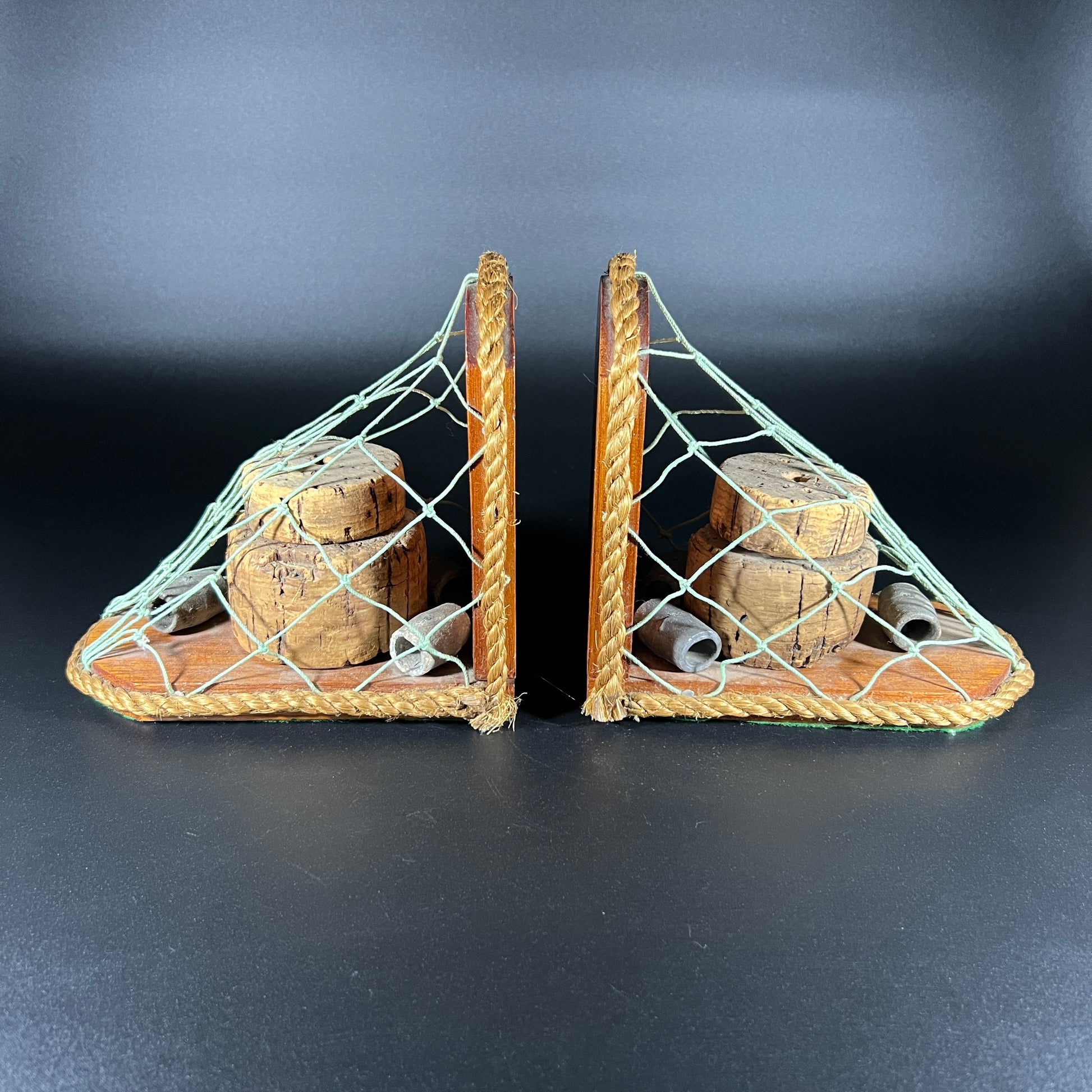 This vintage pair of bookends featuring cork floats and wrapped in fishnet, adding a nautical touch to any bookshelf. The bottom of each bookend is lined with green felt to protect surfaces. In good vintage condition, these charming bookends measure 6.75" high, 4.5" wide, and 7.25" deep. A unique and stylish way to organize your books while enhancing your home decor!