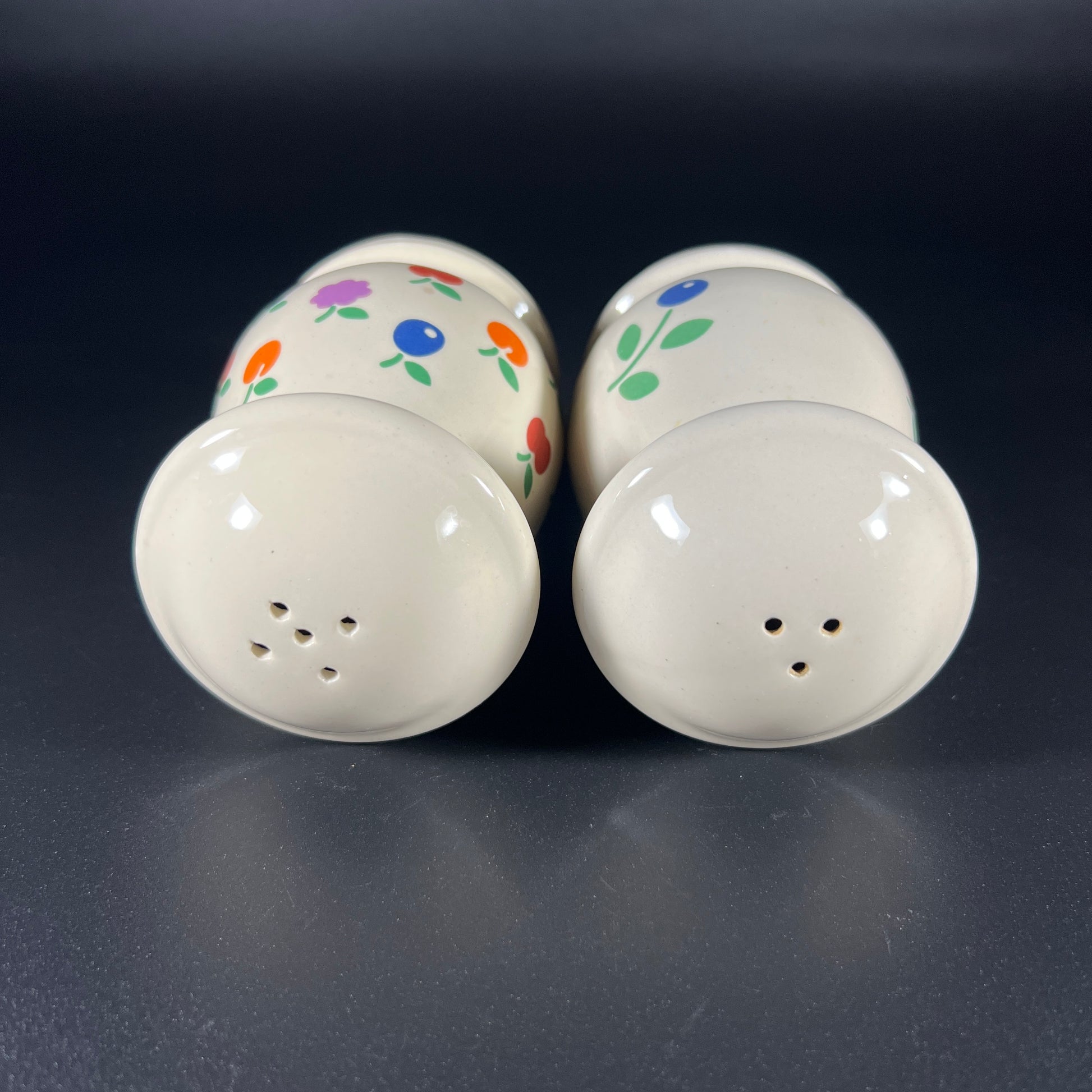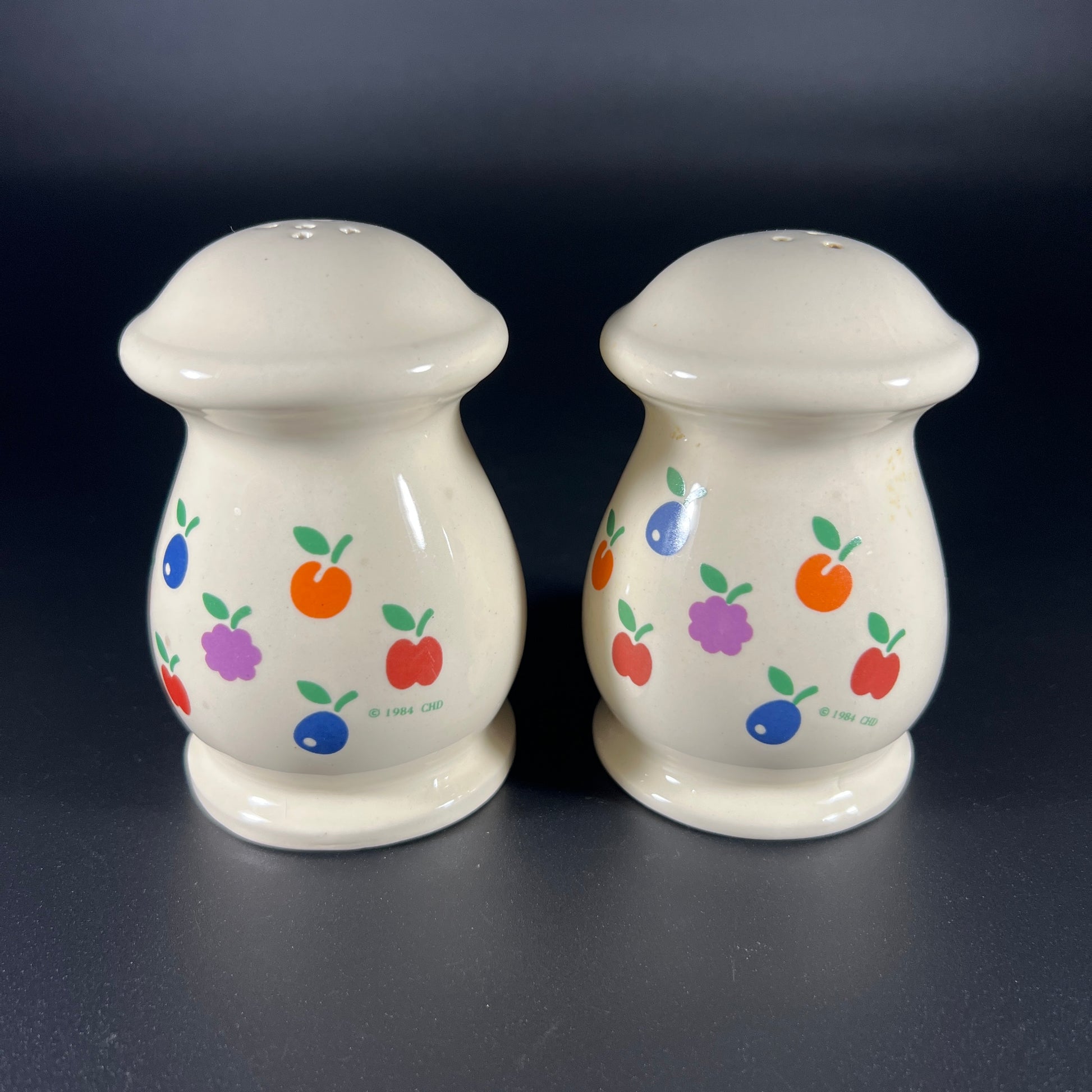 This New Avenues Stoneware 'Orchard' Salt and Pepper Shaker Set, crafted in 1984, features a charming mixed fruit design. In good vintage condition, showing typical wear consistent with age. Colors are vibrant. Please refer to the photos for more details. Each shaker measures approximately 4.25" H x 2.75" in diameter.