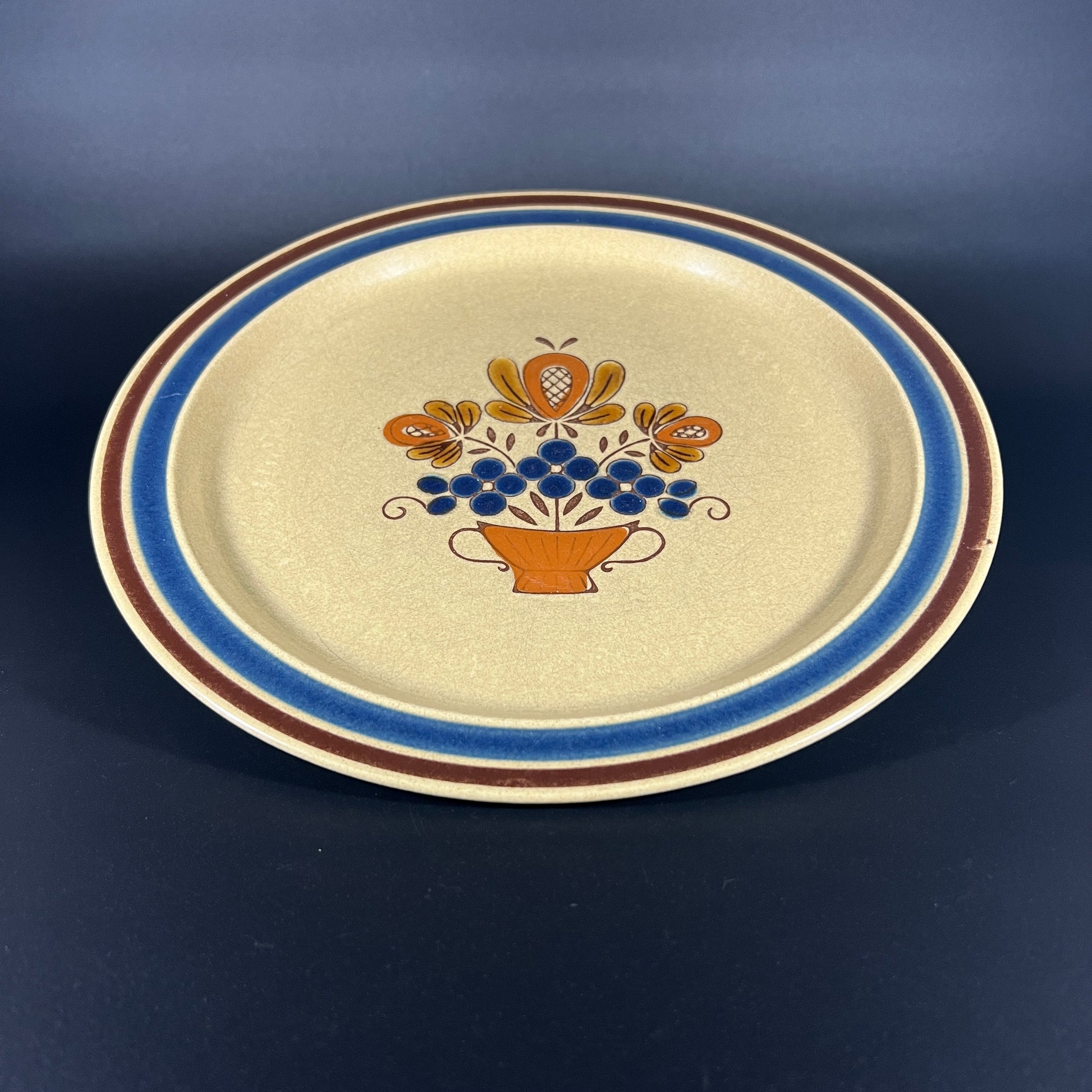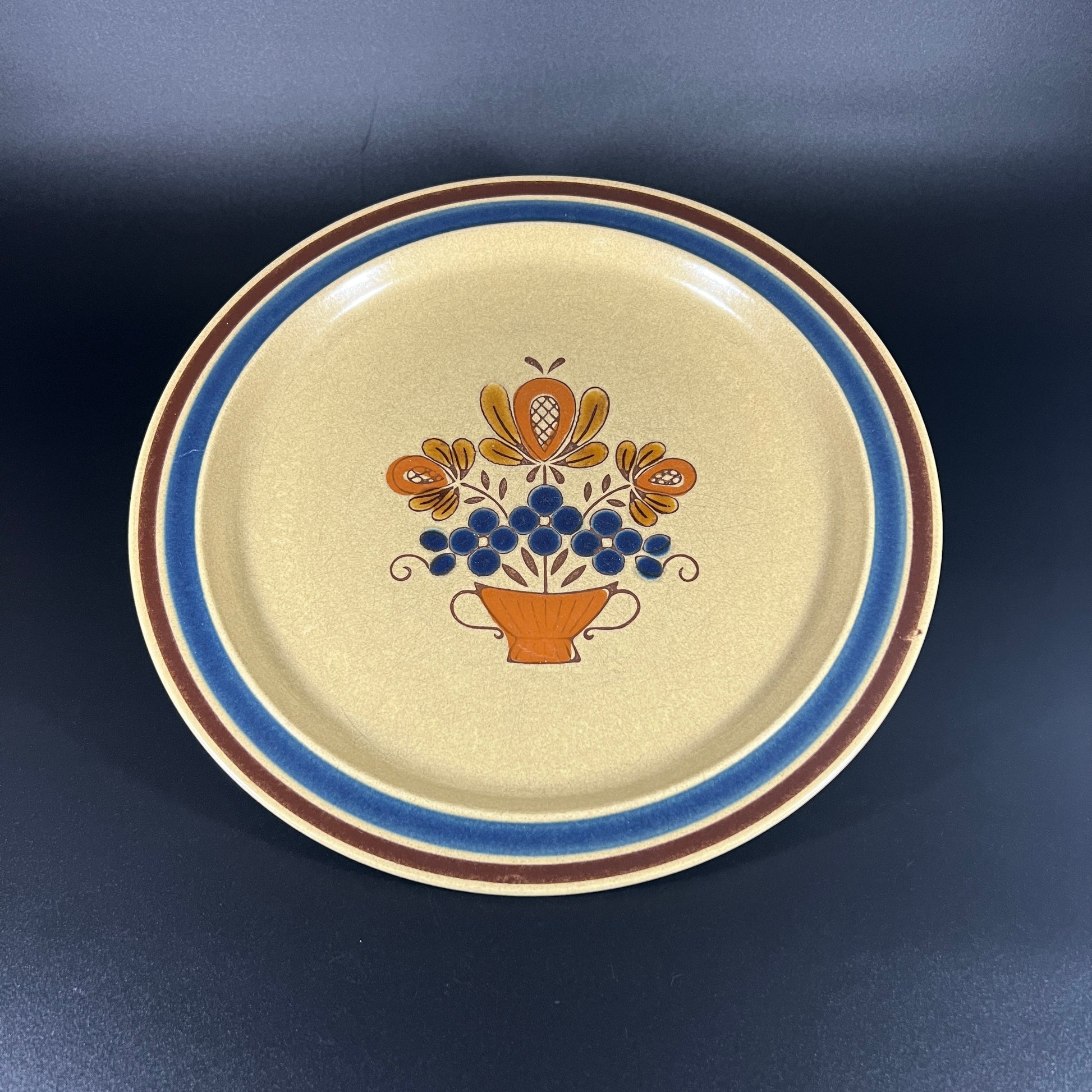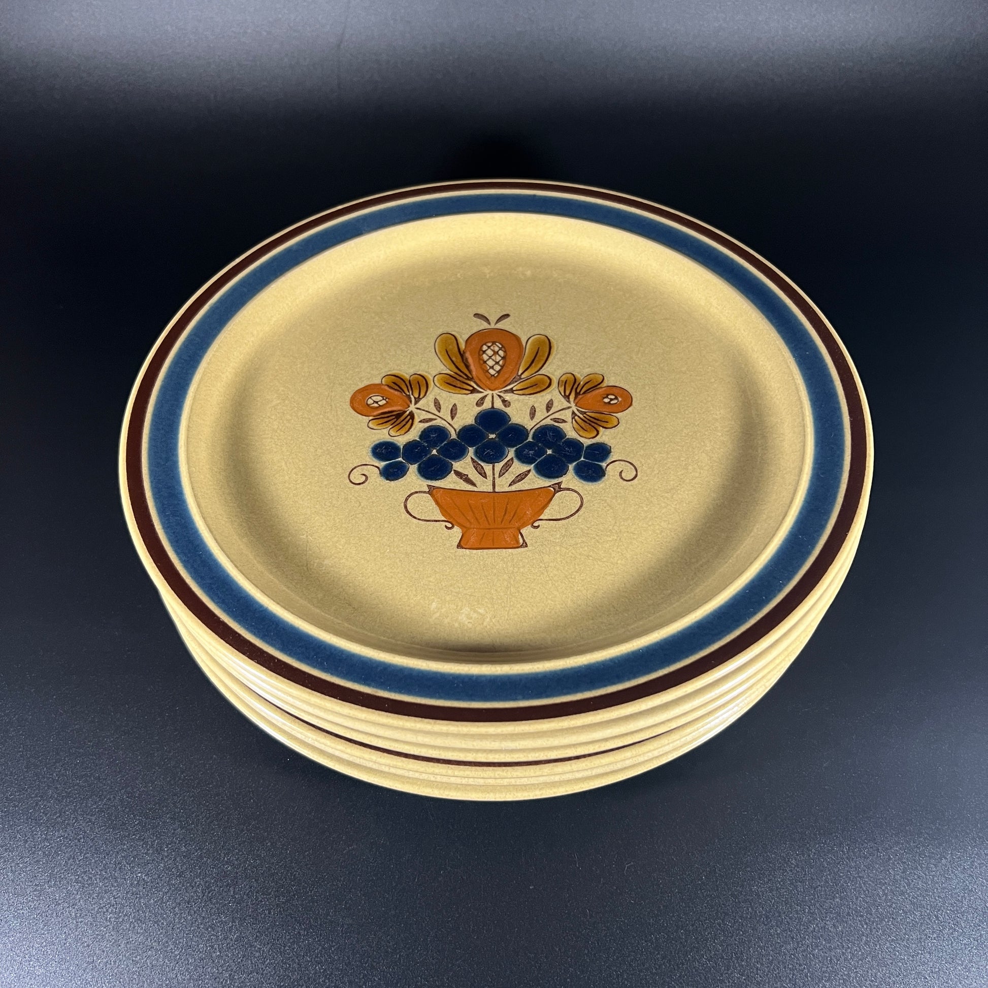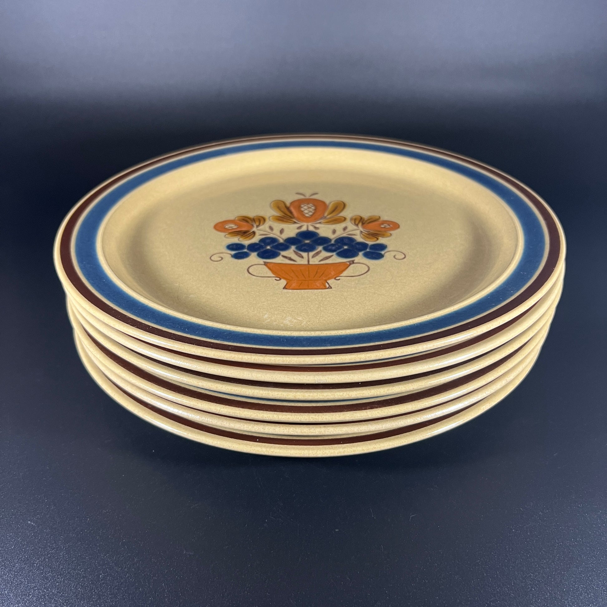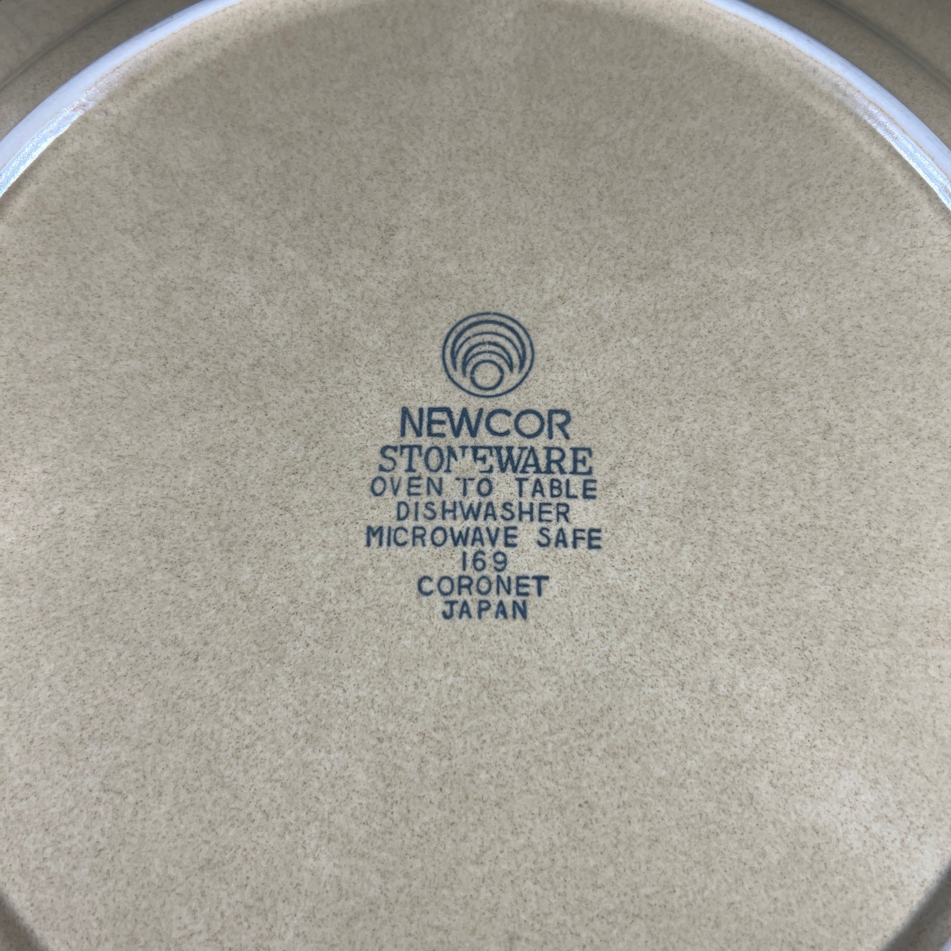 Enhance your dinnerware collection with this set of six vintage Newcor dinner plates (#169), a beautiful example of mid-century modern design. These stoneware plates feature a charming hand-painted pattern in beige, brown, and blue, adding a warm, artistic touch to any table setting. The round plates are in good vintage condition, ready for immediate use, and showcase the unique handmade quality of their era. Measuring approximately 1 inch in height and 10.75 inches in diameter, they are perfect for serving your favorite meals and will surely impress your guests with their timeless appeal.
