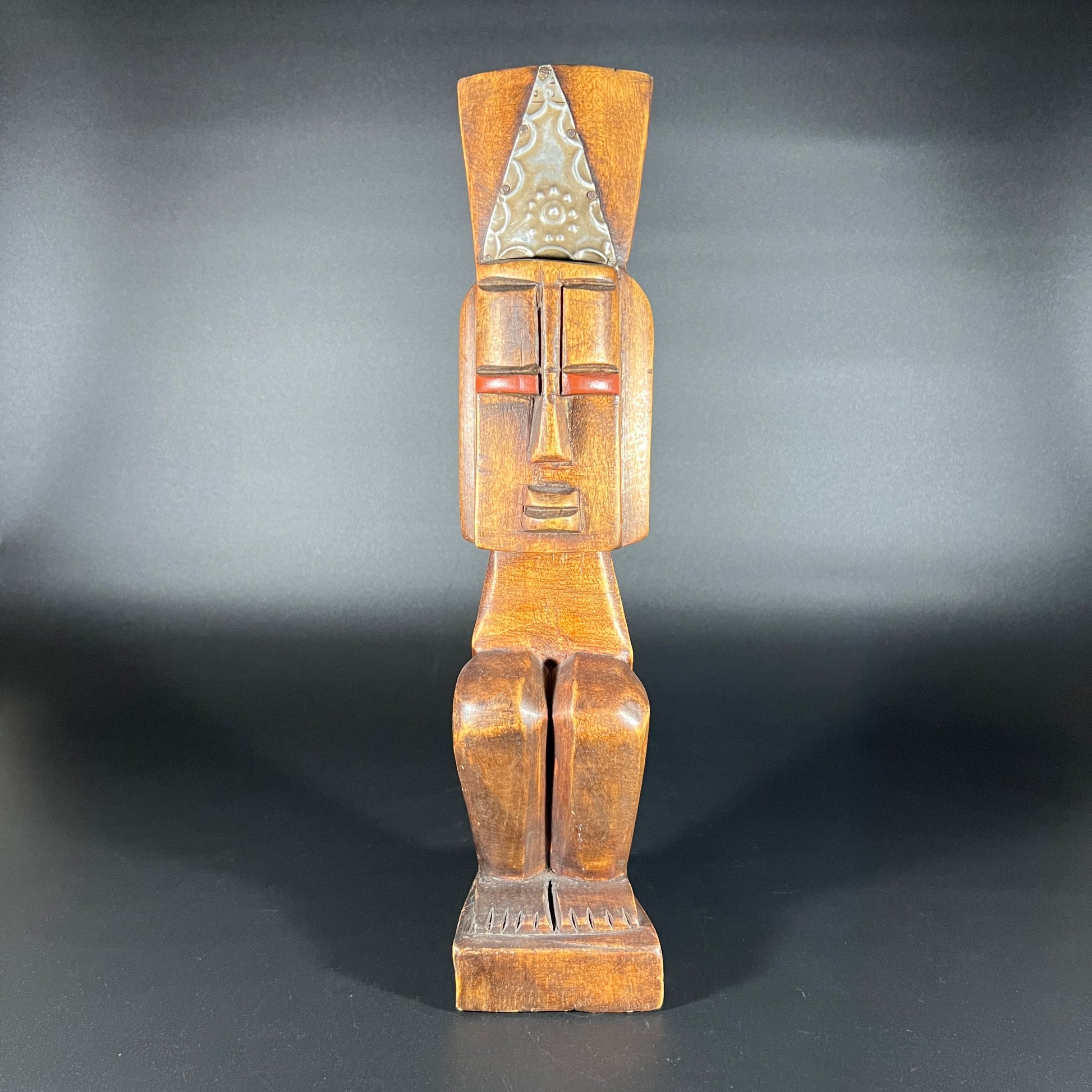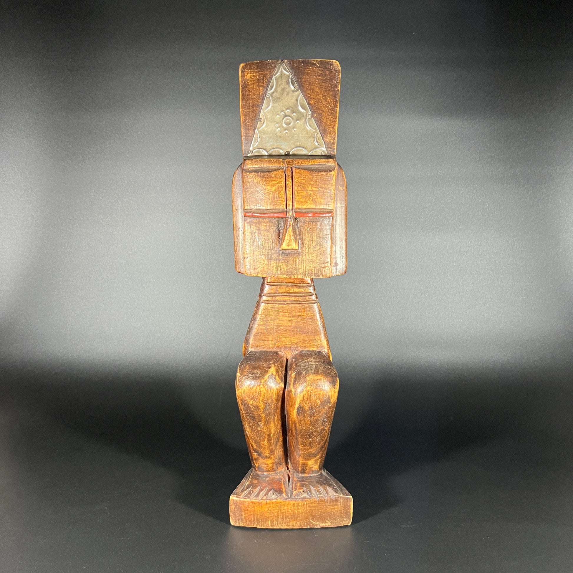 This vintage pair of hand-carved figures from Nigeria is crafted from wood, featuring red-painted eyelids and decorative metal crowns nailed to the tops. Both figures are in good vintage condition, with wear consistent with age. The taller figure, which has no lips, measures approximately 14.75" in height, 3.75" in width, and 3.75" in depth. The smaller figure, with lips, measures approximately 13.5" in height, 3" in width, and 3.5" in depth. A striking and authentic addition to any collection of African art or decor.