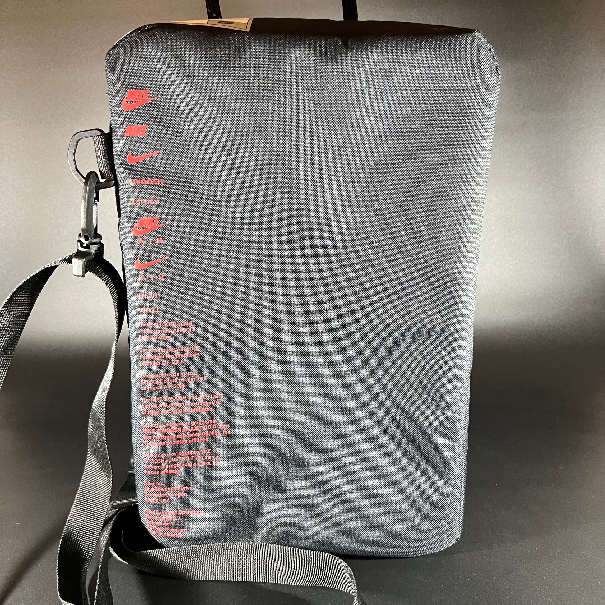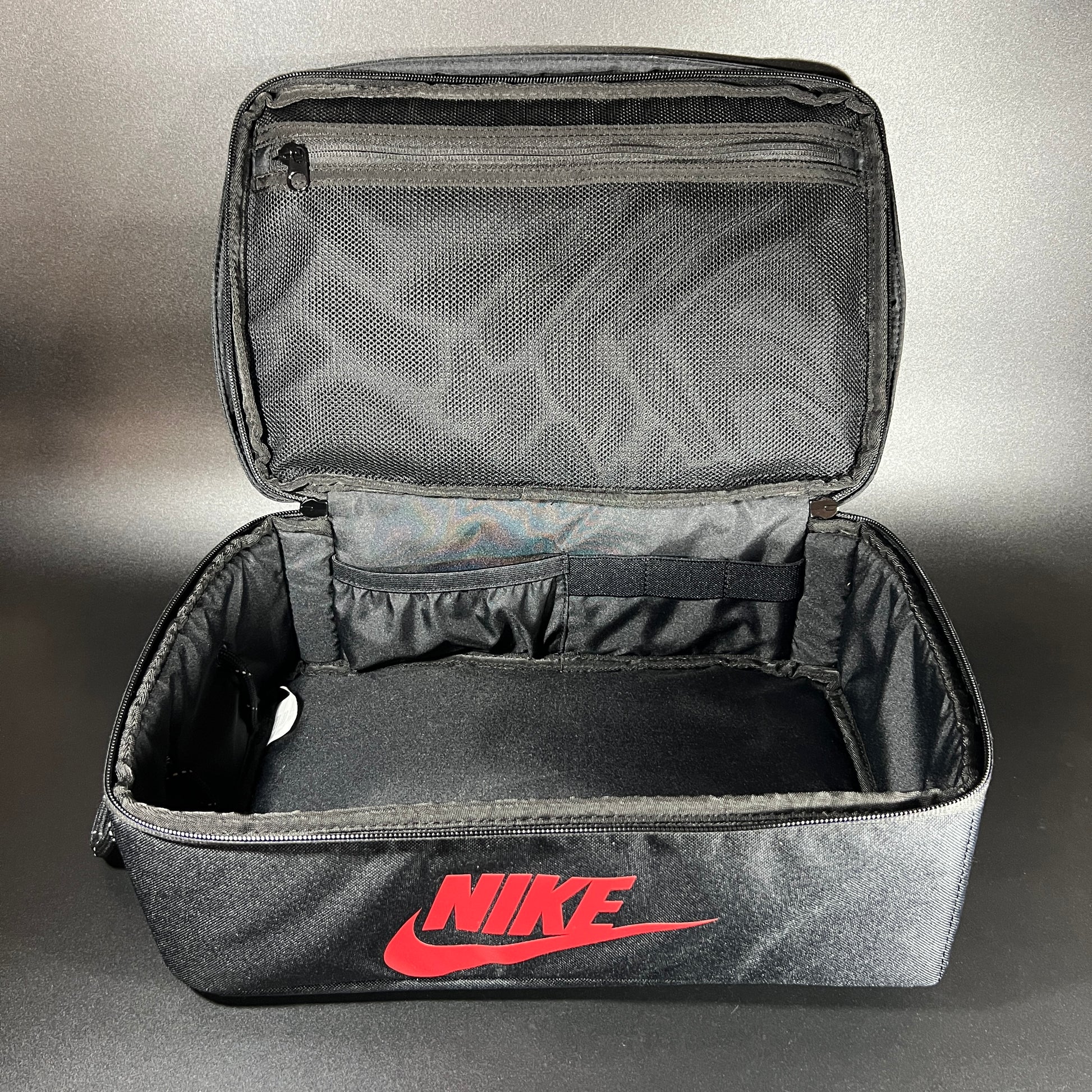 This Nike shoe bag is new, without tags, and has never been used. It features a convenient carrying strap and a special tag for personalization, adding a unique touch. In excellent condition, it offers both style and practicality. The bag measures approximately 14" in length, 9" in width, and 5" in height, making it the perfect accessory for keeping your shoes organized and protected.