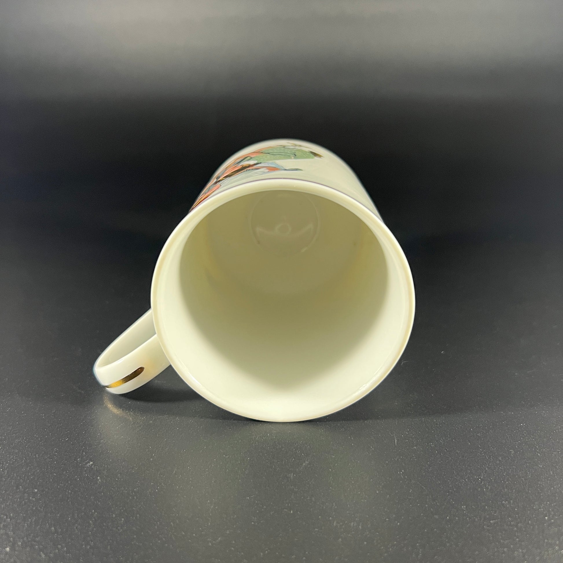 This vintage Norman Rockwell mug, titled "Knuckles Down", features a charming scene of three kids playing marbles on the floor, capturing a moment of childhood innocence. The fine porcelain mug is adorned with gold edging. Produced by The Danbury Mint as part of the 12 Norman Rockwell Porcelain Mugs collection, this piece dates back to September 1981. Perfect for collectors, display, or gifting. In good vintage condition, with no chips or cracks. The mug measures approximately 5" H x 4.75" W (with handle) x 3.25" in diameter.