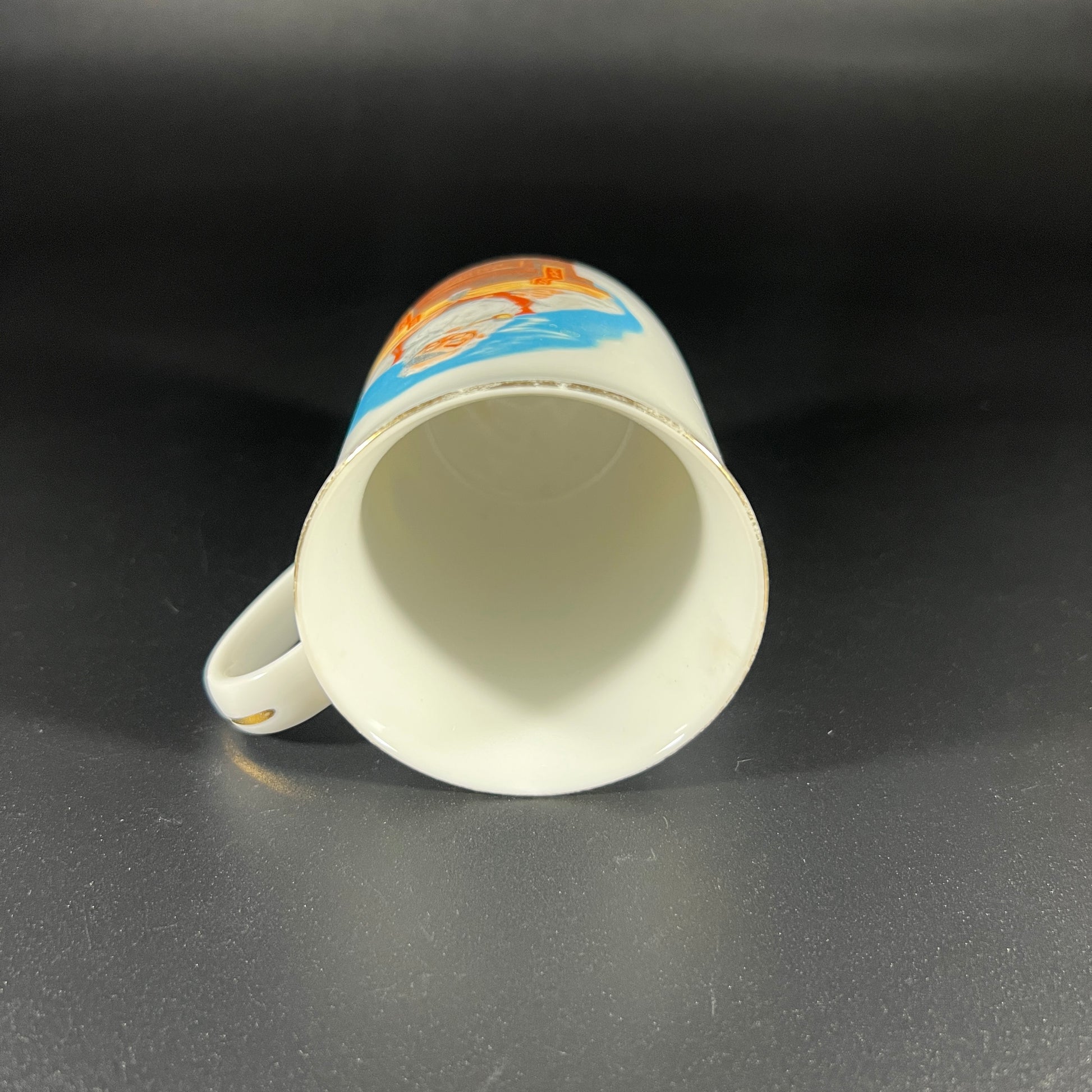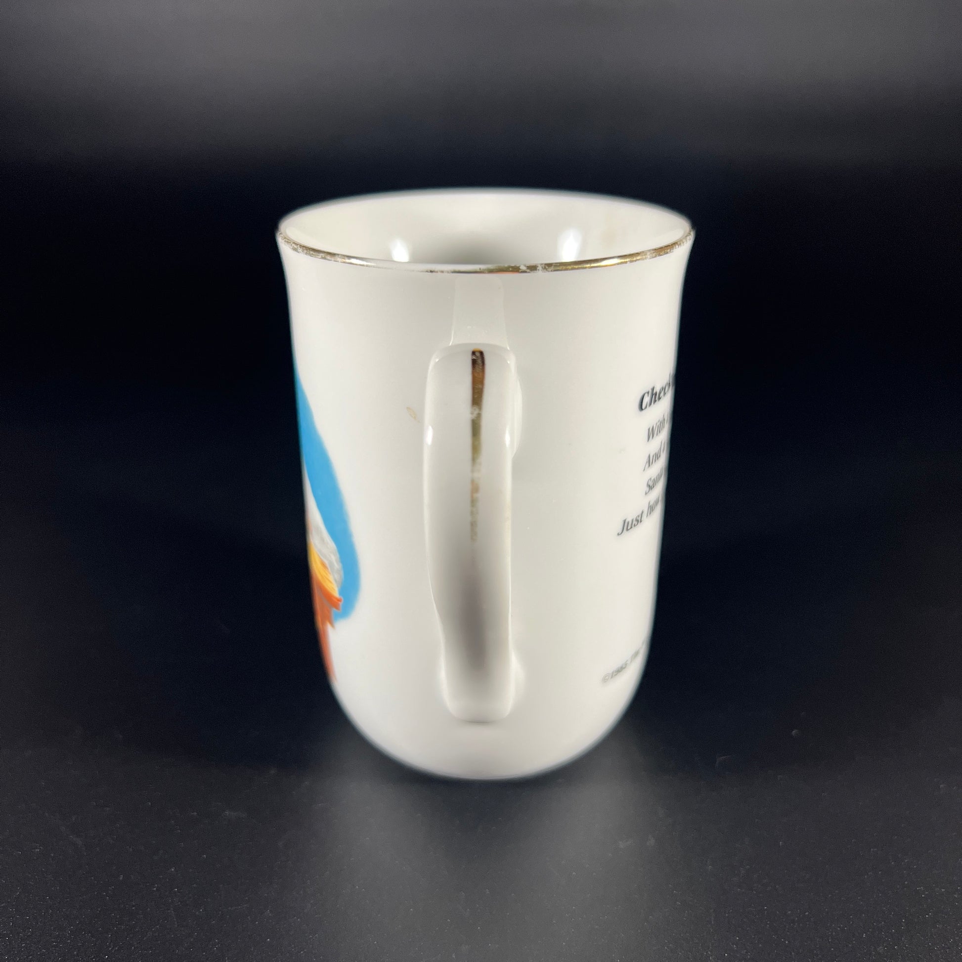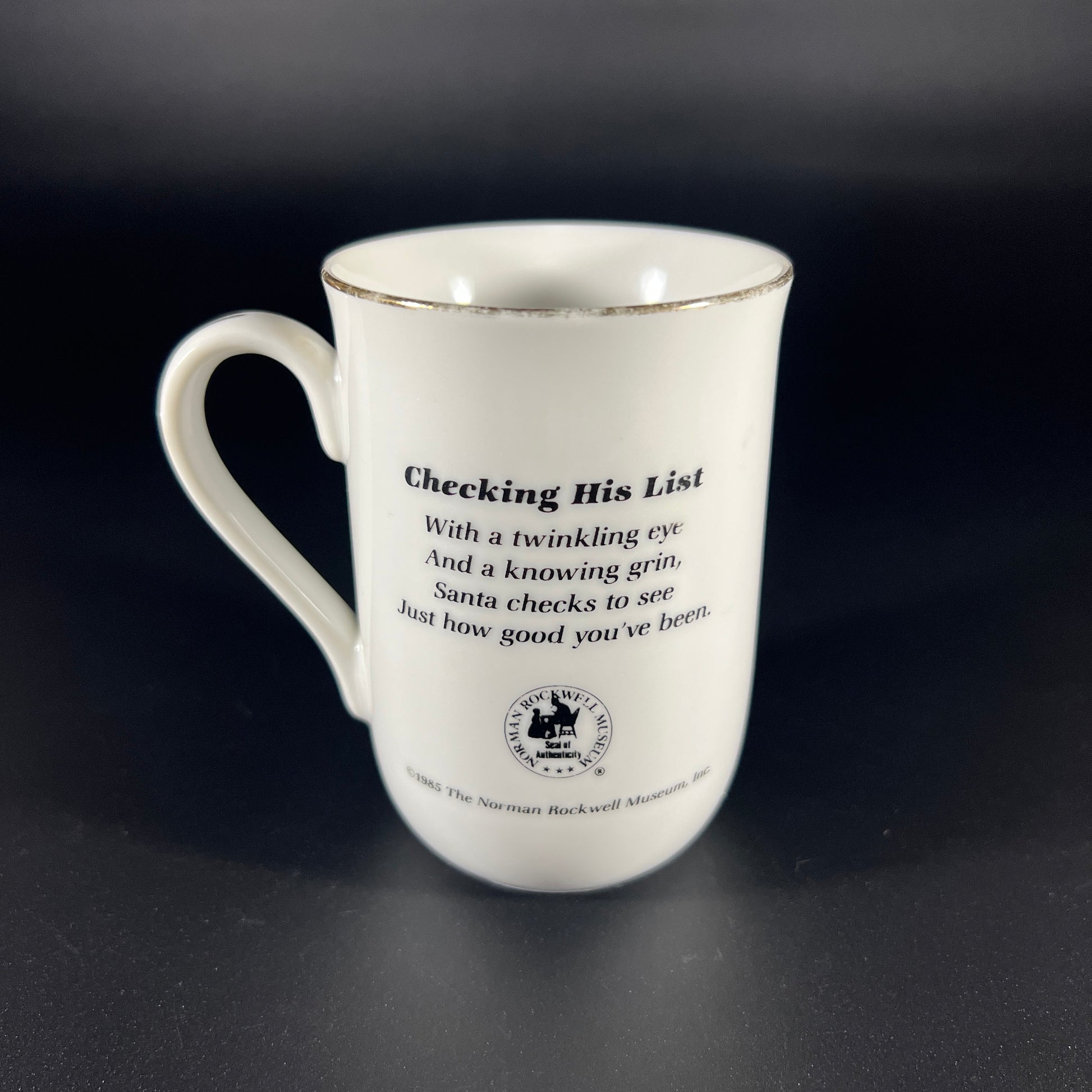 Vintage 1985 Norman Rockwell Museum Porcelain Mug titled "Checking His List". Featuring a classic Rockwell illustration of Santa Claus sitting with a book and pen in hand, wearing his signature cap and smoking a pipe. The mug is crafted in white porcelain with elegant gold trim. In good vintage condition, with wear consistent with age. Please review the photos for additional details. The mug measures approximately 4.25" H x 4" W (including the handle) x 2.75" in diameter.