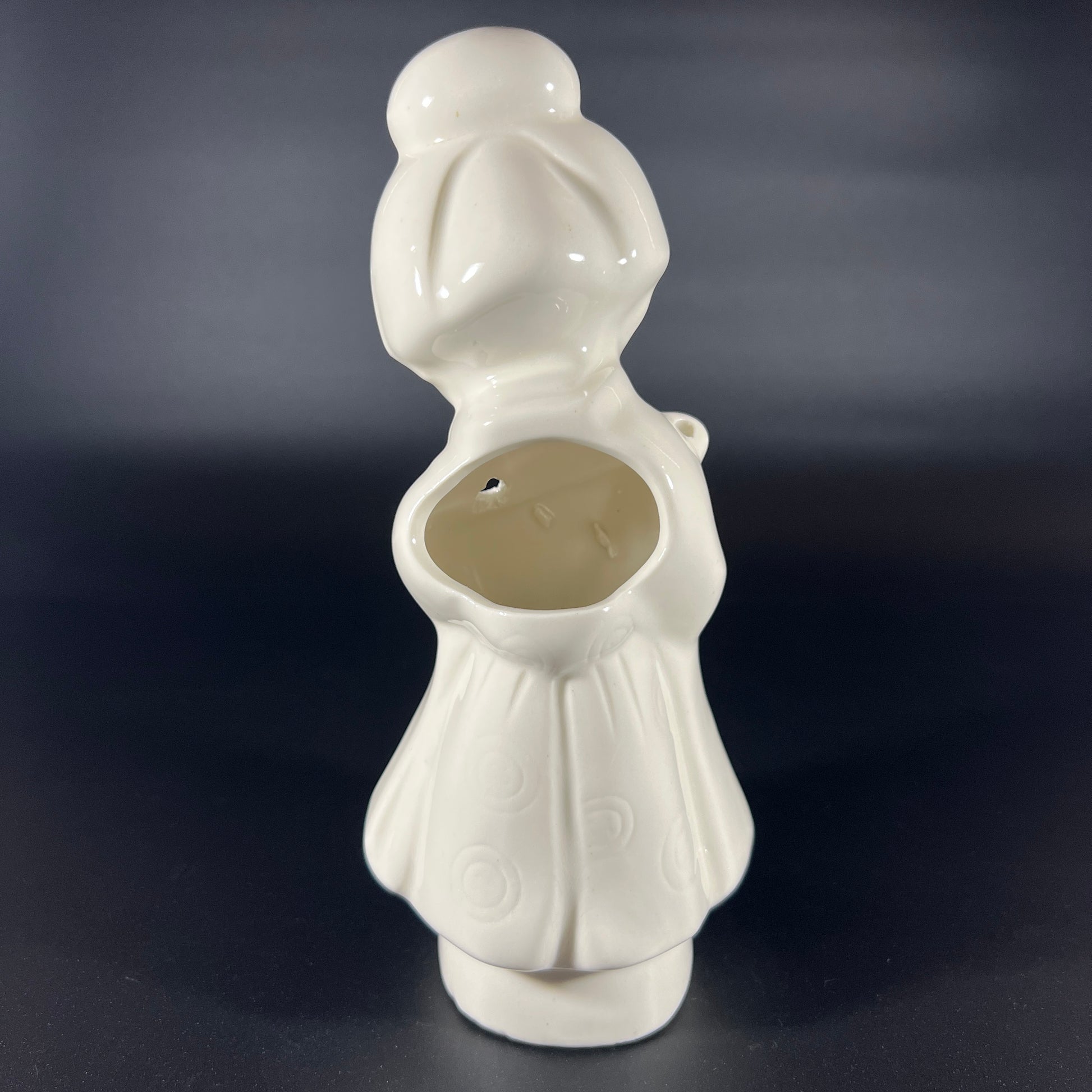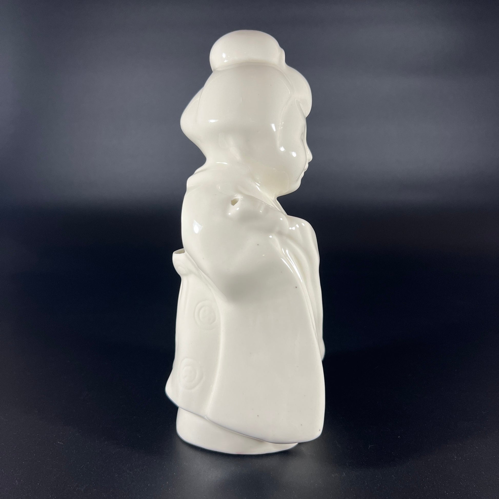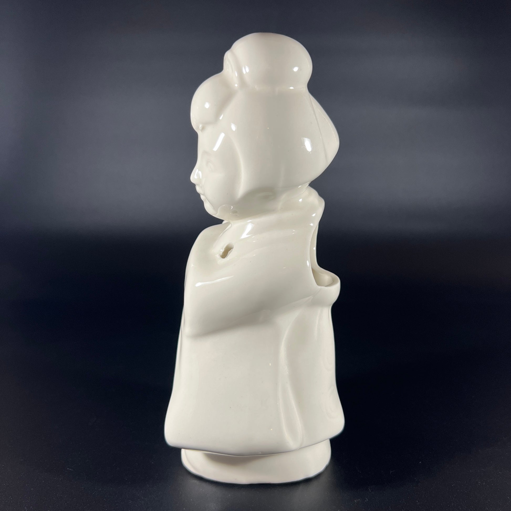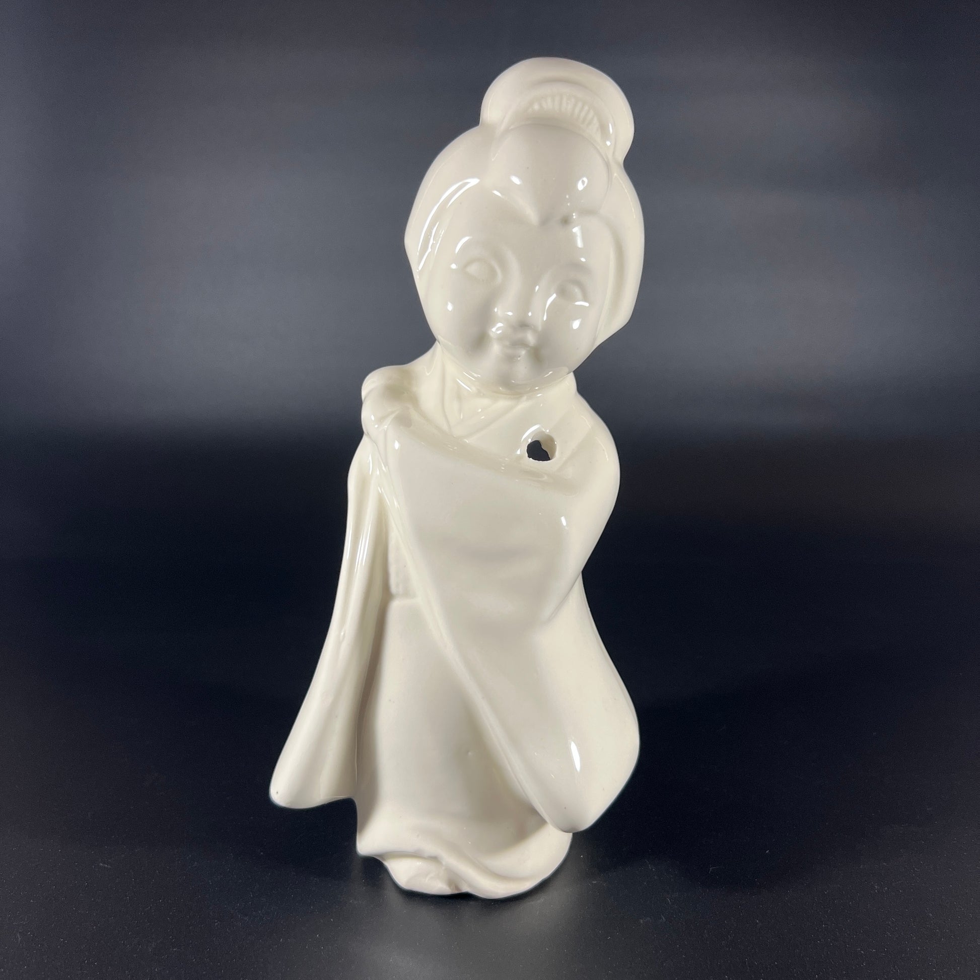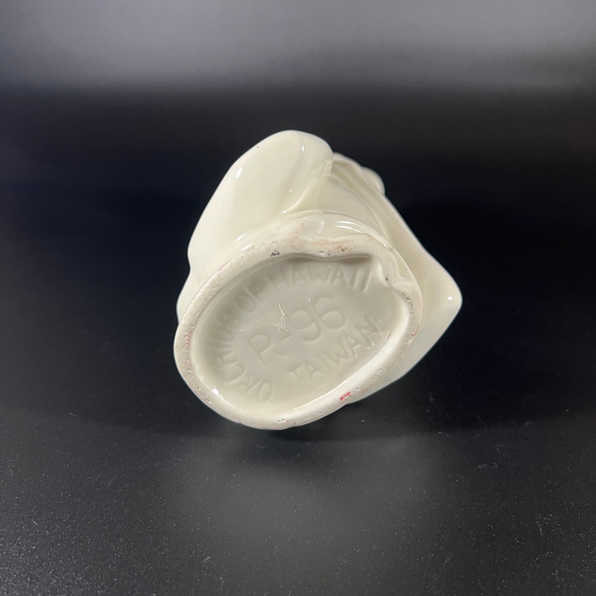 This vintage Orchids of Hawaii Geisha white restaurant mug, made in Japan, is a beautiful and unique piece. It is numbered R-96. The Geisha has a serene expression, with her hands gracefully holding a tiki drink parasol. There is a hole in the back to accommodate a cocktail umbrella, and another hole in the front for a straw. In excellent vintage condition for its age, the mug shows no signs of damage. Please refer to the photos for more details. The mug measures approximately 8.5" H x 3.75" W x 3.5" D.