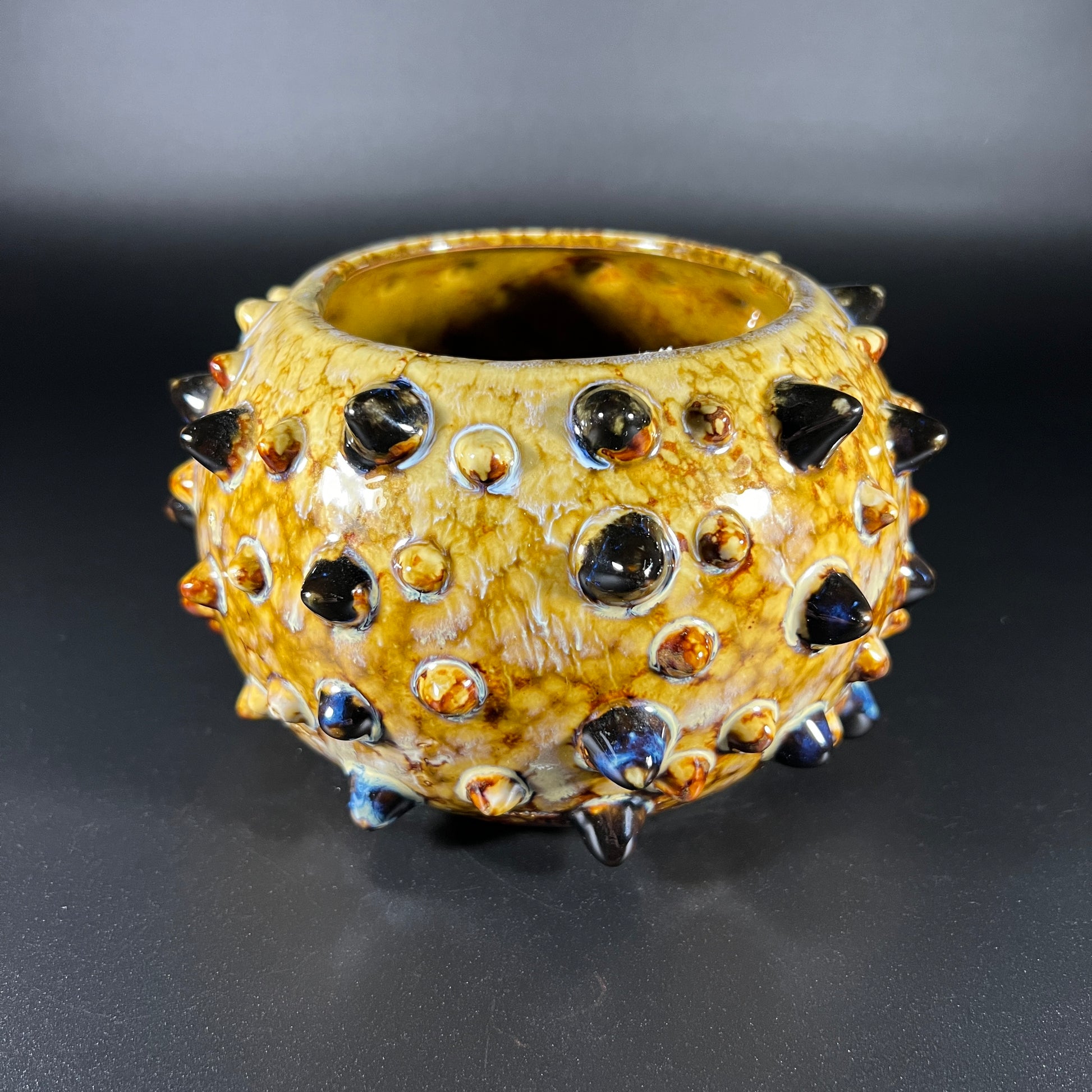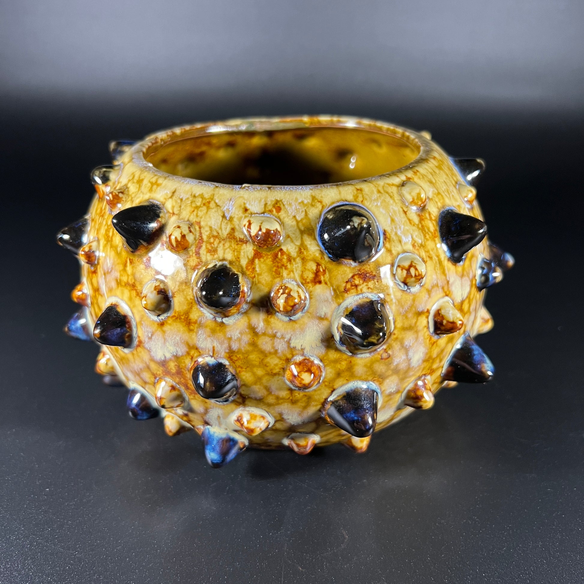 This striking vintage pottery bowl looks as if it was designed to resemble a puffer fish, featuring a spiky, hobnail texture and rich earth-tone glazes. Both artistic and functional, it serves as a perfect statement piece for any collection or decor. The bowl is artist-stamped on the bottom with the mark "7DO85." In excellent vintage condition with no issues, this bowl showcases a beautiful blend of craftsmanship and creativity. It measures 4" H, with a 7" diameter and a 4" opening.