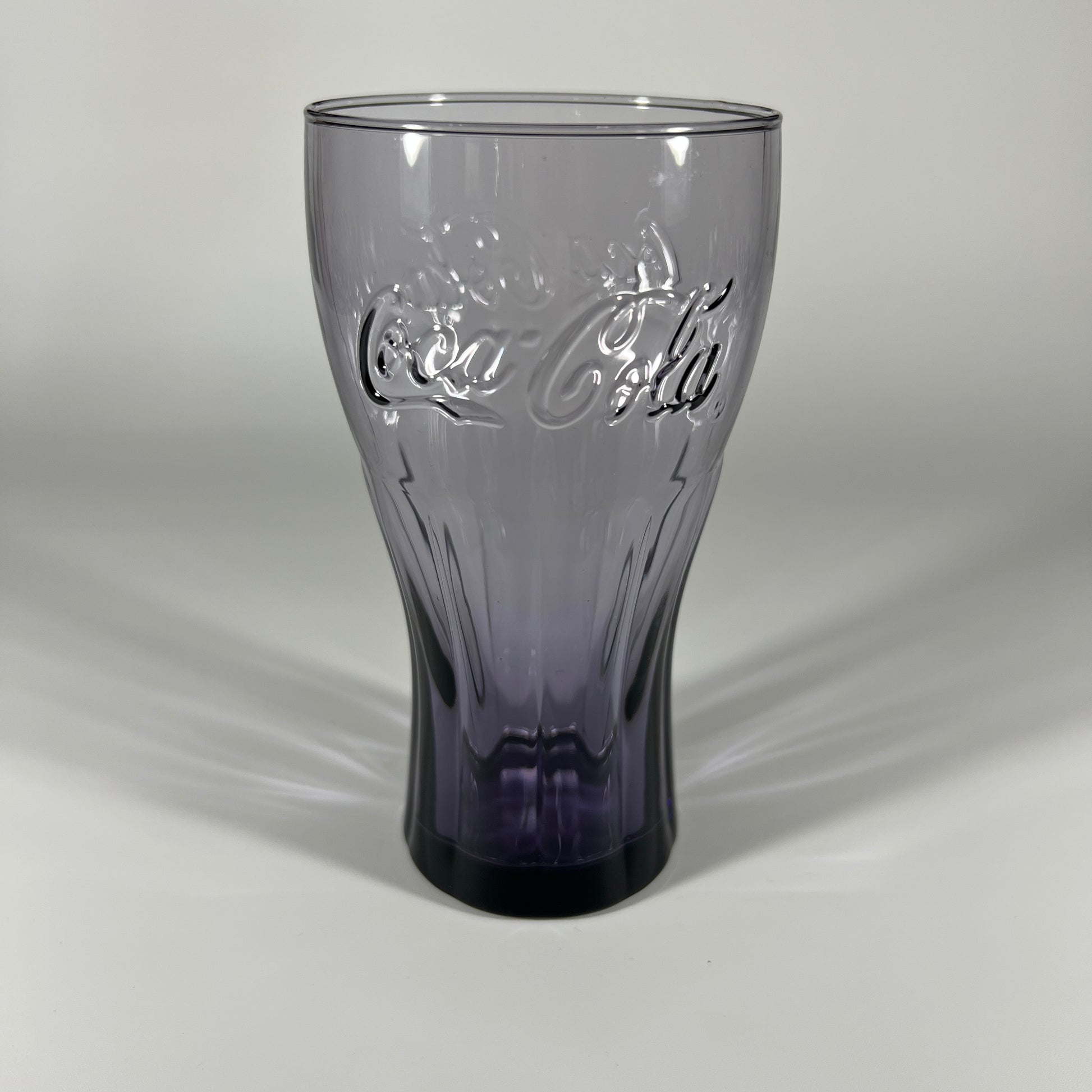 This Coca-Cola glass features a rich purple color, complete with embossed raised lettering for a vintage touch. It stands approximately 6.25 inches tall and has a diameter of 3.5 inches, making it the perfect size for enjoying your favorite drink. A must-have for any Coca-Cola collector or memorabilia enthusiast!