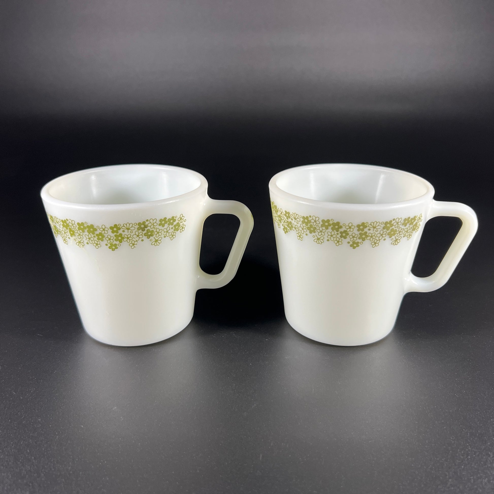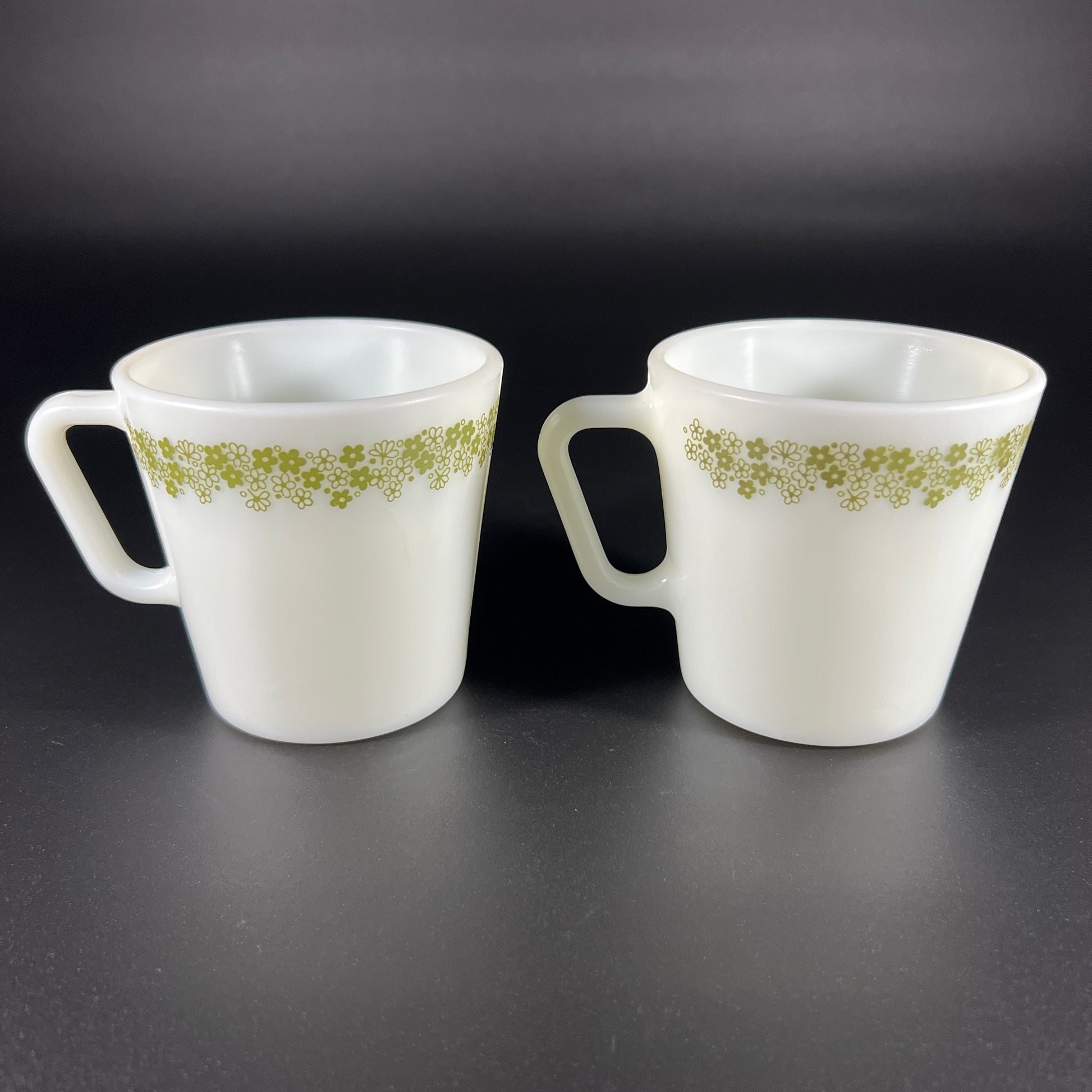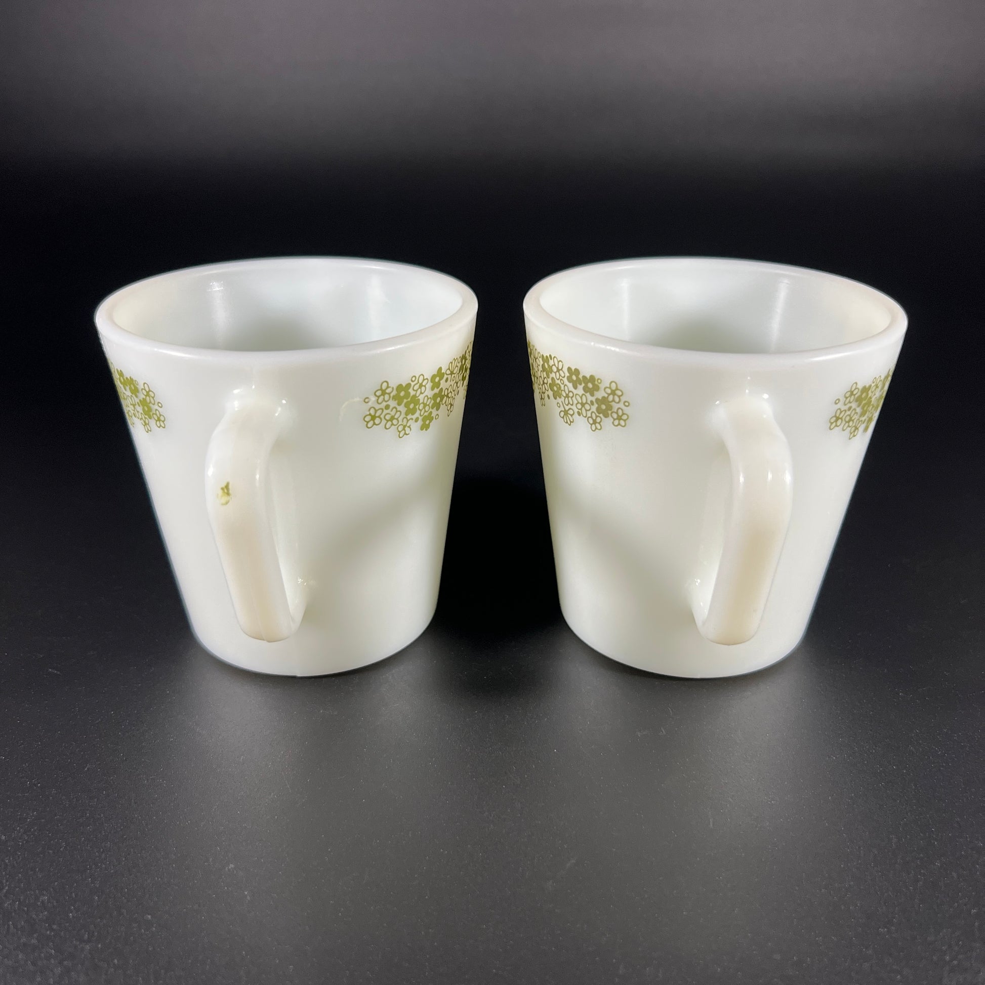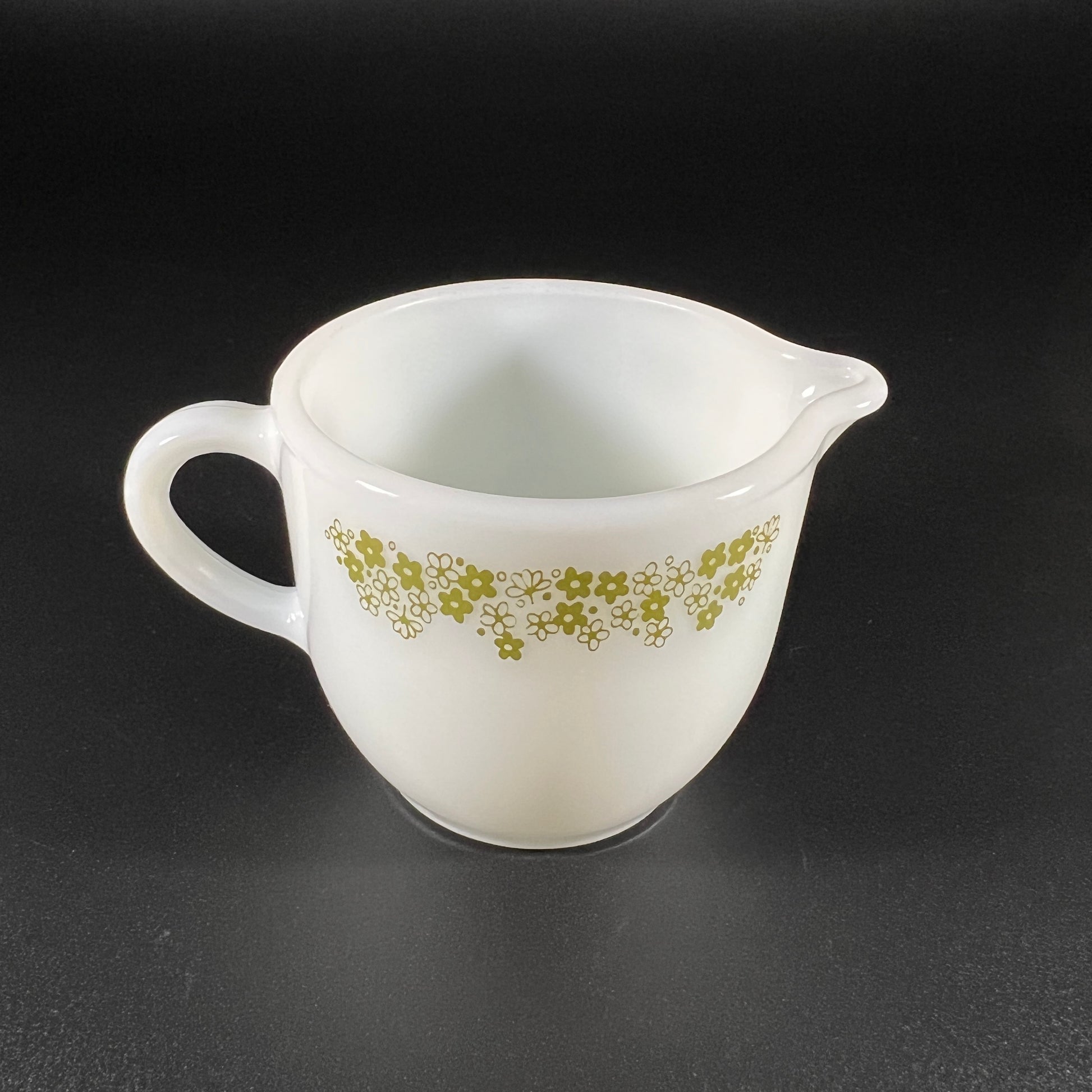 This vintage Pyrex Corning coffee set from the 1970s features the charming Spring Blossom Green "Crazy Daisy" design pattern. The set includes two mugs, a creamer, and a sugar bowl, all in excellent vintage condition. The mugs measure approximately 3.5" H x 4.5" W (with handles) x 3.5" D, the creamer is 2.75" H x 4.5" W (with handle) x 3" D, and the sugar bowl is 2.5" H x 3.75" in diameter. This lovely set would make a delightful addition to any collection or a stylish way to serve coffee.