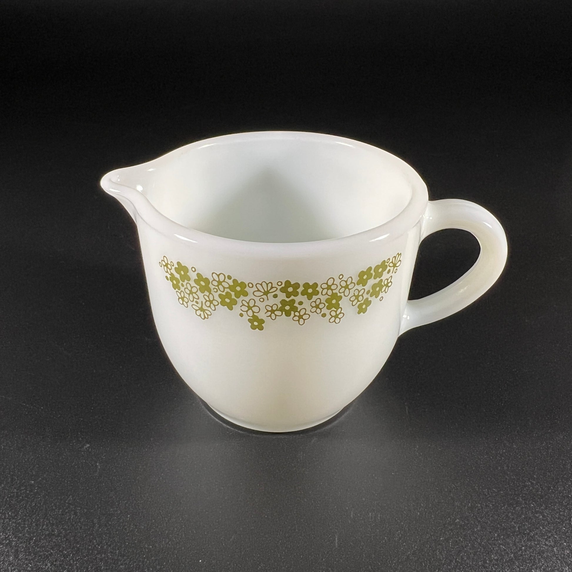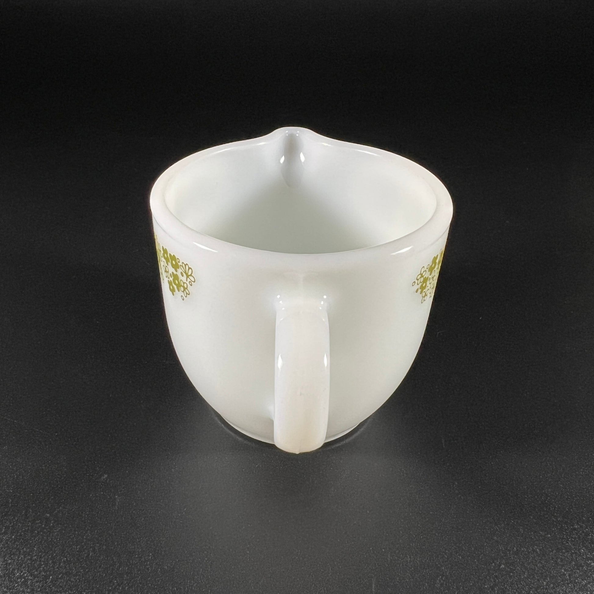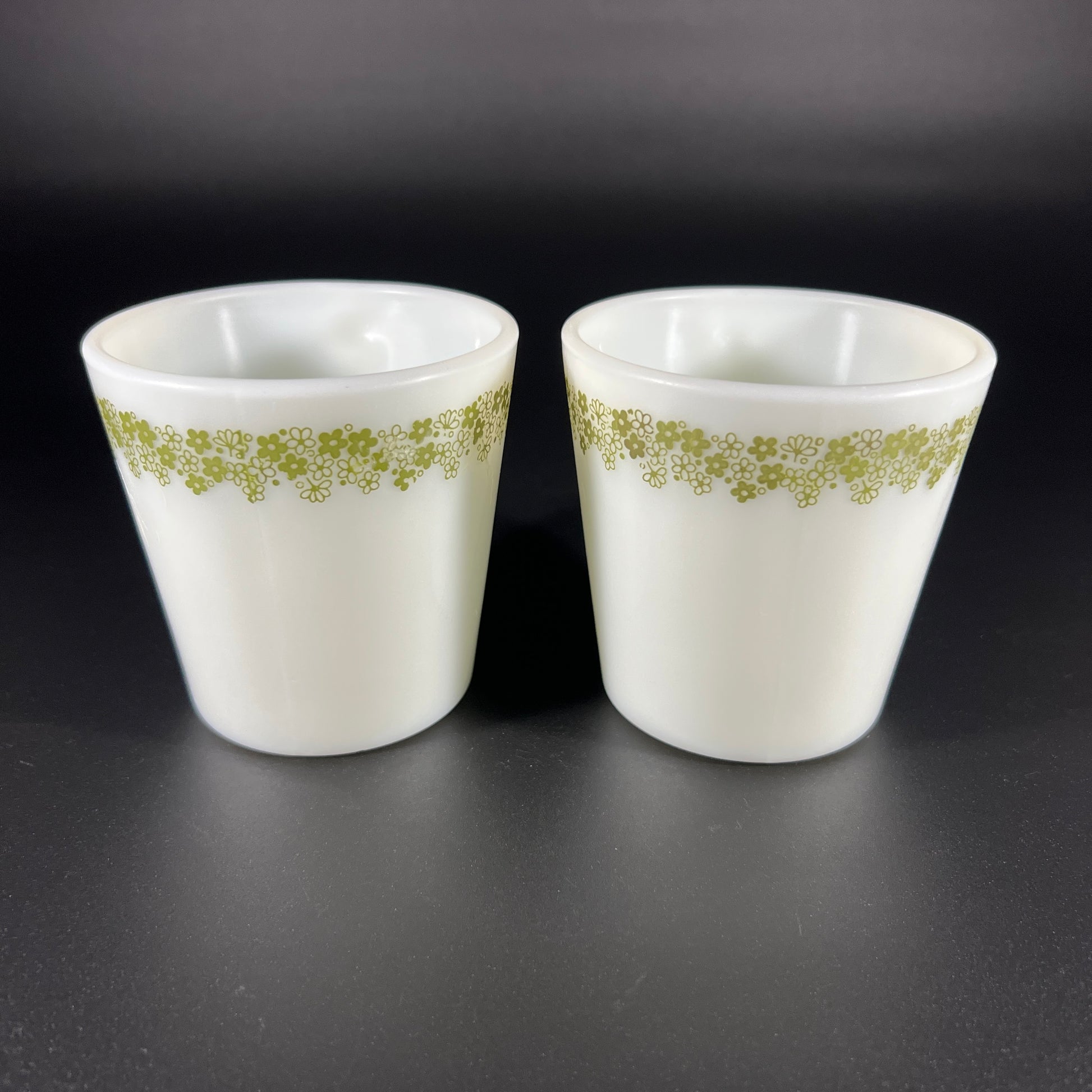 This vintage Pyrex Corning coffee set from the 1970s features the charming Spring Blossom Green "Crazy Daisy" design pattern. The set includes two mugs, a creamer, and a sugar bowl, all in excellent vintage condition. The mugs measure approximately 3.5" H x 4.5" W (with handles) x 3.5" D, the creamer is 2.75" H x 4.5" W (with handle) x 3" D, and the sugar bowl is 2.5" H x 3.75" in diameter. This lovely set would make a delightful addition to any collection or a stylish way to serve coffee.