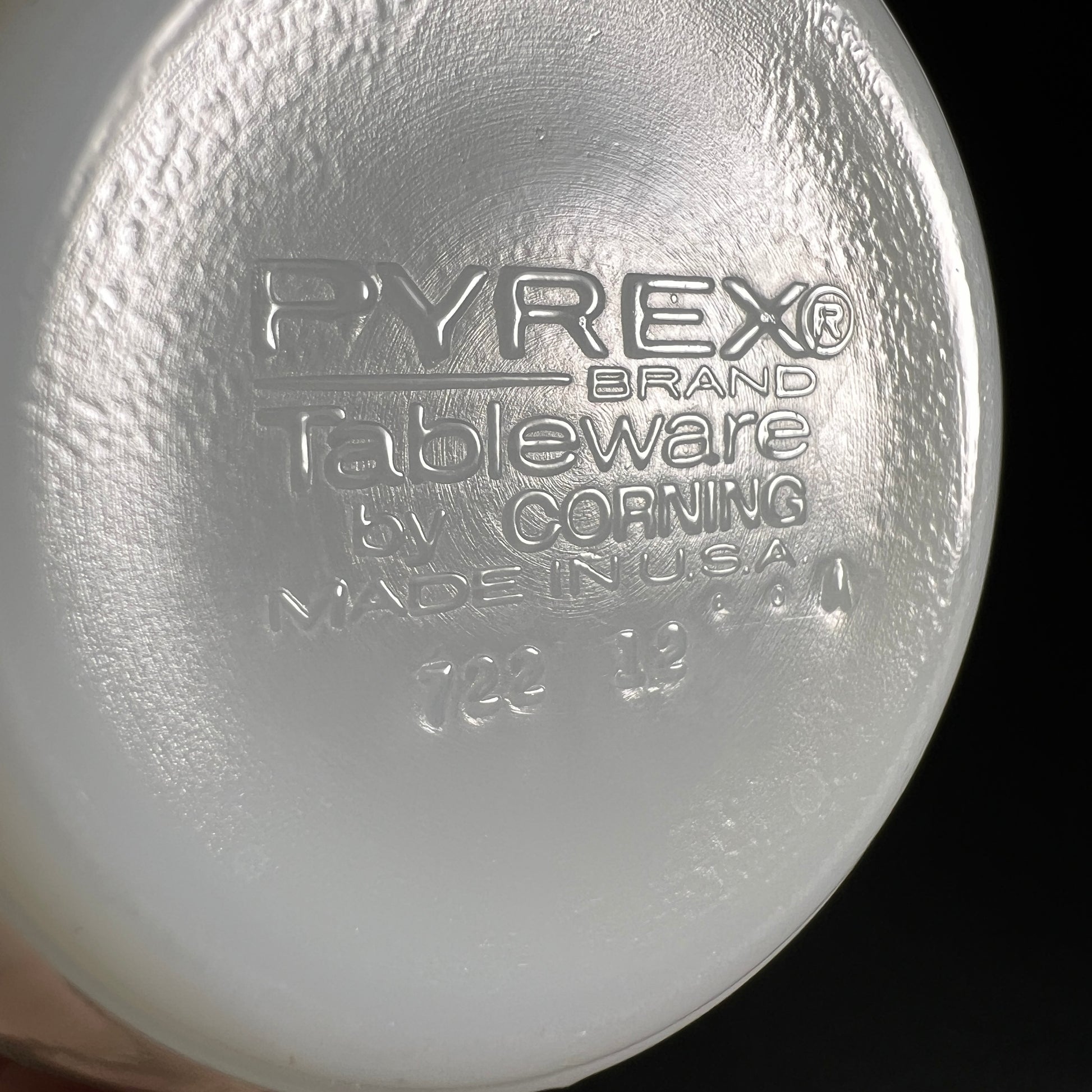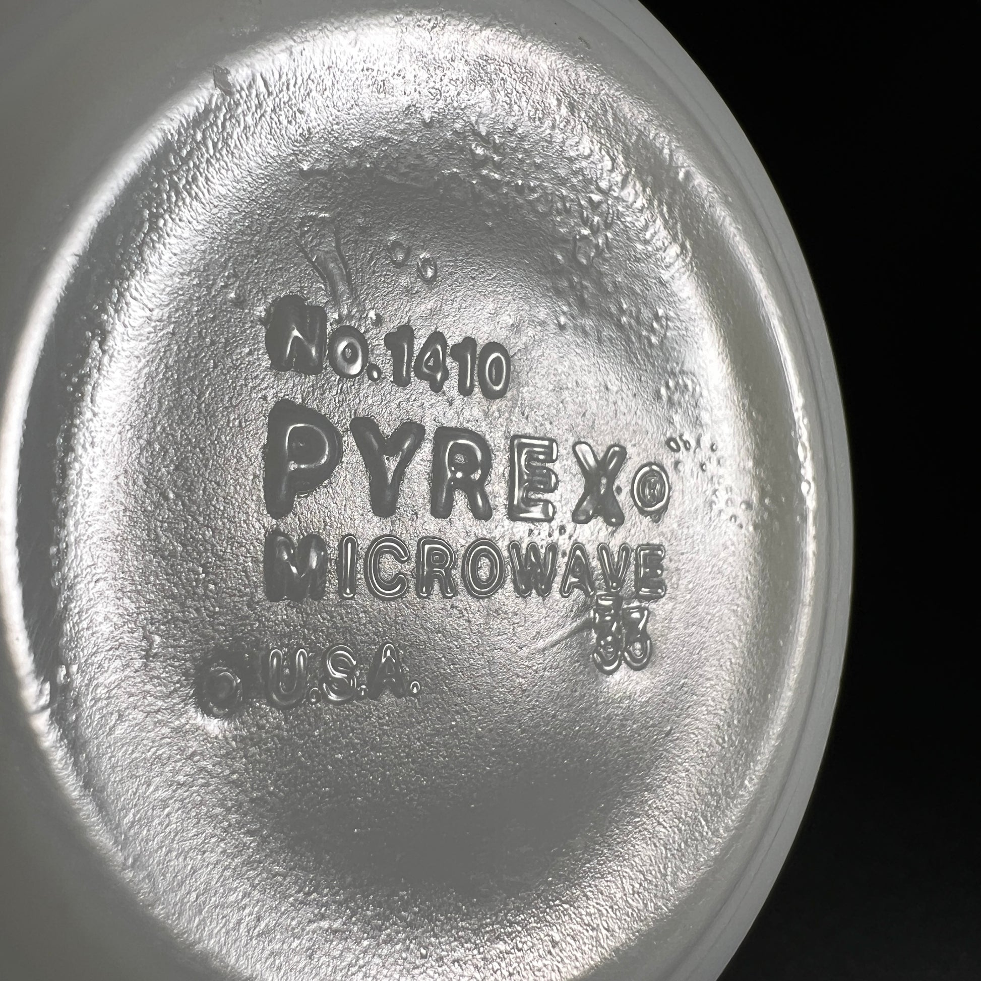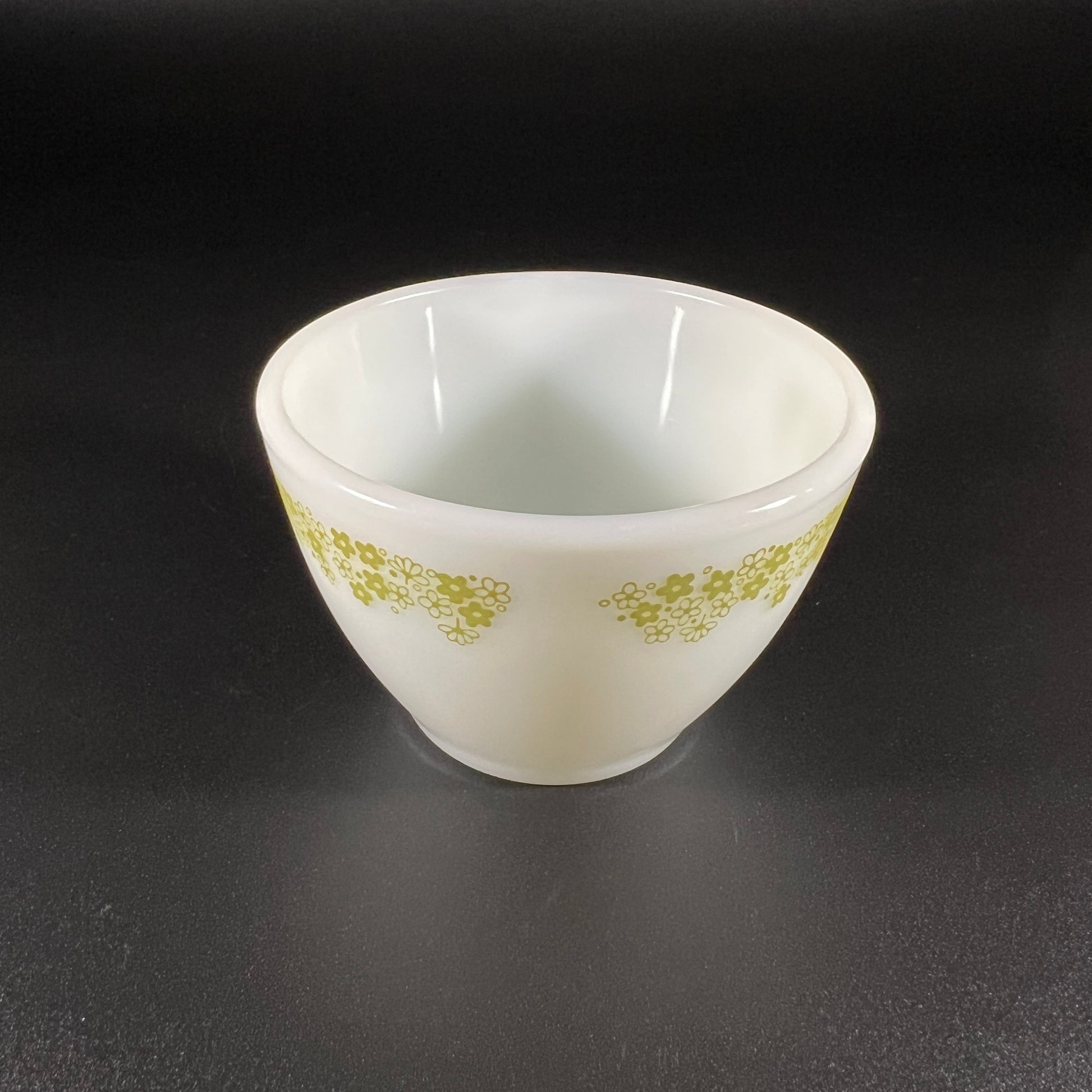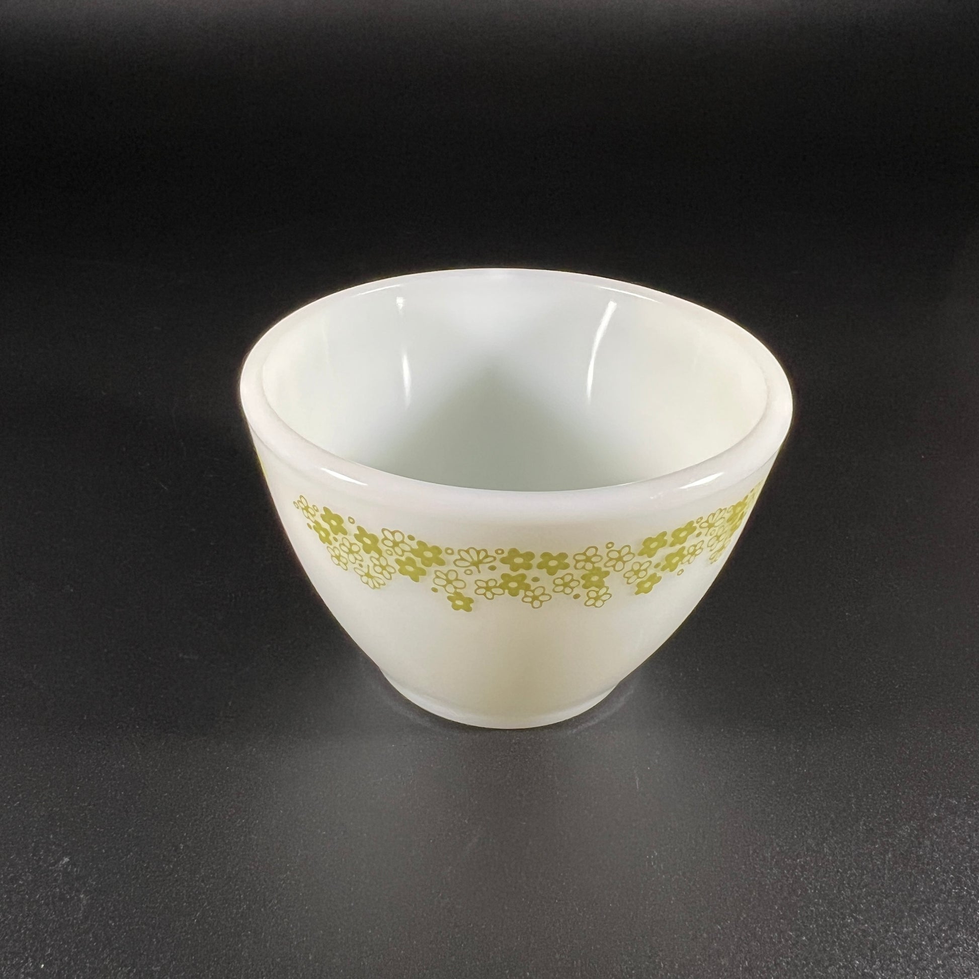 This vintage Pyrex Corning coffee set from the 1970s features the charming Spring Blossom Green "Crazy Daisy" design pattern. The set includes two mugs, a creamer, and a sugar bowl, all in excellent vintage condition. The mugs measure approximately 3.5" H x 4.5" W (with handles) x 3.5" D, the creamer is 2.75" H x 4.5" W (with handle) x 3" D, and the sugar bowl is 2.5" H x 3.75" in diameter. This lovely set would make a delightful addition to any collection or a stylish way to serve coffee.