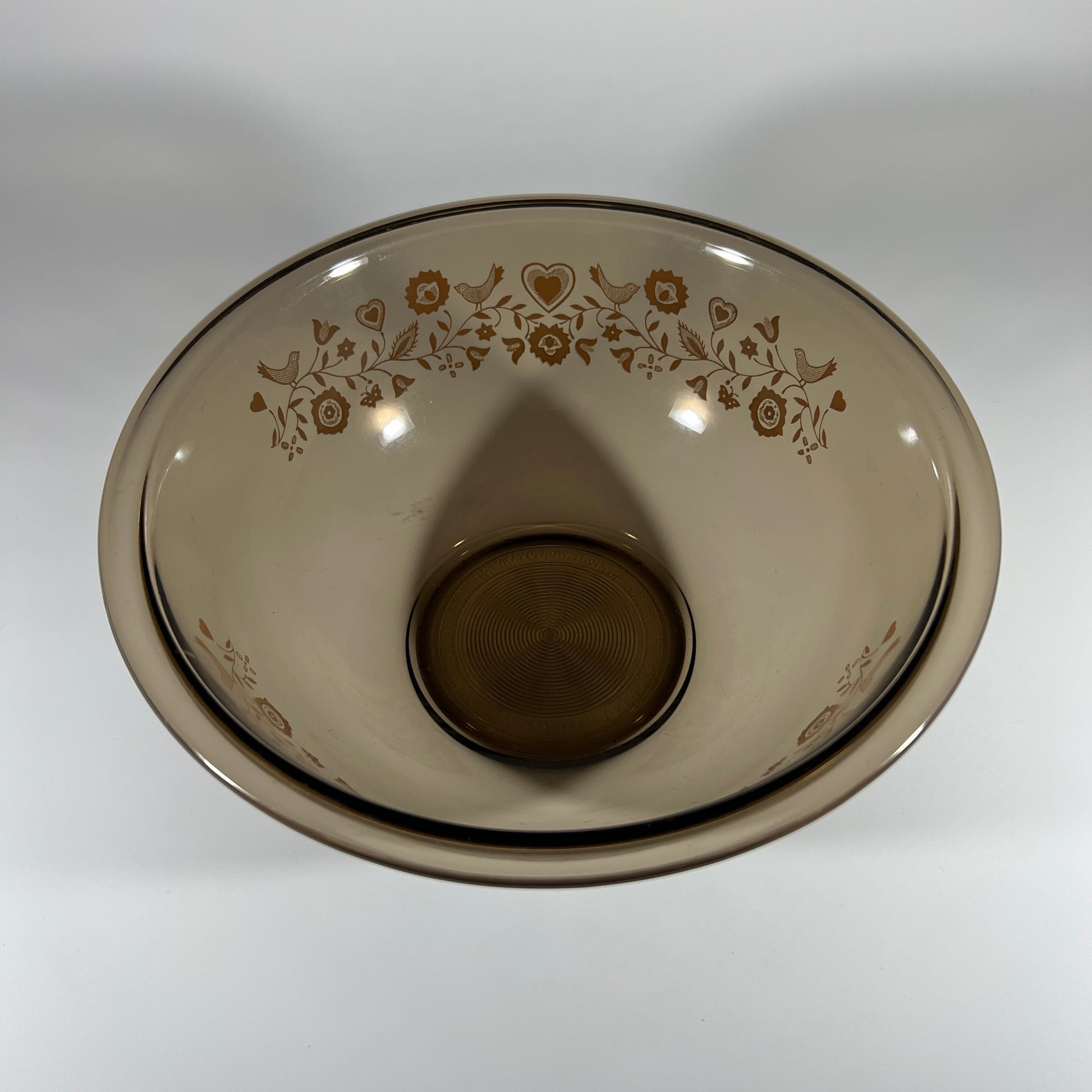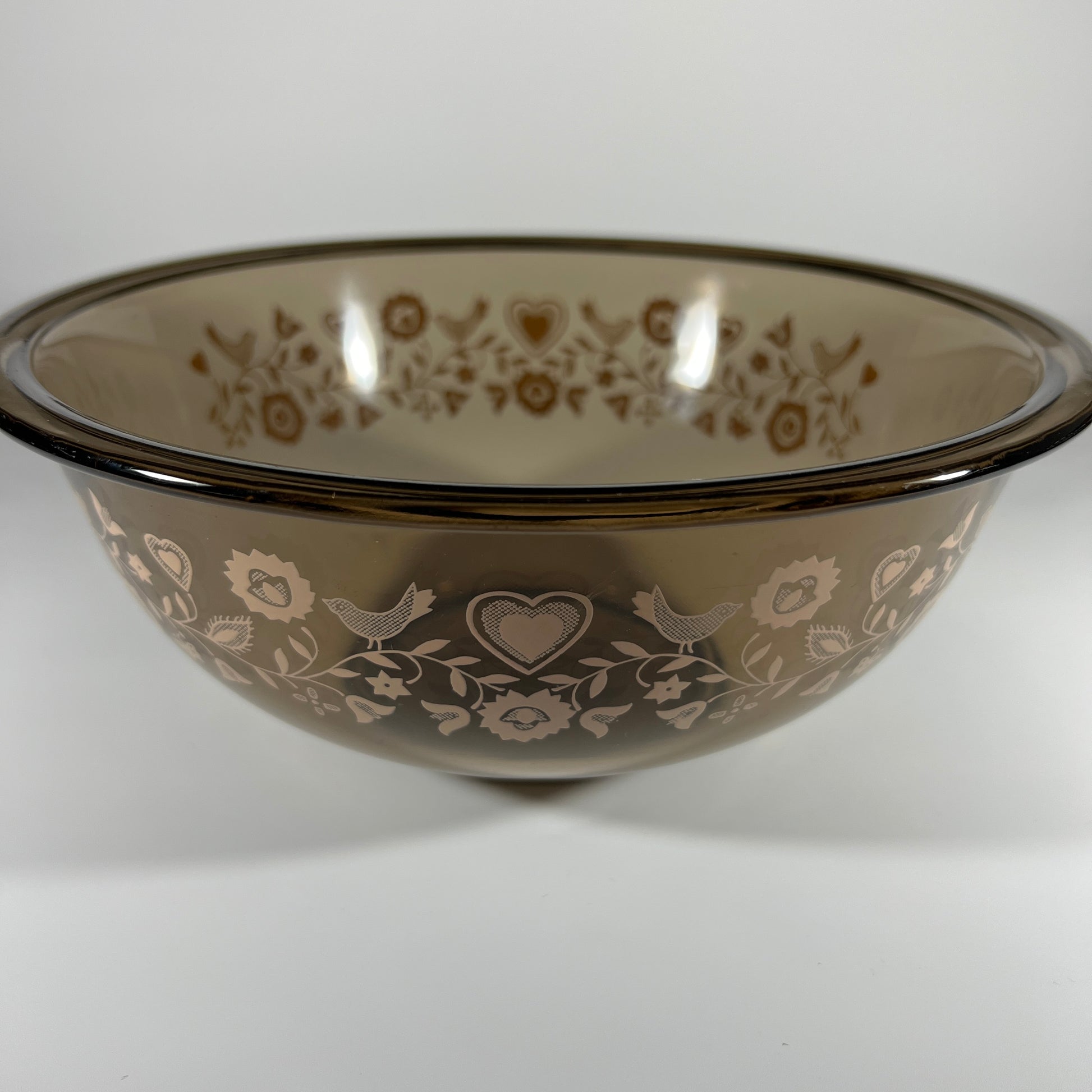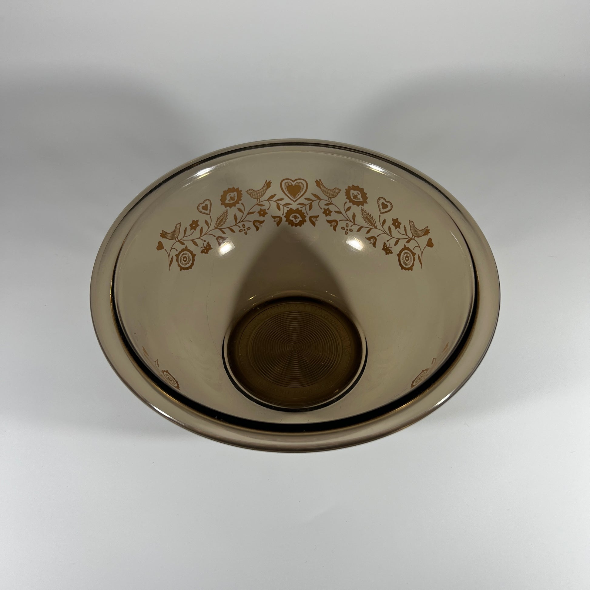 This vintage Pyrex Festive Harvest bowl set features a charming design of pink birds, flowers, and hearts on a rich brown glass background. The set includes three bowls, each in good vintage condition with vibrant colors and no significant damage. The large bowl measures approximately 4 inches in height and 10 inches in diameter, the medium bowl is about 3.5 inches in height and 8.5 inches in diameter, and the small bowl stands at 3 inches in height with a diameter of 7 inches. This delightful set blends nostalgic appeal with practicality, making it a beautiful addition to any kitchen or collection.