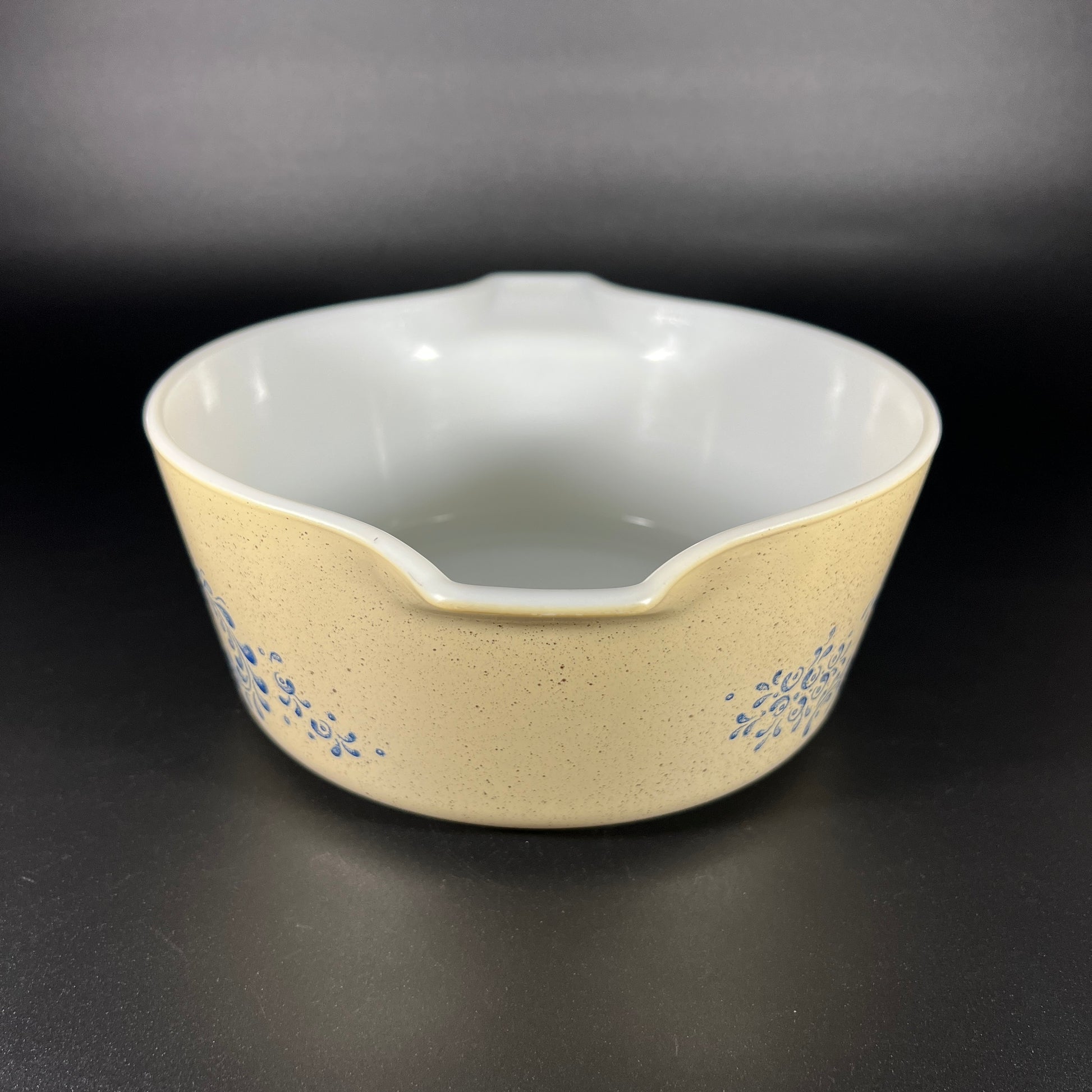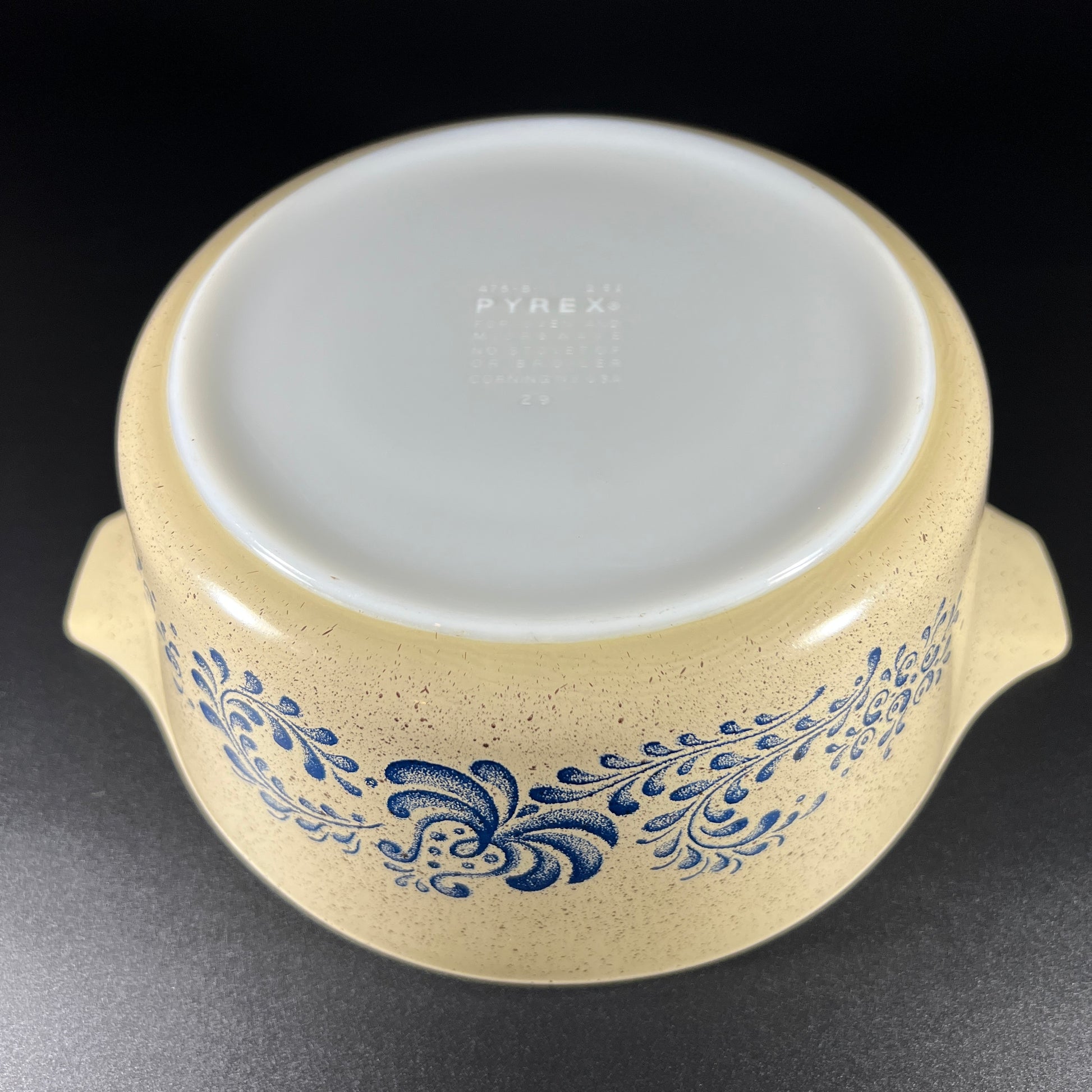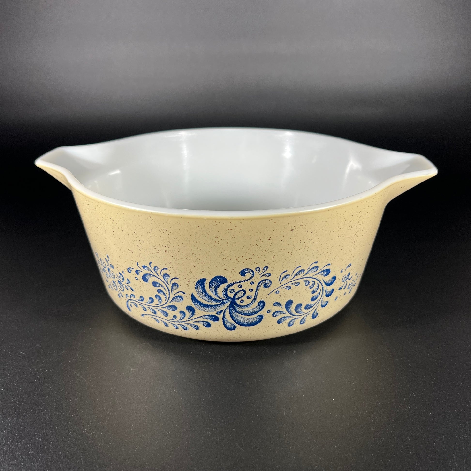 Vintage Pyrex Homestead Casserole Dish - 475-B, 2 1/2 Quart. This stunning piece features a deep blue floral design on a speckled beige background, capturing the charm of country living. Released in 1976, the Homestead pattern was part of a series inspired by the growing interest in rustic, country-style decor. In good vintage condition, it measures 4" high, 10.75" wide, and 8.75" deep. Both pretty and practical, this dish is an excellent addition to any kitchen or Pyrex collection!