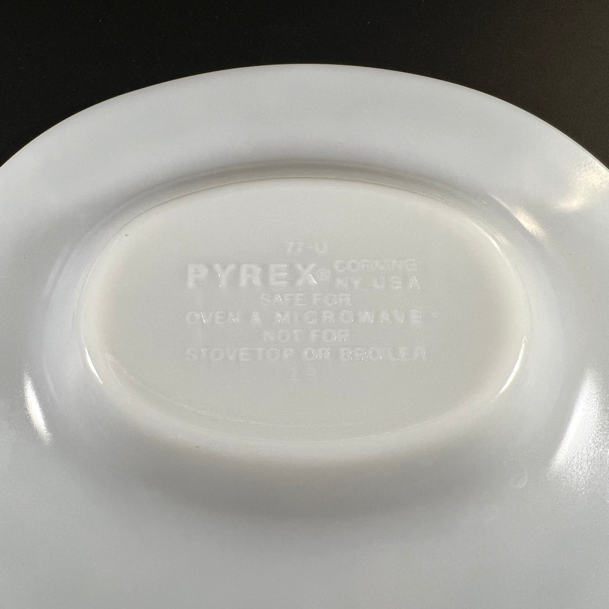 The bottom of the gravy boat is marked: "Pyrex Corning NY, USA, Safe for oven & microwave, not for stovetop or broiler. 13" 77-B & 77-U". This is a wonderful piece for any vintage Pyrex collector.