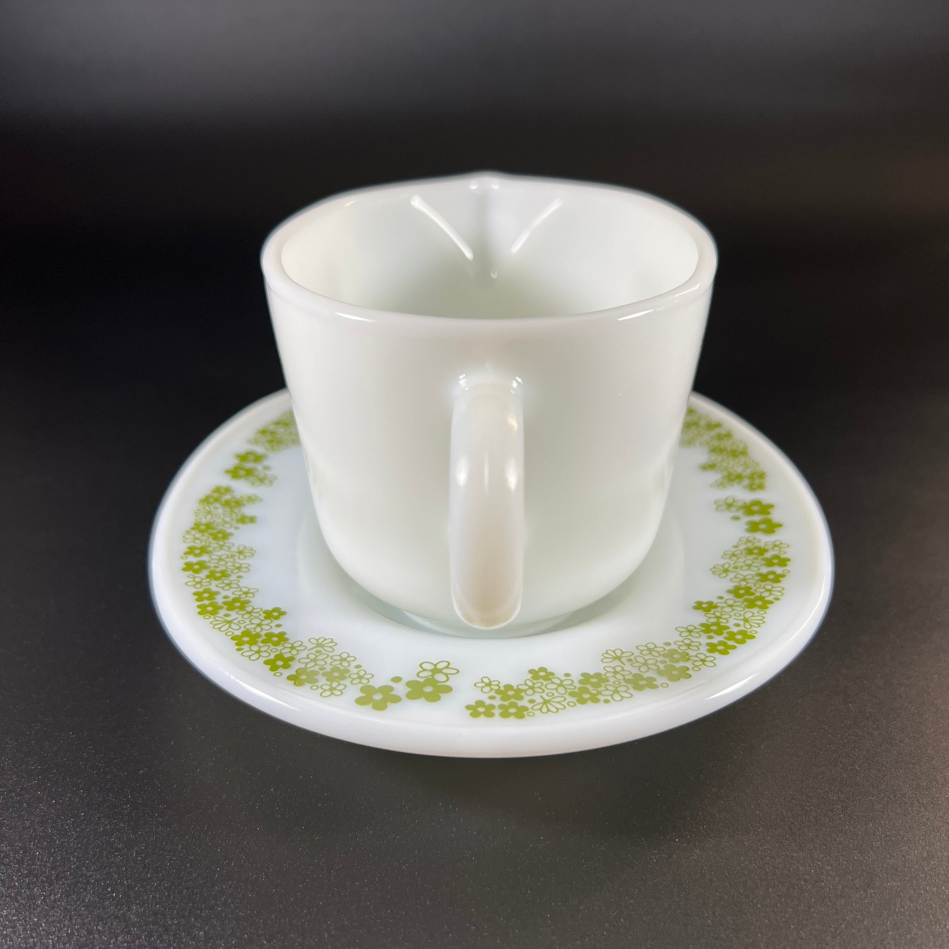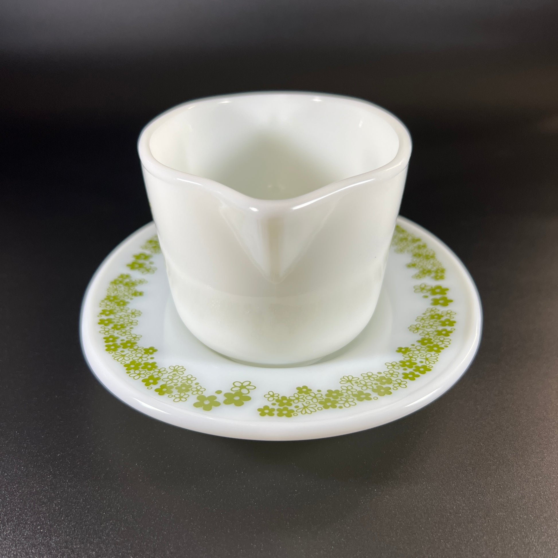 This vintage Pyrex Spring Blossom Green gravy boat—often referred to as the Crazy Daisy pattern—was produced from 1972 to 1978 and remains in excellent condition. There are no chips, cracks, or stains, and the piece shows no discoloration, indicating it was barely used.